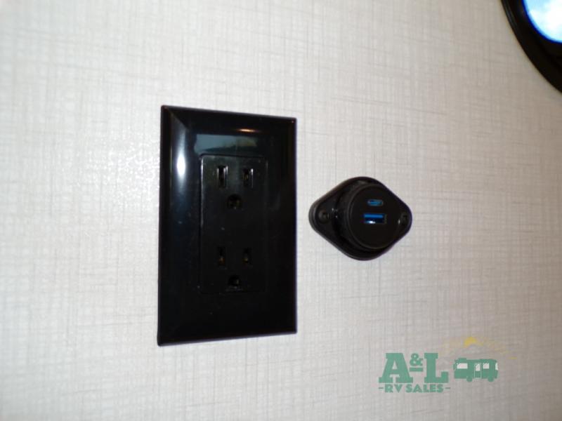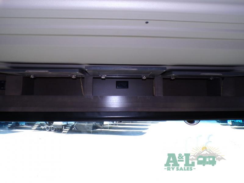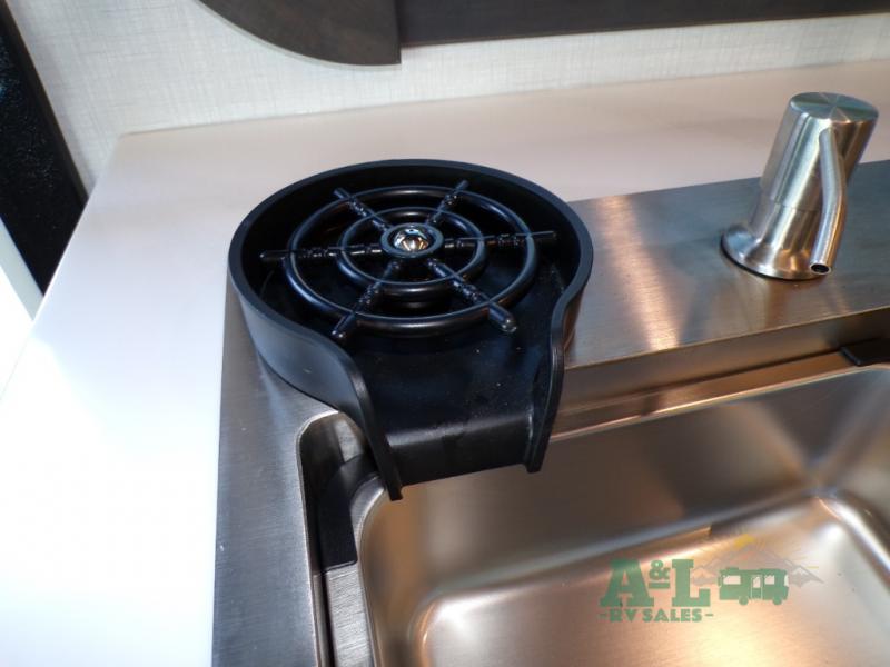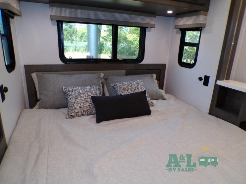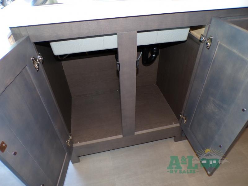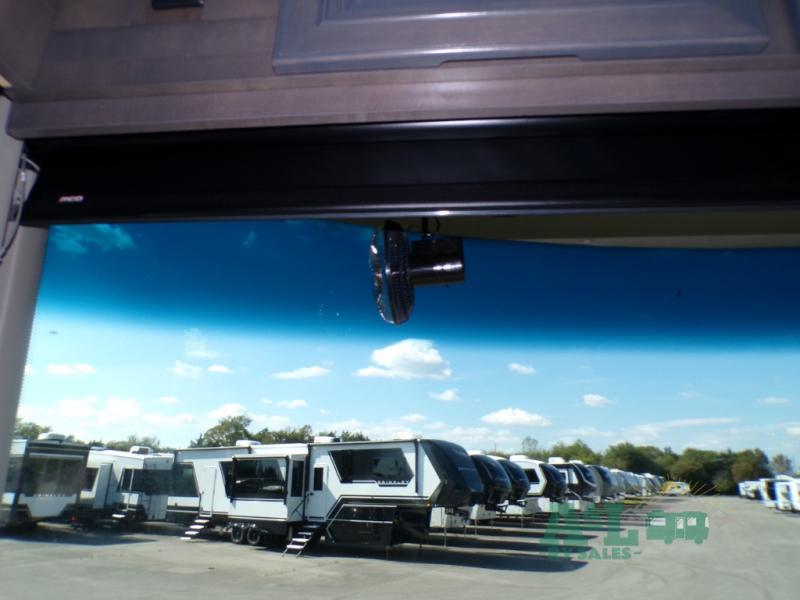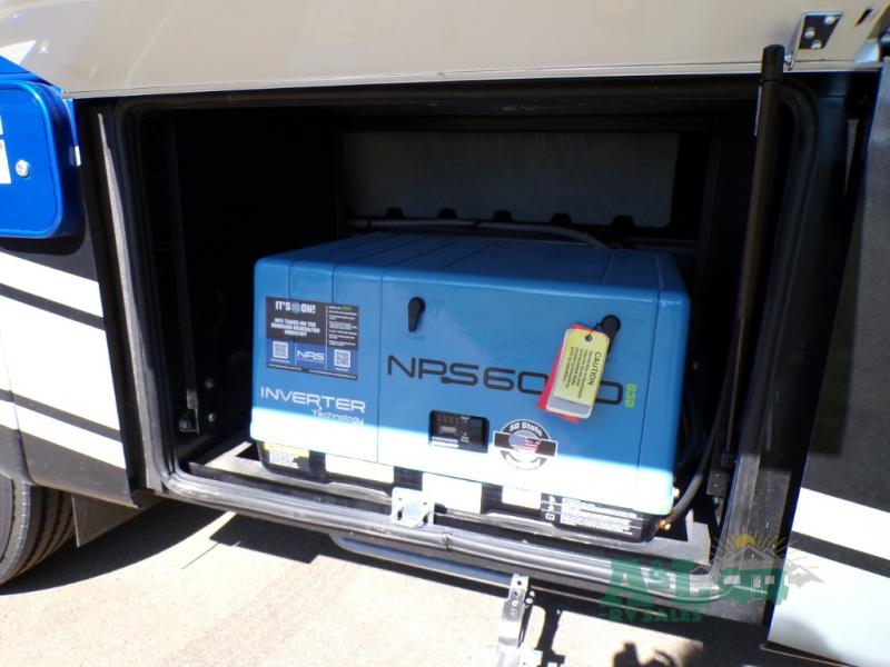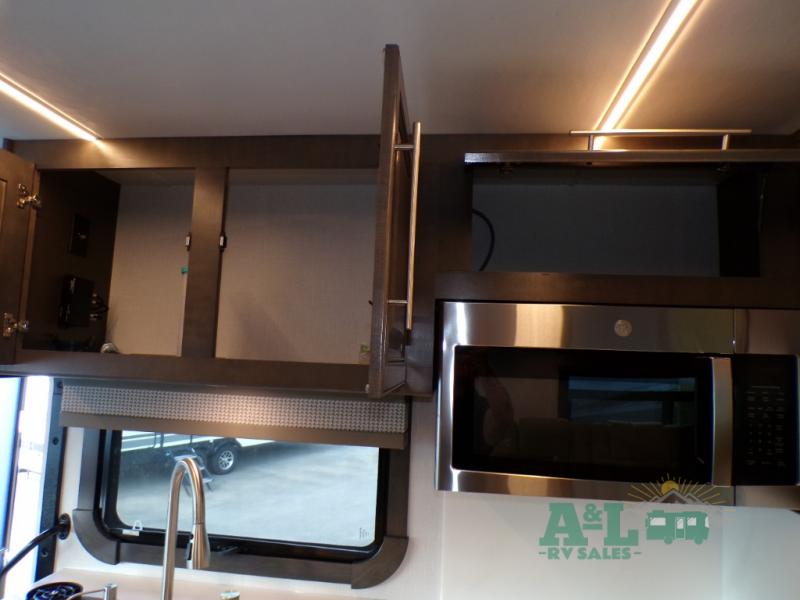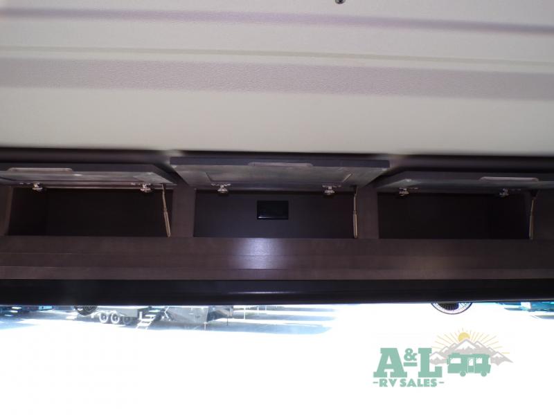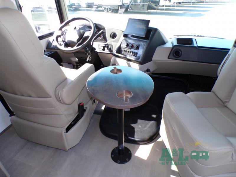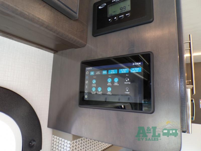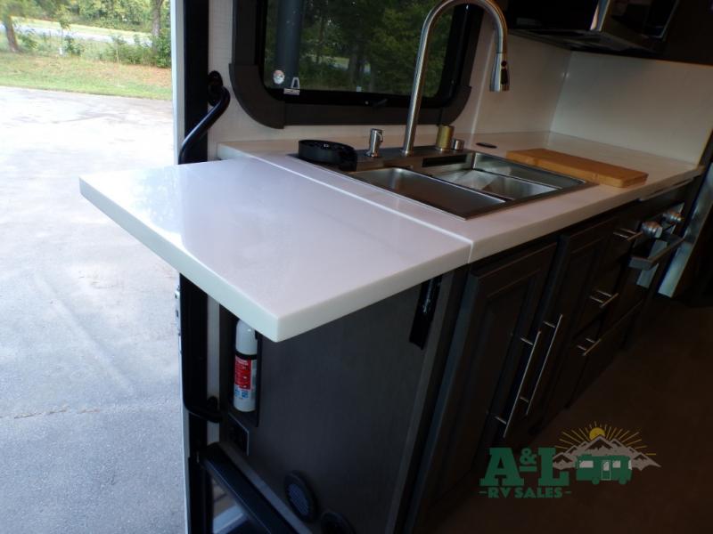 Comfort and convenience are found all throughout this motorhome! Starting with the full rear master bath that has a shower with a seat and a dual sink vanity, plus it leads into the private bedroom. Inside the bedroom is a 72" x 80" king bed slide with overhead cabinets across from a dresser with overhead cabinets and a 32" LED TV, a wardrobe, and another wardrobe that is prepped to add an optional stackable washer and dryer. The half bathroom is conveniently near the fully equipped kitchen so you can get back to creating your best home cooked meals fast. Relax in true comfort each night by either playing games at the booth dinette or on the theater seating that comes with power recline, heat, and massage!