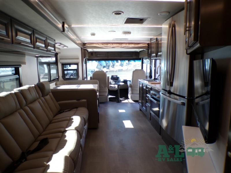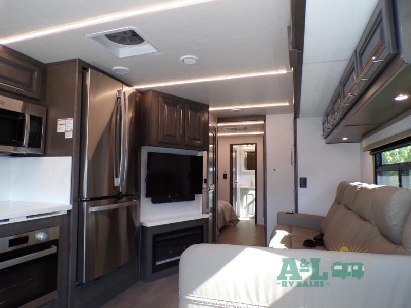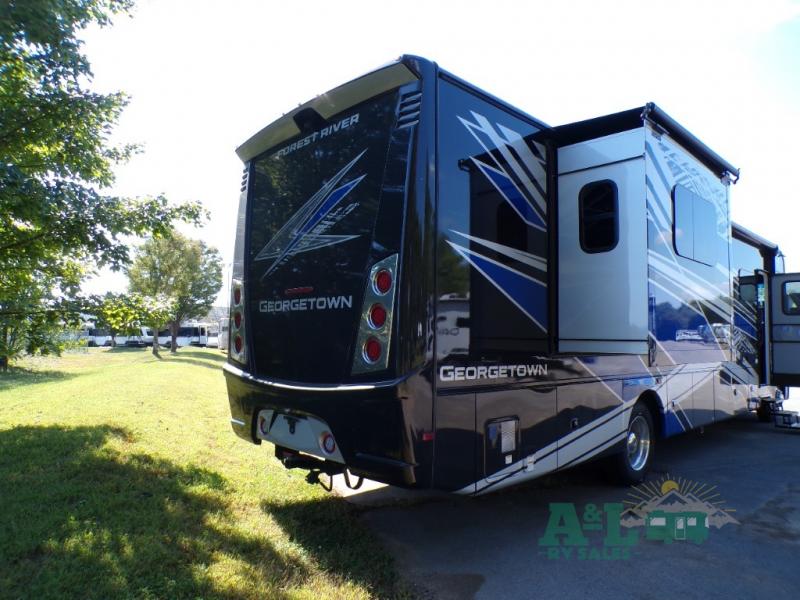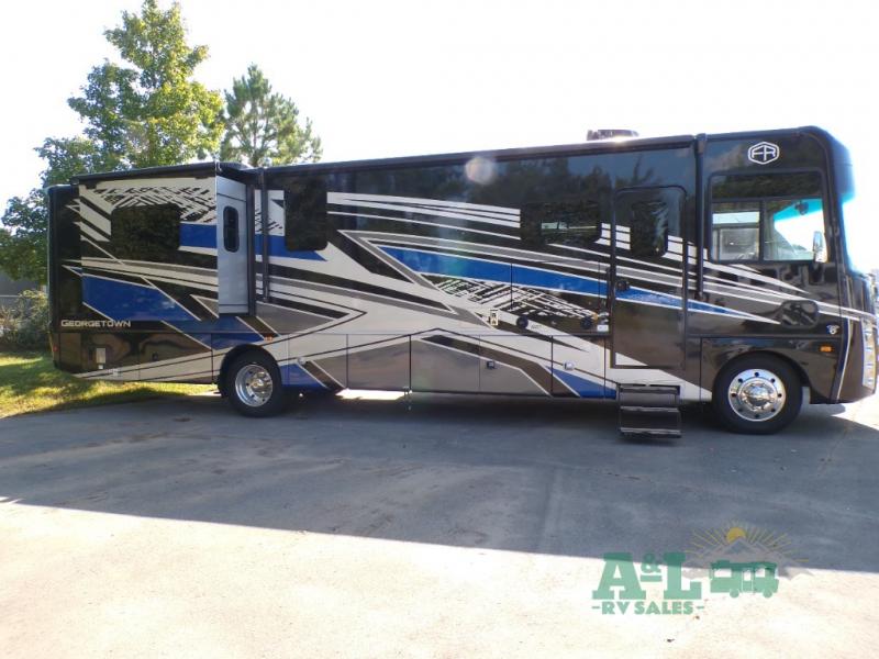 Start exploring your favorite destinations with one of these Forest River Georgetown 7 Series Class A gas motorhomes! Their solid surface kitchen countertops and stainless-steel appliances will have you feeling right at home. There are also day/night shades, wood trim around the windows, a clear glass shower door, and more interior comforts. The Arctic package lets you travel in harsher weather, and the automatic hydraulic 4-point leveling system will keep your unit leveled wherever you set up. The construction consists of aluminum framed vacuum bonded floors and gel coated sidewalls, a crowned roof, and high-density block foam insulation built to support adventures in both warm and cooler months! The drive will be just as enjoyable as the destination with swivel driver's seats, a custom cockpit soft touch dash, and a Sony 10" entertainment system!
