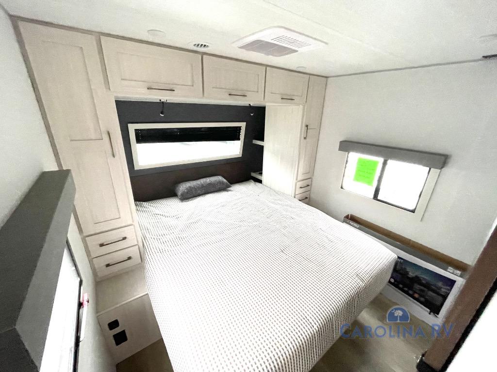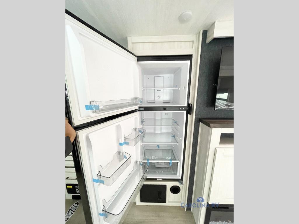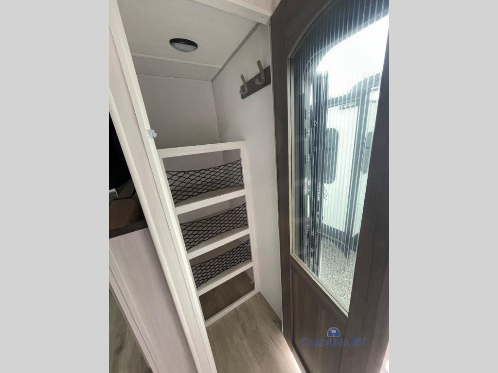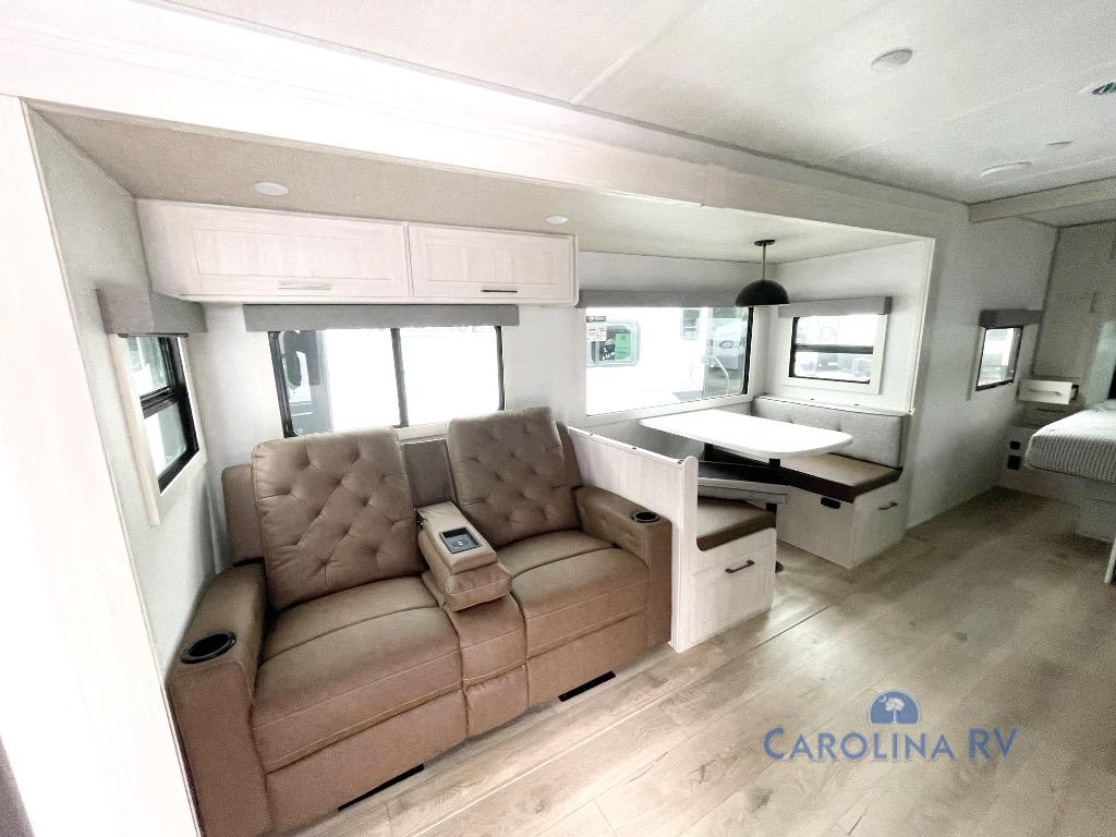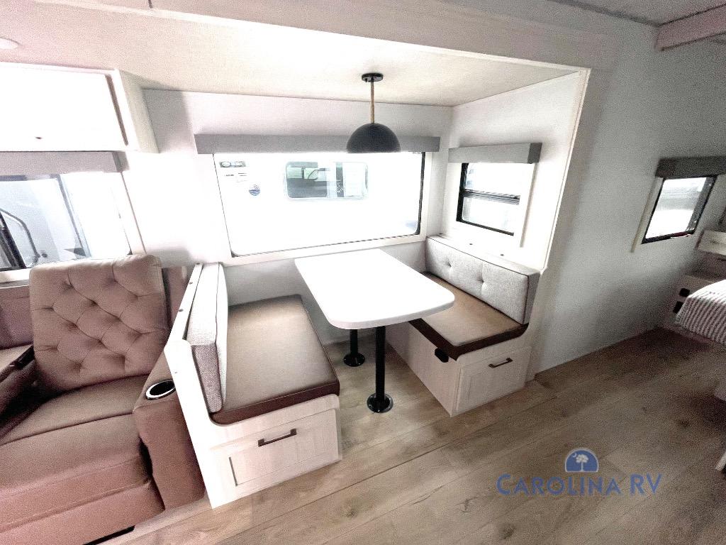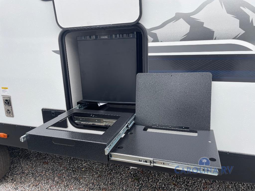 No need to rough it when you camp; this trailer offers amenities that allow you to "Glamp" if you want! The rear spacious bathroom is tucked away behind a beautiful barn door, and inside features a shower, wardrobe, and linen storage. The front master bedroom offers privacy, a walk-around custom king bed, dual wardrobes and underbed storage, plus TV prep if you want the option to watch movies in bed. The L-shaped counter in the kitchen provides enough space to have everything at your fingertips while you cook, plus there is a countertop extension for more prep and serving space if needed. A nice walk-in pantry just inside the entry door will be perfect for chips and snacks or canned goods for those longer camping trips. If dining inside, the booth dinette with pull-out dinette drawers will be comfortable plus you will enjoy the view provided by the panoramic windows within the slide out. An outside kitchen will be a favorite for anyone that cooks, and the 19' awning will provide some protection from the elements and offering an outdoor living area to enjoy with everyone.