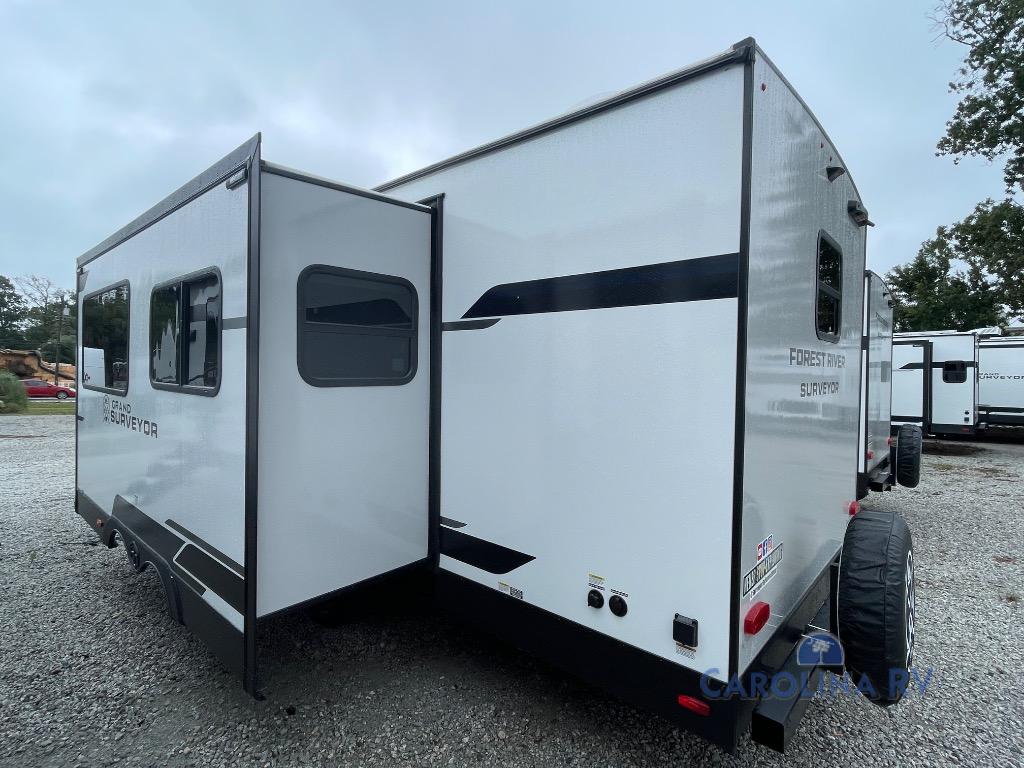 With any Grand Surveyor travel trailer by Forest River you will enjoy turn-key ready-to-go features and quality construction! Each model includes Azdel composite walls and a gel coated fiberglass front cap with an automotive style tinted windshield for a sleek look. There are friction hinge black glass entry door(s), an adjustable platform step with a night light, plus Goodyear tires and a power tongue jack for easy towing. The interior will have you feeling right at home with roller shades, residential faucets, sinks, and bathroom vanity, plus Surf(x) seamless countertops throughout. You can also plan for adventure with a 2" rear accessory and exterior spray port, and there are slam latch exterior baggage doors throughout to keep all your gear secure. Other stand-out features include a central vacuum system, a 200 watt solar panel with a 30 amp controller, a tankless water heater, carpet-free interiors, and the list goes on!