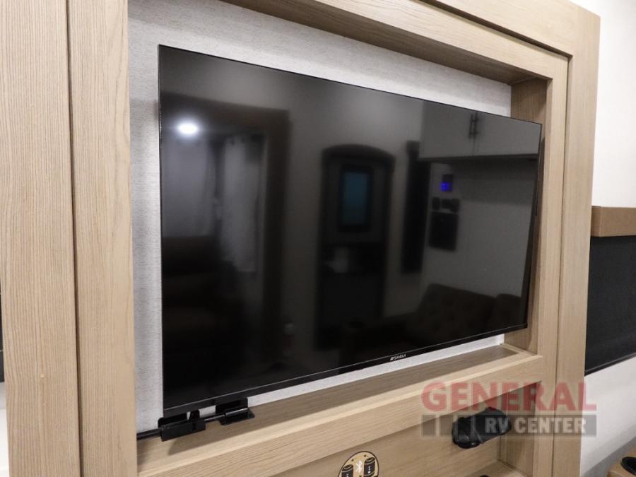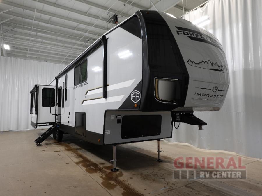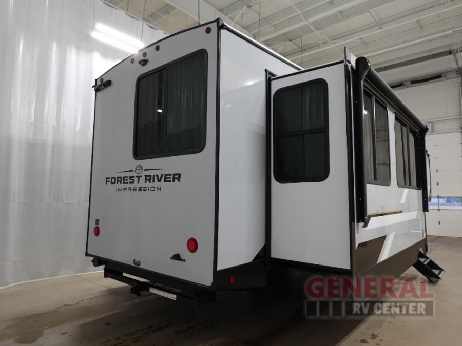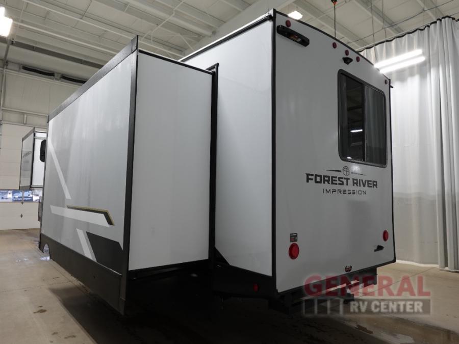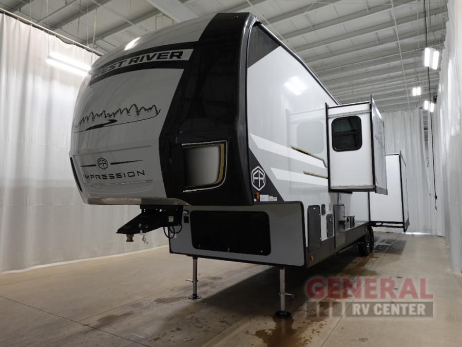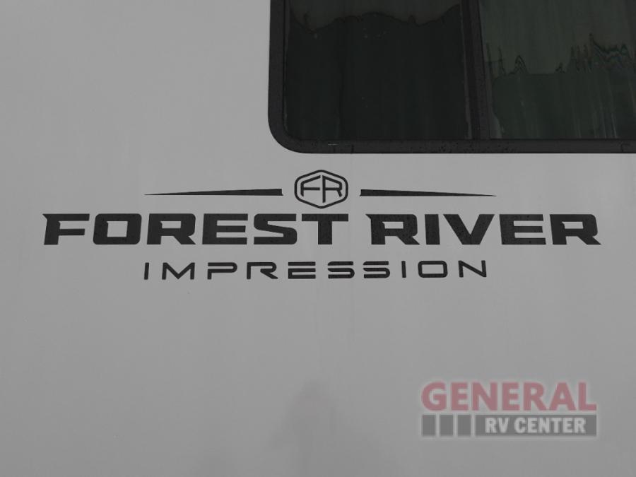 With any Impression mid-profile fifth wheel by Forest River, the focus of the design is comfort and value, built with quality craftsmanship and attention to customer's desires in each Impression! The exterior includes upgraded E-rated tires, custom exterior graphics package, and insulated slam latch baggage doors. There is also an enclosed docking station, an outside shower, and a 100W roof solar panel for off-grid capabilities. The fully heated and enclosed AccessiBelly has removable underbelly panels and offers four seasons of travel, and there is an industry leading 15K A/C plus 35K BTU furnace to keep you comfortable. The interior has lumbercore cabinetry, residential linoleum, residential backsplash in the kitchen, and oversized opening windows in the living area for more natural lighting and good air flow.