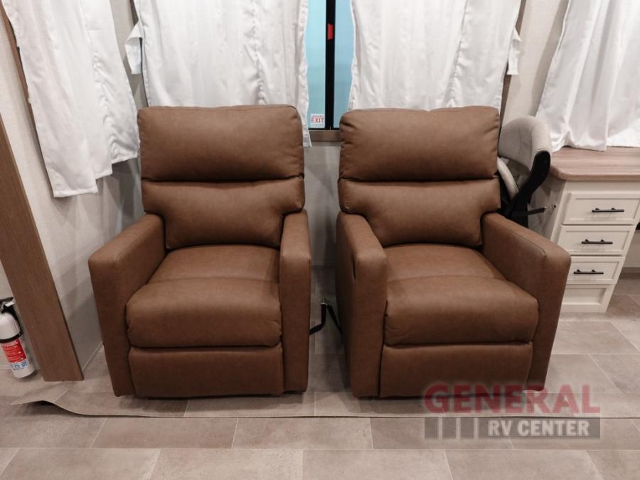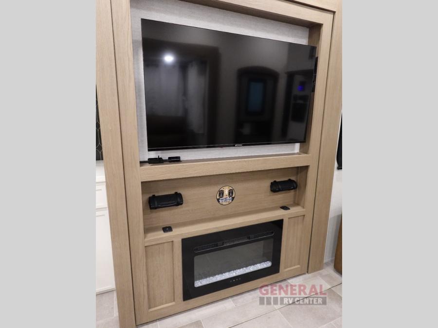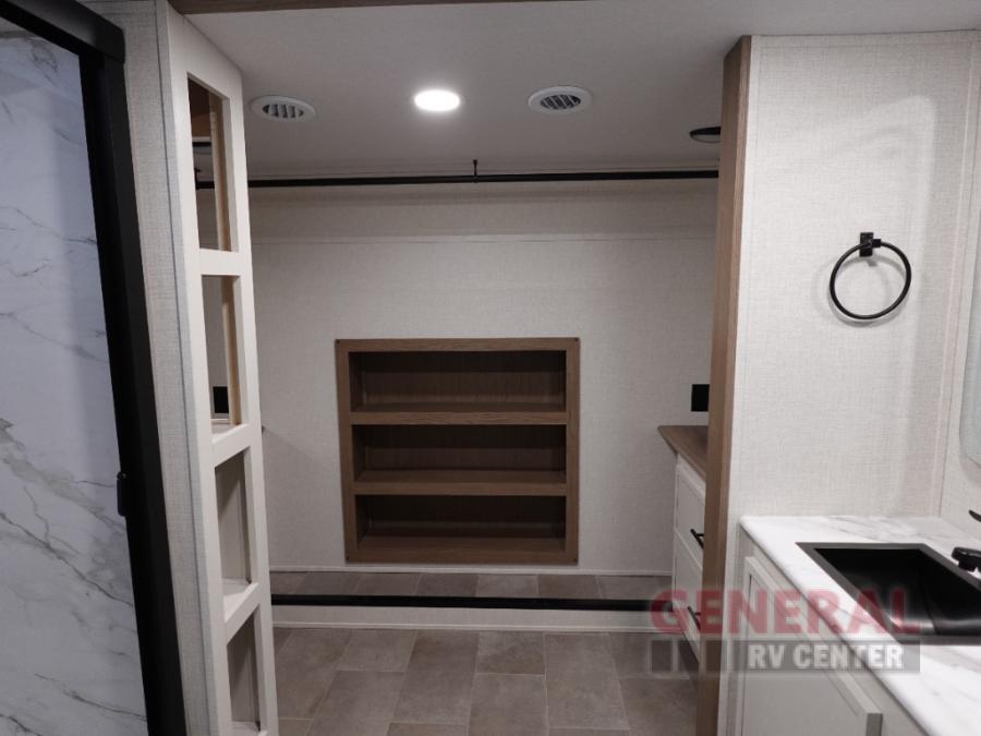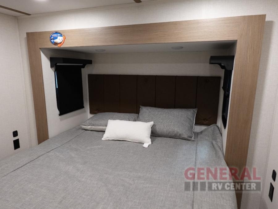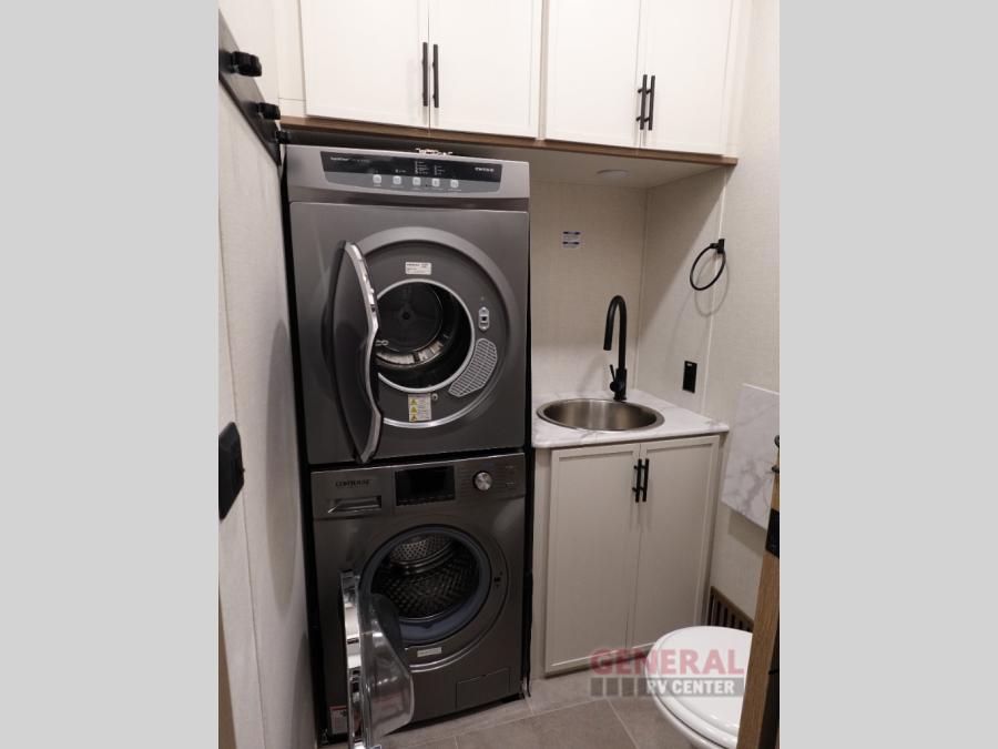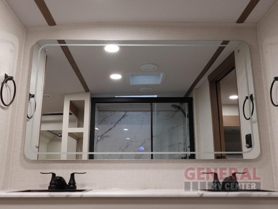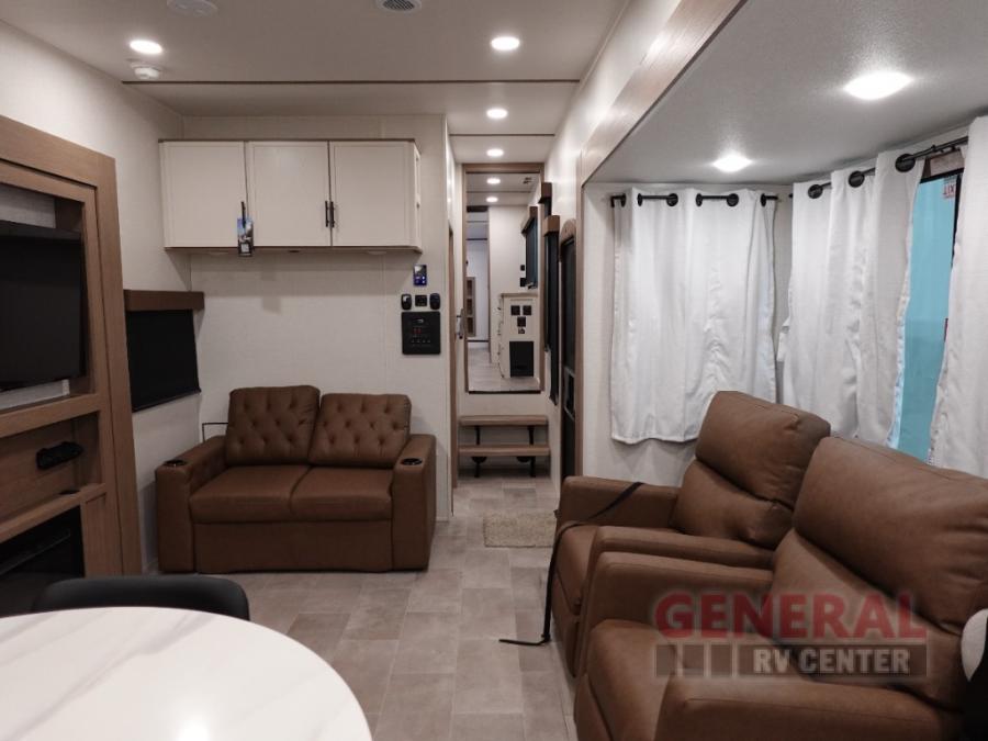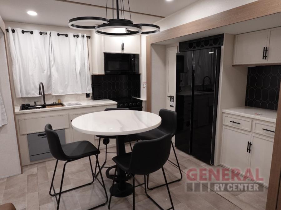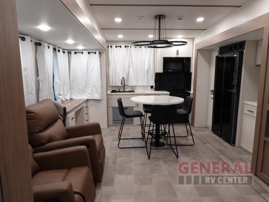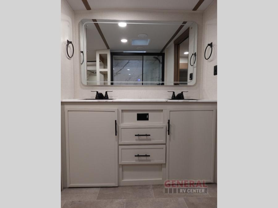It's easy to see why this fifth wheel was voted Best New Model for 2025 by RV Pro! There are many residential features, such as a middle table with four seats, dual recliners, a desk to get some work done, and a master bedroom you are sure to love. You'll find a king bed with Versa Tilt technology, a dresser, and TV prep. A front master bath includes a walk-in shower with a skylight, dual bath sinks with a back-lit mirror, and a closet with shelves. The middle mud room includes washer/dryer prep, counter space and a pull-out drying rack to hang up swim clothes, towels, and more. Everyone will enjoy spending time in the main living room that includes dual opposing slides, a tri-fold sofa, and an entertainment center with hidden storage behind. And the chef of your group will love the rear kitchen with its 16 cu. ft. 12V refrigerator and pantry, an oven, and plenty of counter space. Head outdoors to enjoy the two power awnings in the evening!
