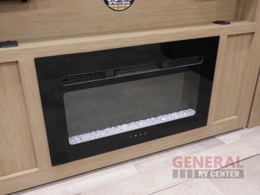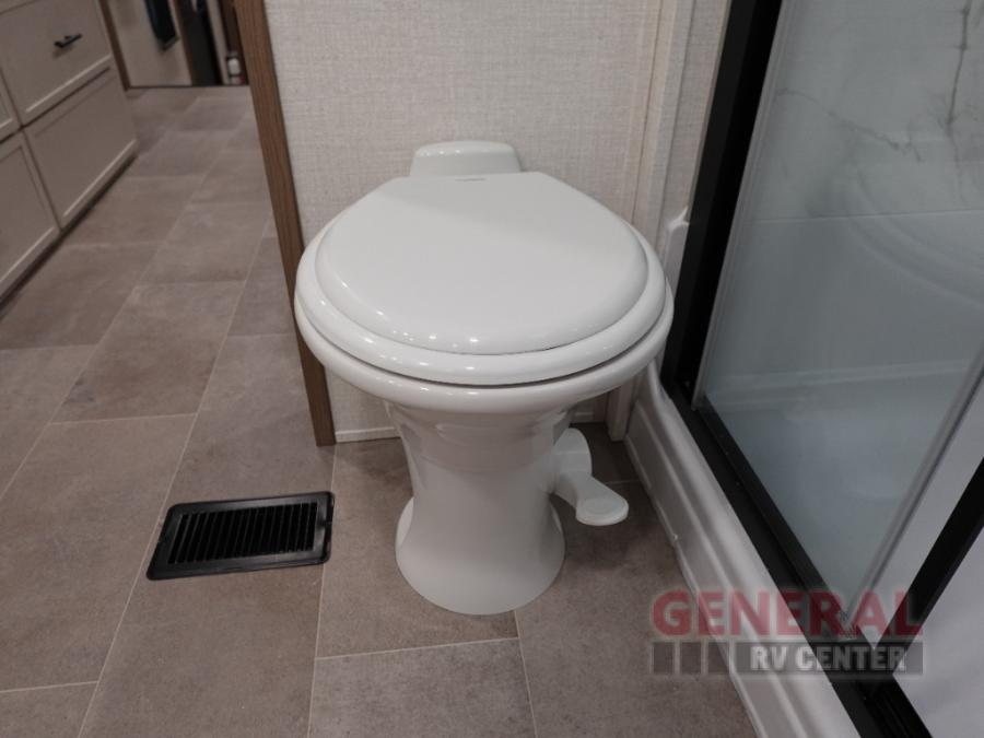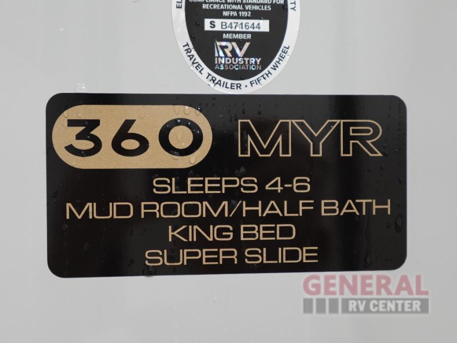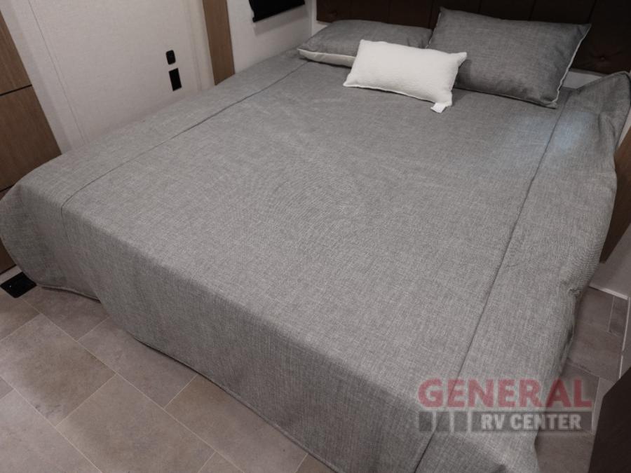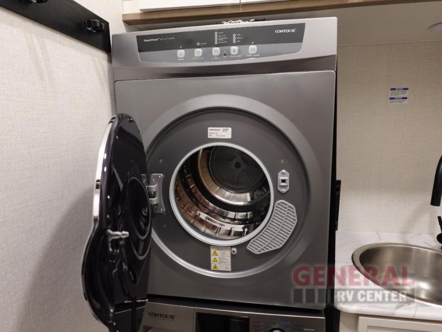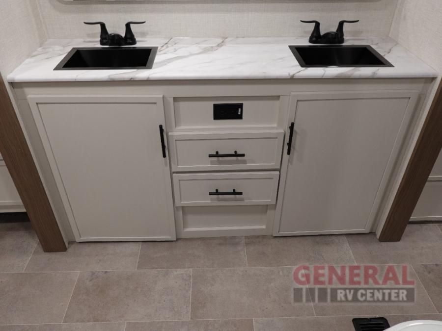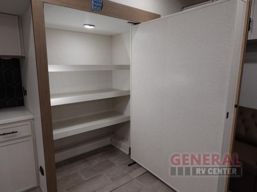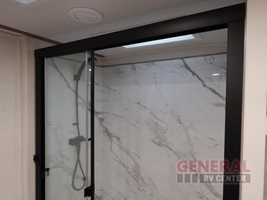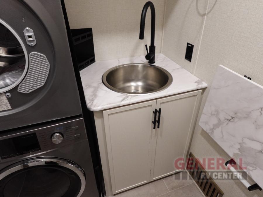 It's easy to see why this fifth wheel was voted Best New Model for 2025 by RV Pro! There are many residential features, such as a middle table with four seats, dual recliners, a desk to get some work done, and a master bedroom you are sure to love. You'll find a king bed with Versa Tilt technology, a dresser, and TV prep. A front master bath includes a walk-in shower with a skylight, dual bath sinks with a back-lit mirror, and a closet with shelves. The middle mud room includes washer/dryer prep, counter space and a pull-out drying rack to hang up swim clothes, towels, and more. Everyone will enjoy spending time in the main living room that includes dual opposing slides, a tri-fold sofa, and an entertainment center with hidden storage behind. And the chef of your group will love the rear kitchen with its 16 cu. ft. 12V refrigerator and pantry, an oven, and plenty of counter space. Head outdoors to enjoy the two power awnings in the evening!