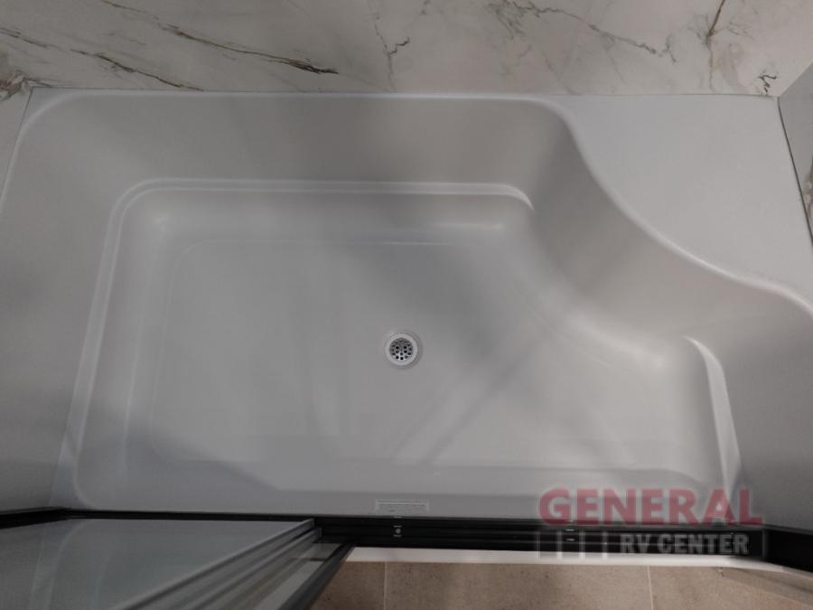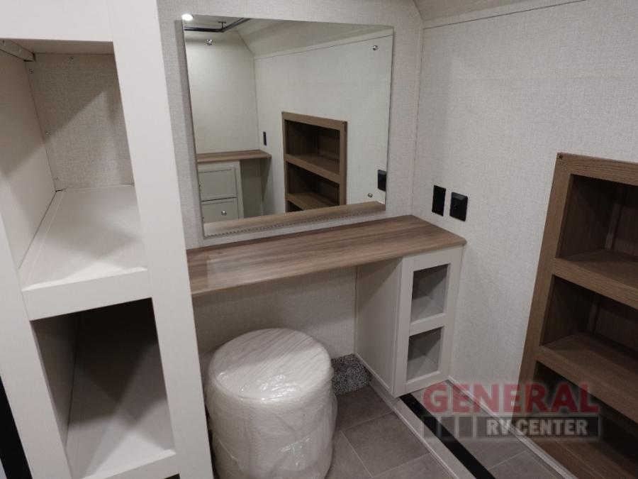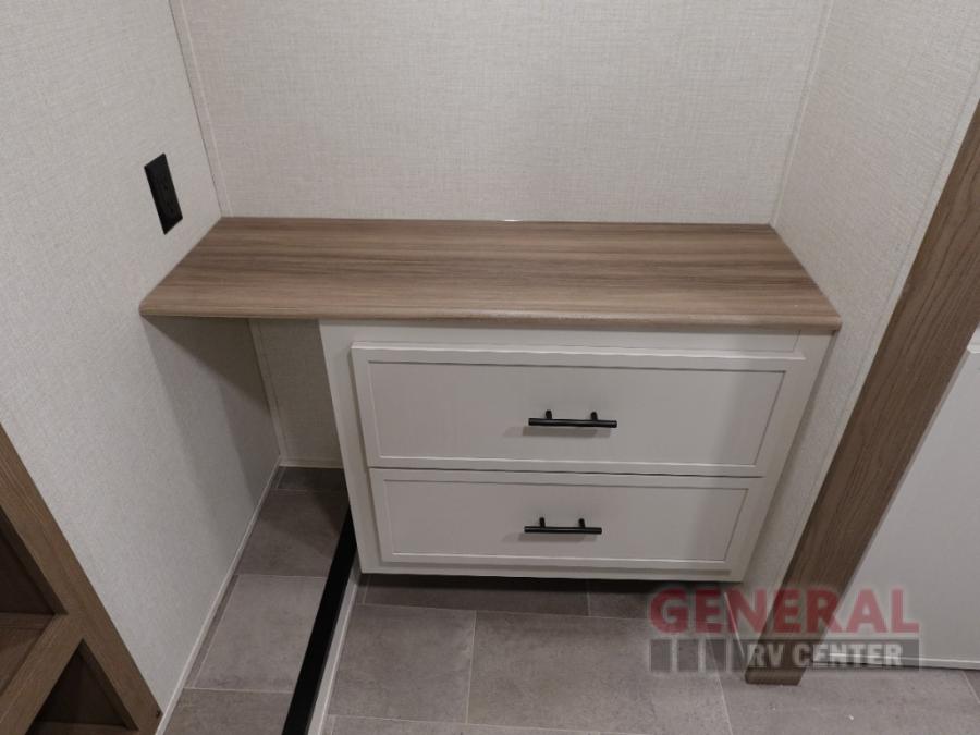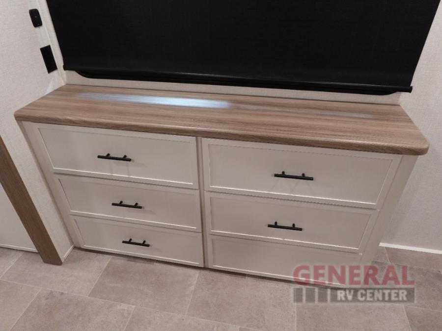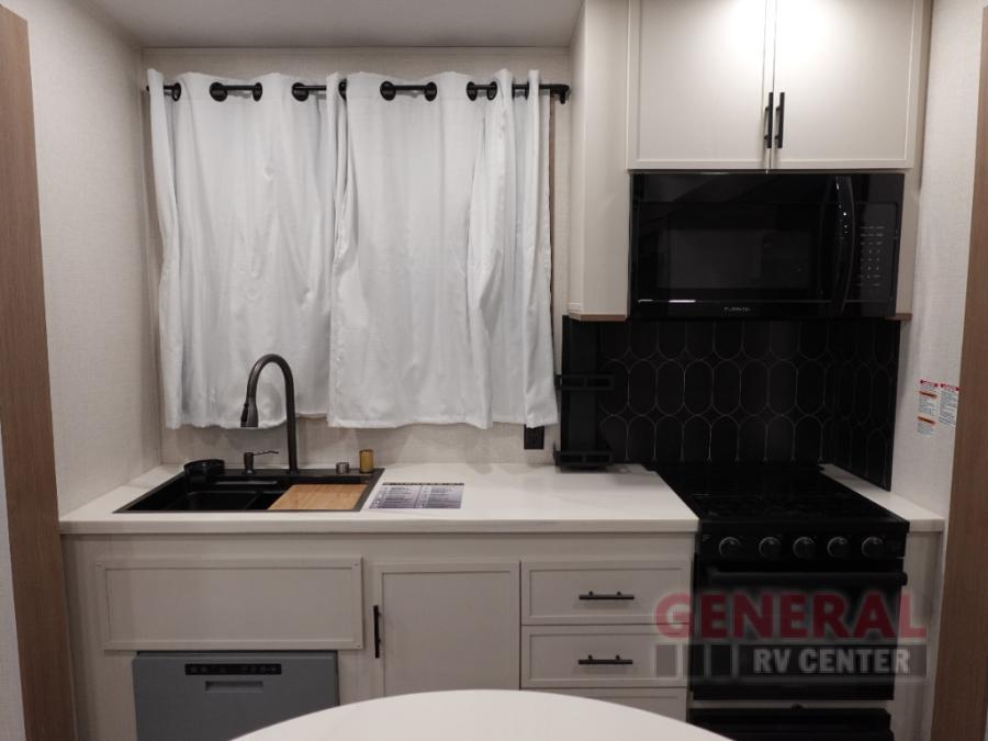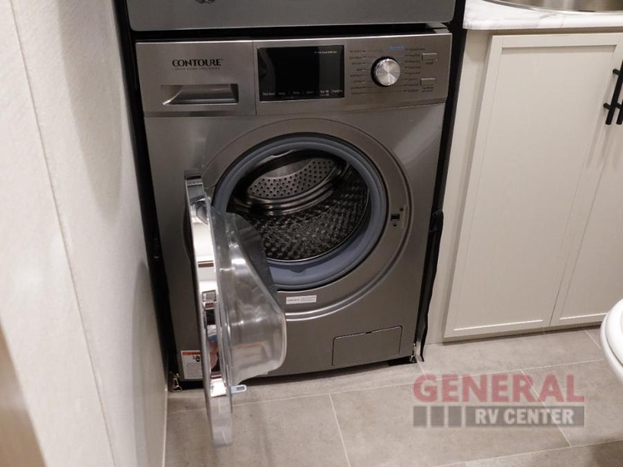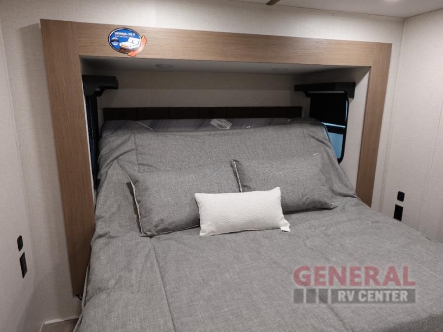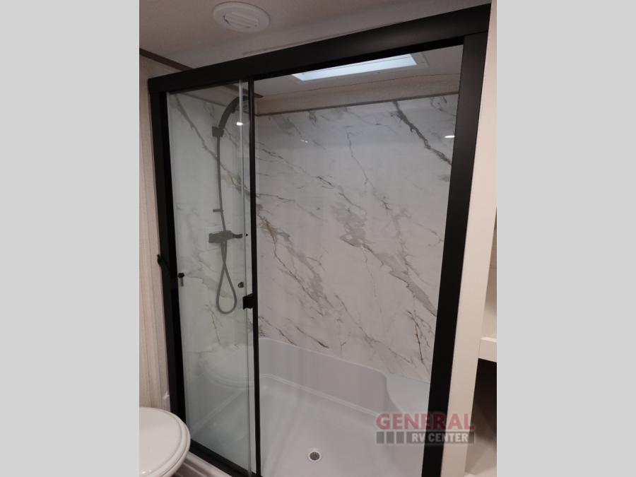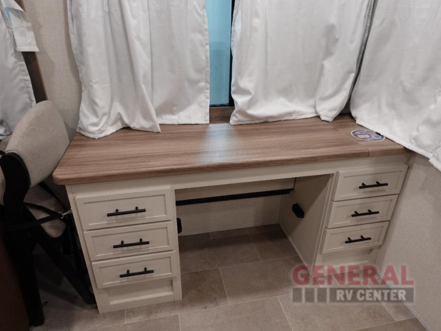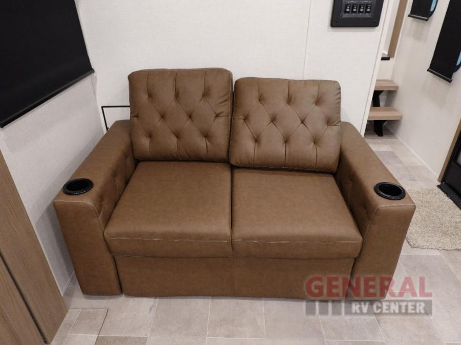 It's easy to see why this fifth wheel was voted Best New Model for 2025 by RV Pro! There are many residential features, such as a middle table with four seats, dual recliners, a desk to get some work done, and a master bedroom you are sure to love. You'll find a king bed with Versa Tilt technology, a dresser, and TV prep. A front master bath includes a walk-in shower with a skylight, dual bath sinks with a back-lit mirror, and a closet with shelves. The middle mud room includes washer/dryer prep, counter space and a pull-out drying rack to hang up swim clothes, towels, and more. Everyone will enjoy spending time in the main living room that includes dual opposing slides, a tri-fold sofa, and an entertainment center with hidden storage behind. And the chef of your group will love the rear kitchen with its 16 cu. ft. 12V refrigerator and pantry, an oven, and plenty of counter space. Head outdoors to enjoy the two power awnings in the evening!