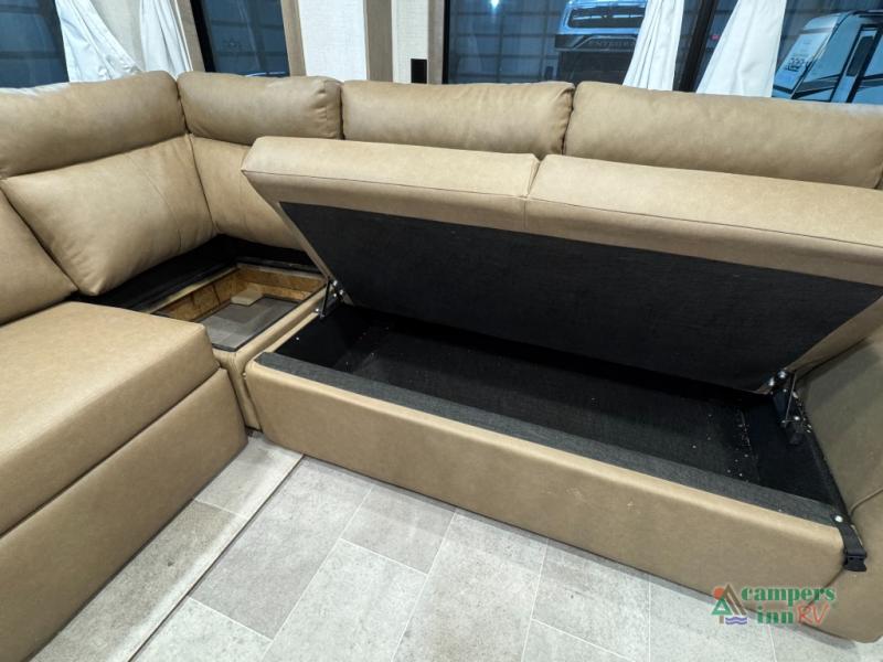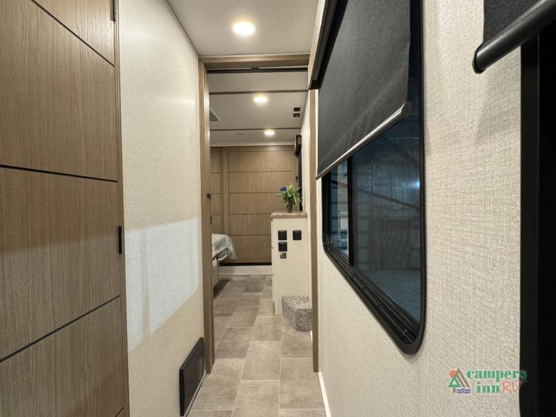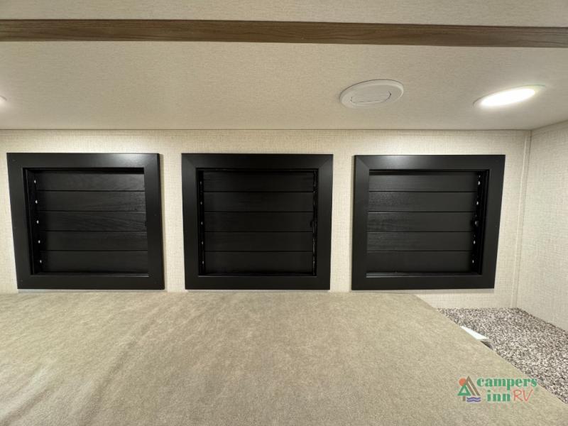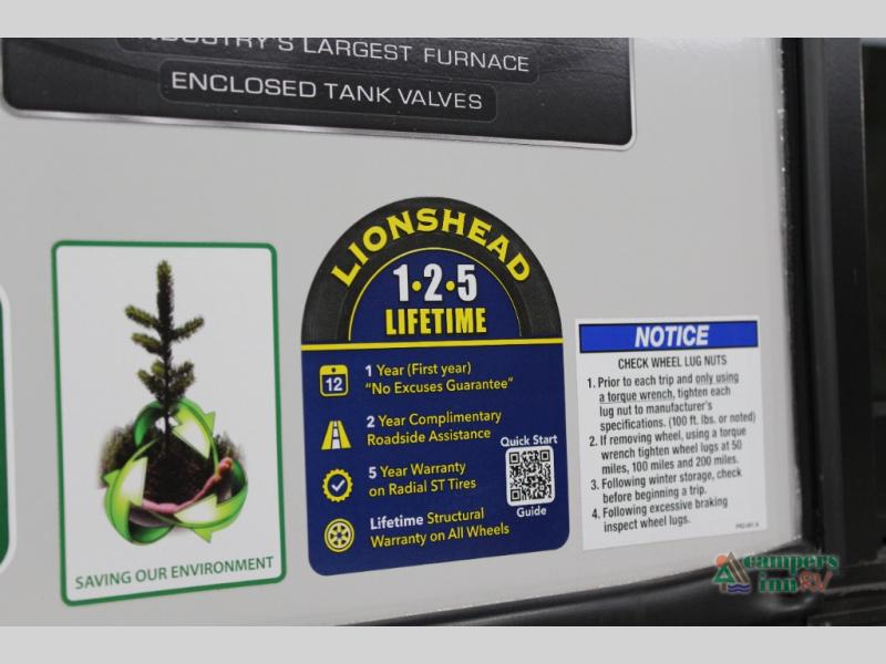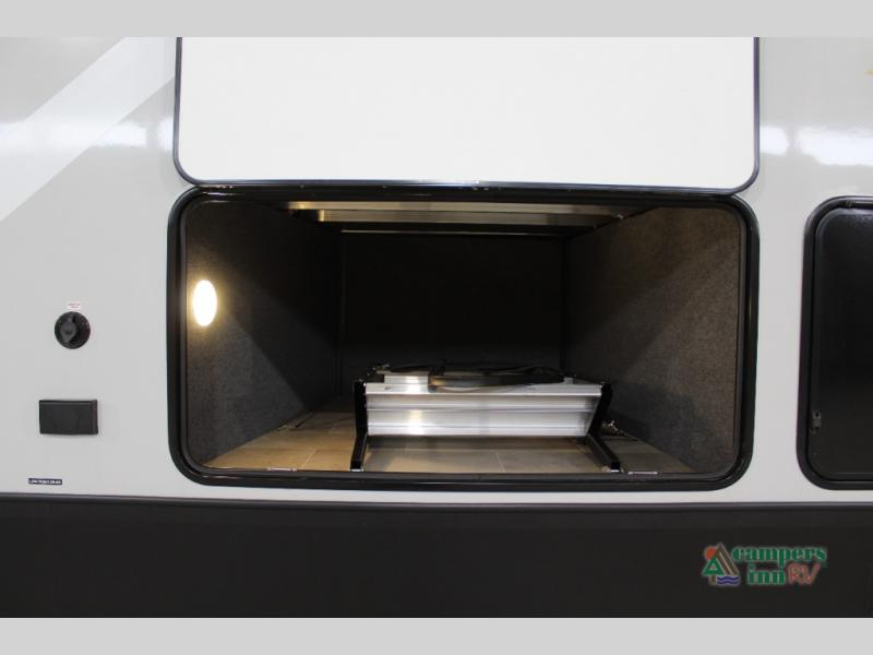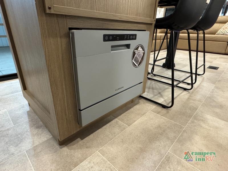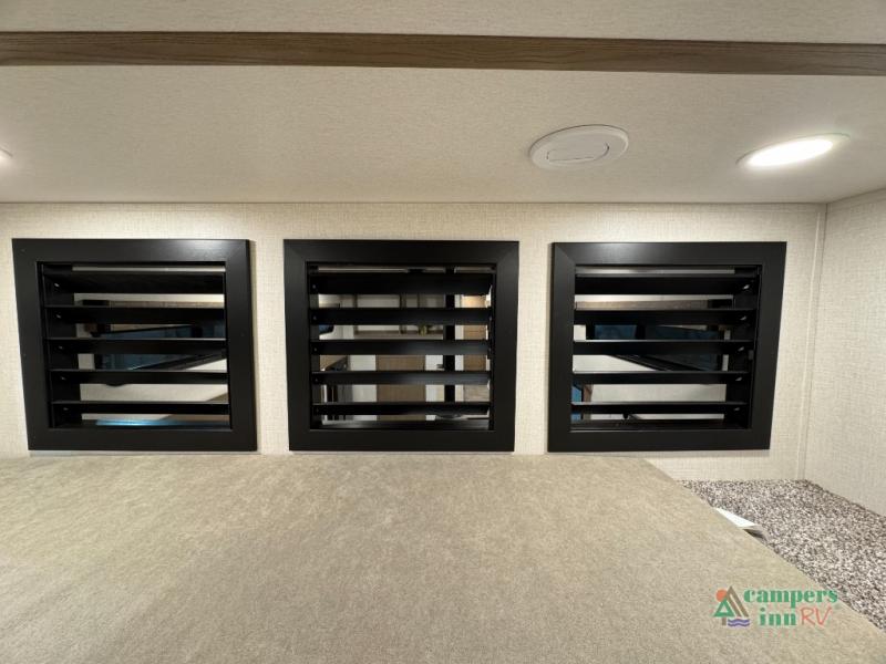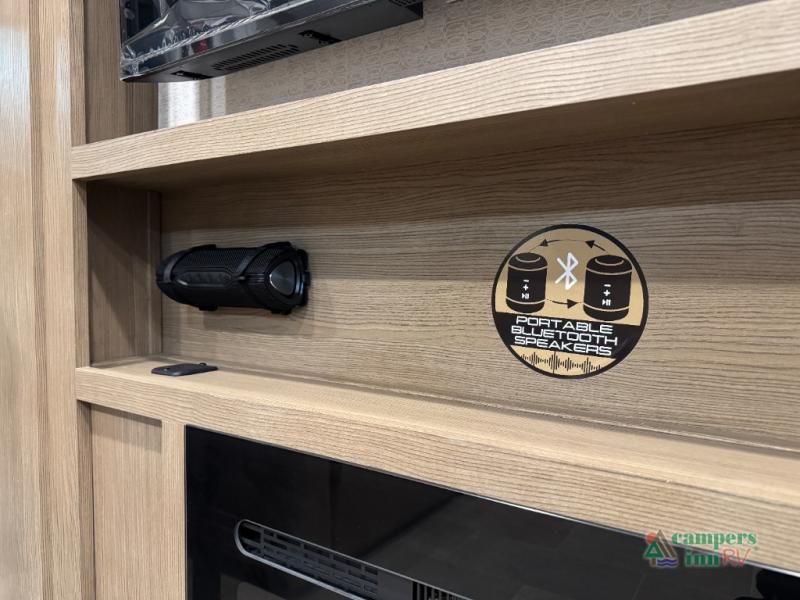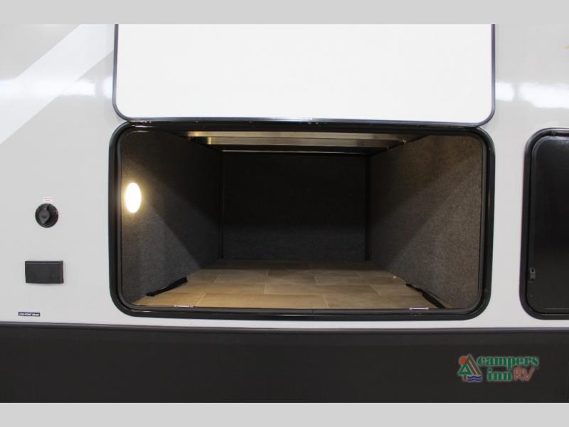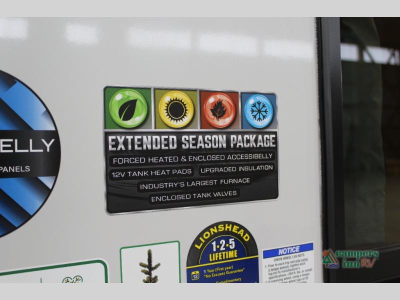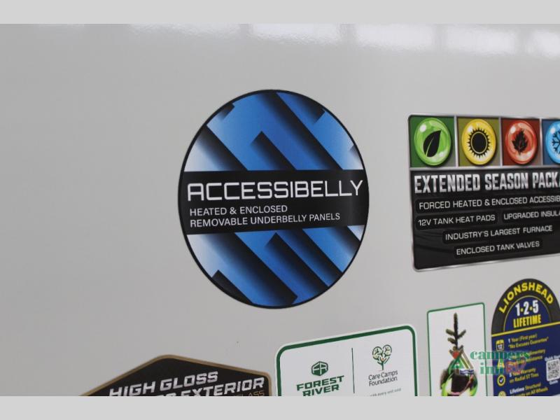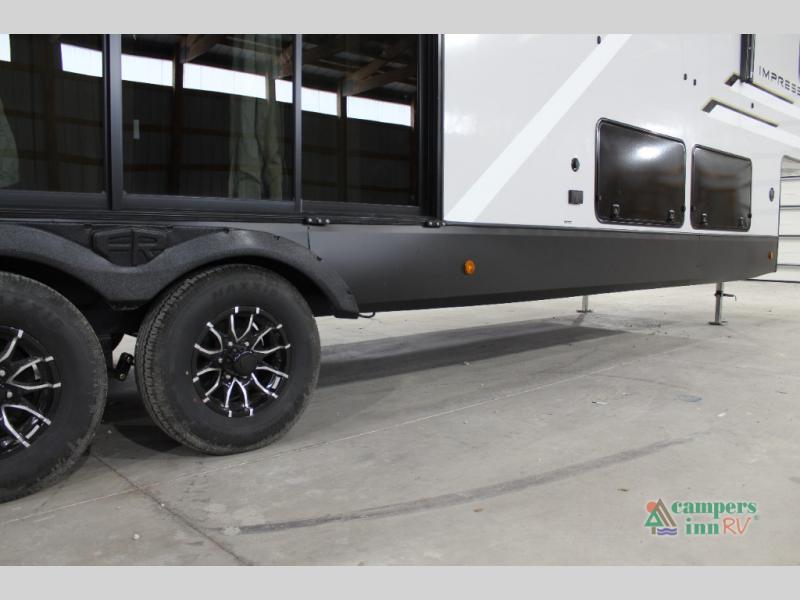 With any Impression fifth wheel by Forest River, the focus of the design is comfort and value, built with quality craftsmanship and attention to customer's desires in each Impression! The exterior includes upgraded E-rated tires, custom exterior graphics package, and insulated slam latch baggage doors. There is also an enclosed docking station, an outside shower, and a 100W roof panel for off-grid capabilities. The fully heated and enclosed AccessiBelly has removable underbelly panels along with enclosed tank valves. There is an industry leading 15K A/C plus 35K BTU furnace to keep you comfortable. The interior has lumbercore cabinetry, residential linoleum, residential backsplash in the kitchen, and oversized opening windows in the living area for more natural lighting and good air flow.