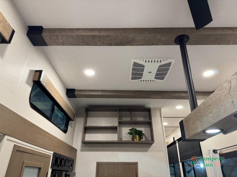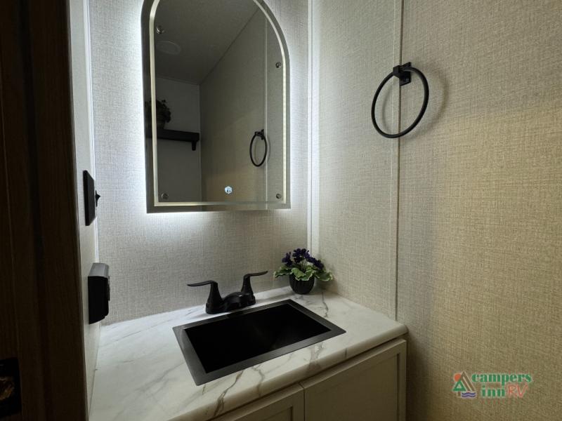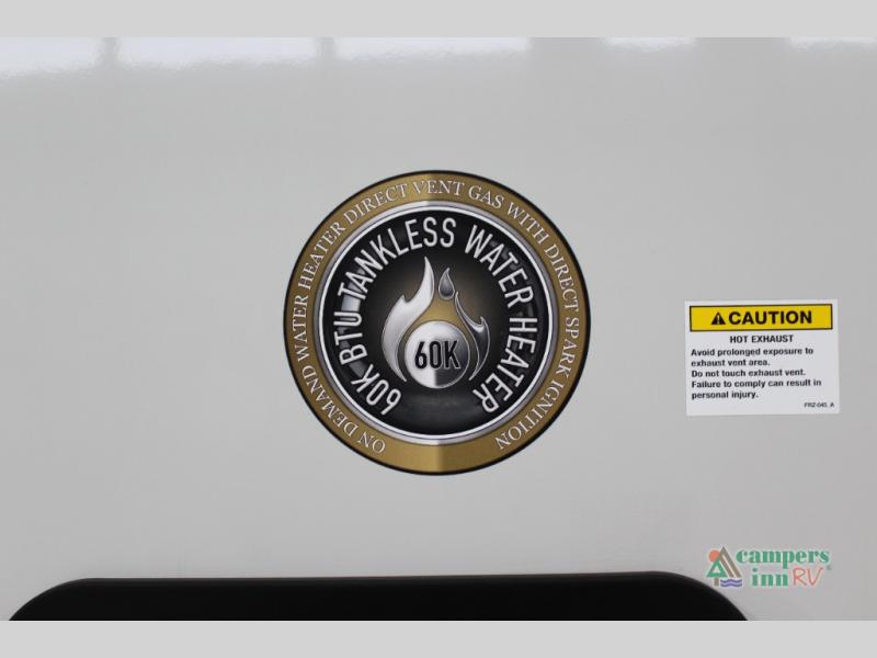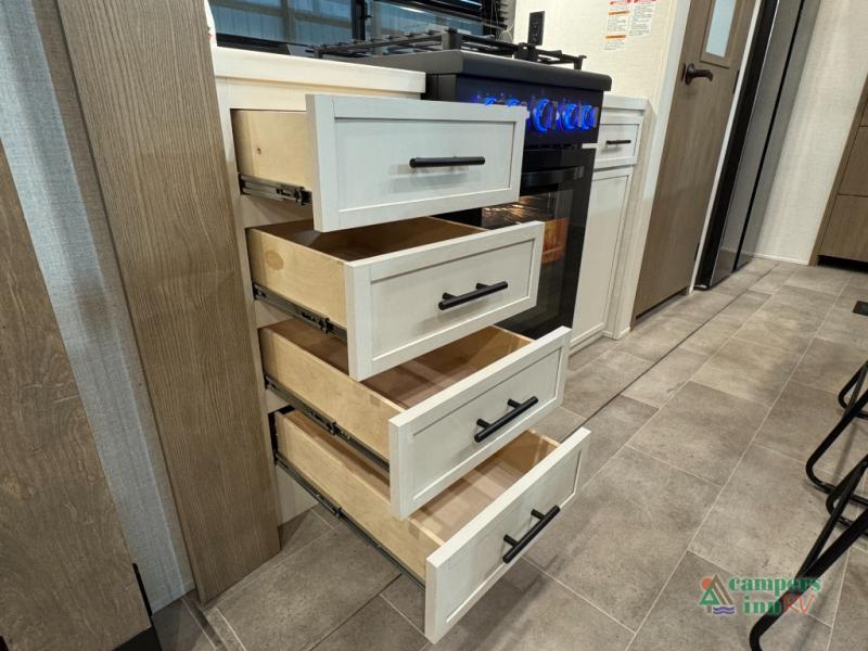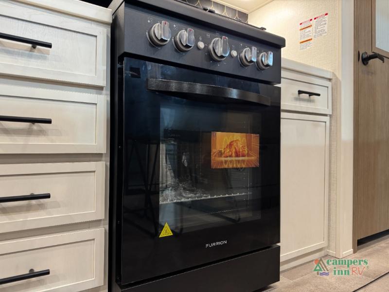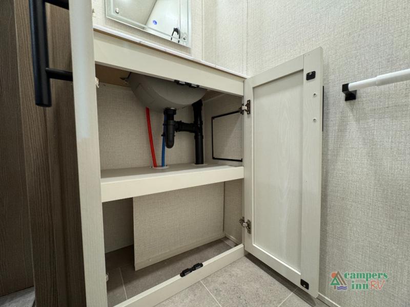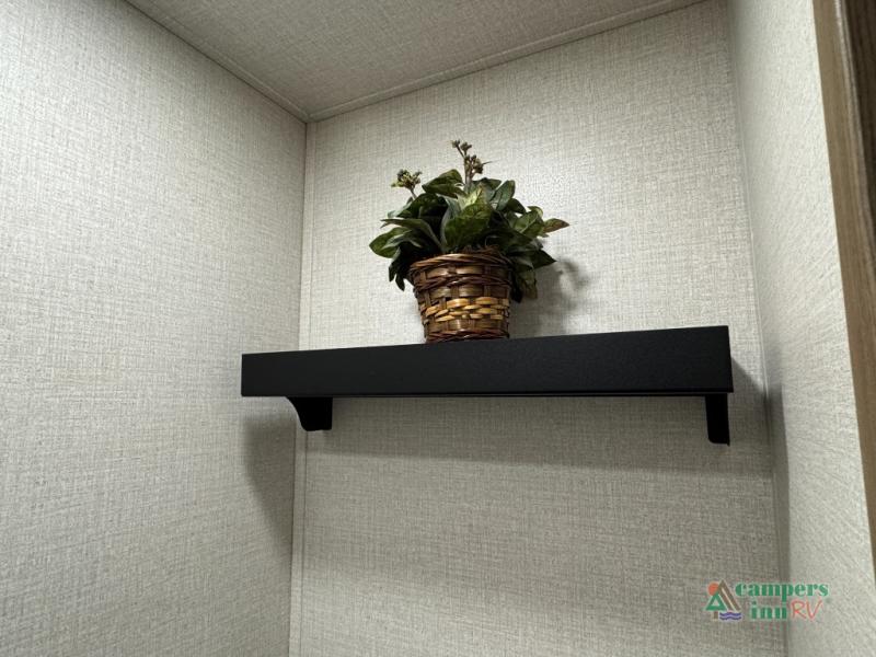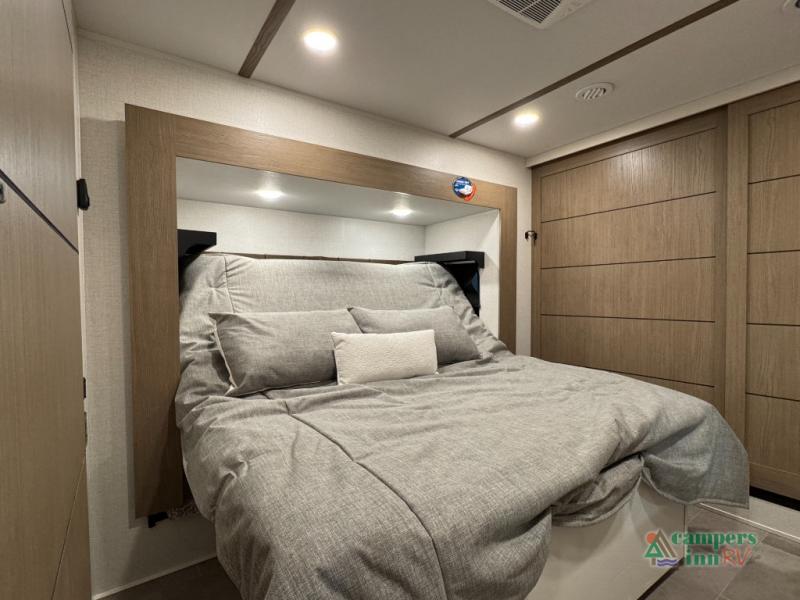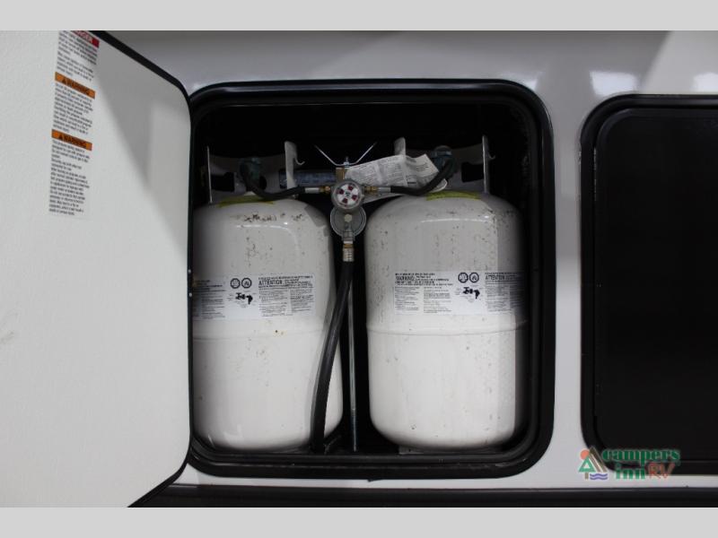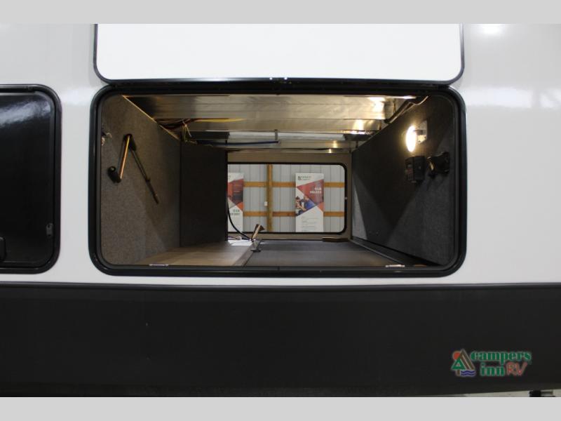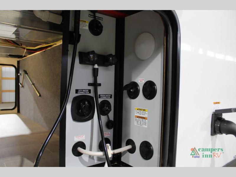 With any Impression fifth wheel by Forest River, the focus of the design is comfort and value, built with quality craftsmanship and attention to customer's desires in each Impression! The exterior includes upgraded E-rated tires, custom exterior graphics package, and insulated slam latch baggage doors. There is also an enclosed docking station, an outside shower, and a 100W roof panel for off-grid capabilities. The fully heated and enclosed AccessiBelly has removable underbelly panels along with enclosed tank valves. There is an industry leading 15K A/C plus 35K BTU furnace to keep you comfortable. The interior has lumbercore cabinetry, residential linoleum, residential backsplash in the kitchen, and oversized opening windows in the living area for more natural lighting and good air flow.