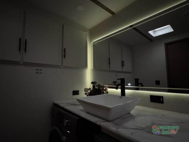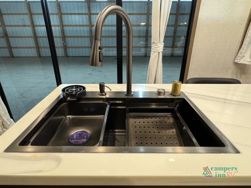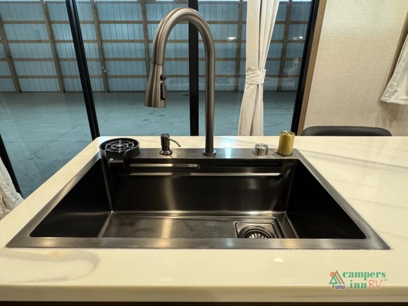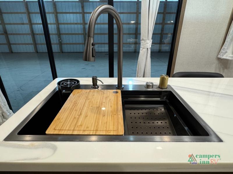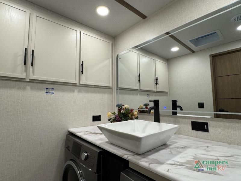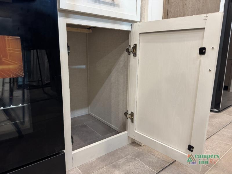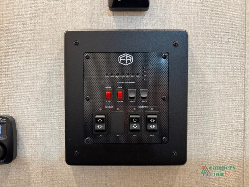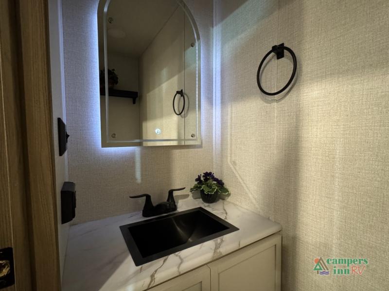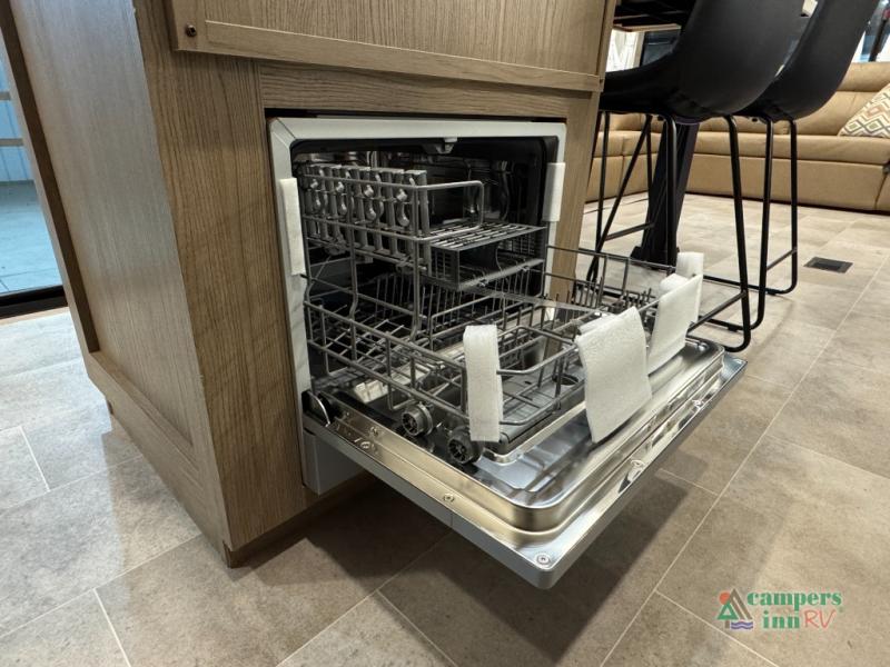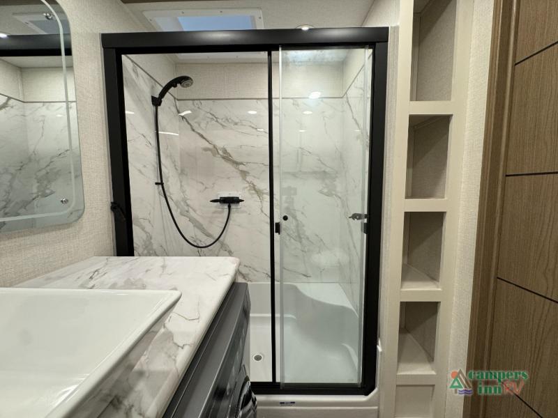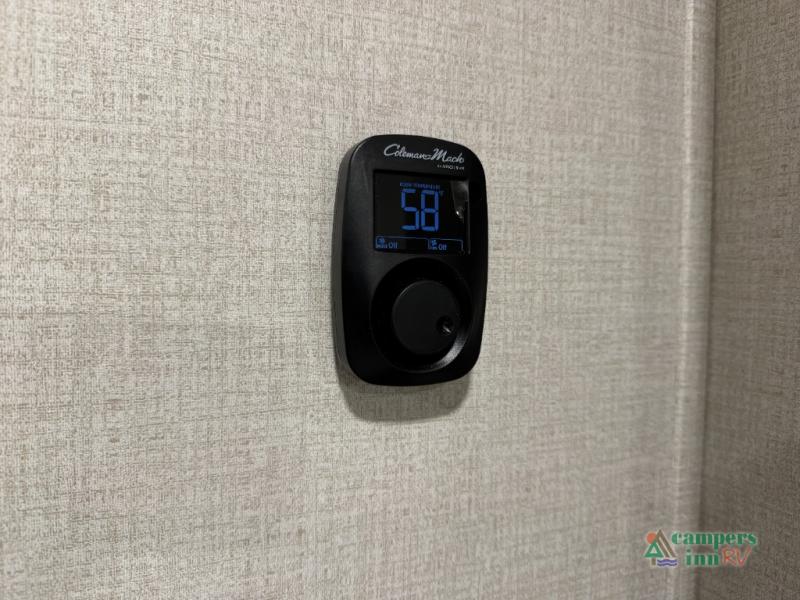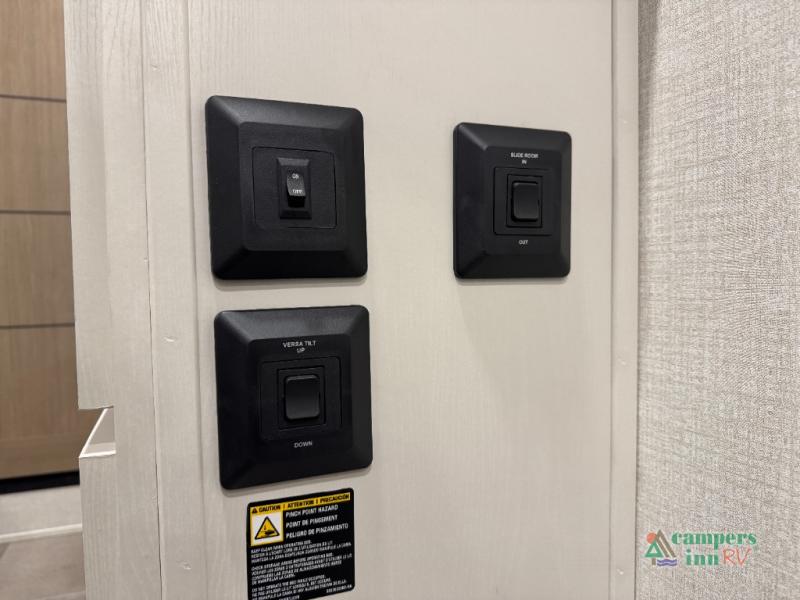 With any Impression fifth wheel by Forest River, the focus of the design is comfort and value, built with quality craftsmanship and attention to customer's desires in each Impression! The exterior includes upgraded E-rated tires, custom exterior graphics package, and insulated slam latch baggage doors. There is also an enclosed docking station, an outside shower, and a 100W roof panel for off-grid capabilities. The fully heated and enclosed AccessiBelly has removable underbelly panels along with enclosed tank valves. There is an industry leading 15K A/C plus 35K BTU furnace to keep you comfortable. The interior has lumbercore cabinetry, residential linoleum, residential backsplash in the kitchen, and oversized opening windows in the living area for more natural lighting and good air flow.