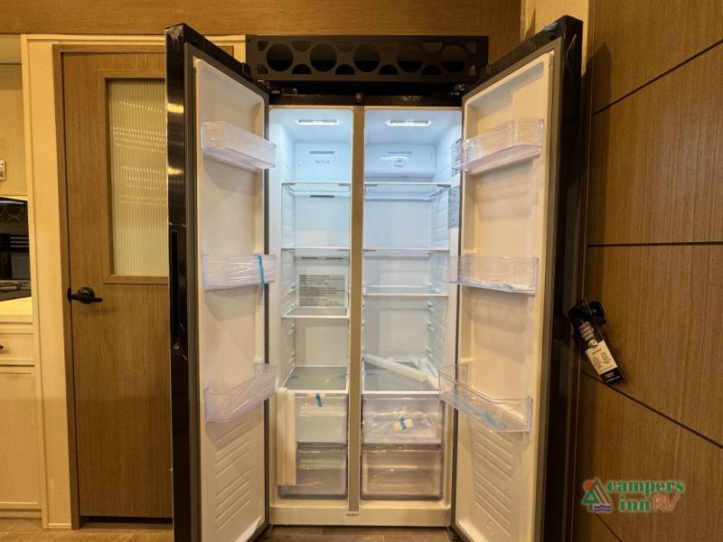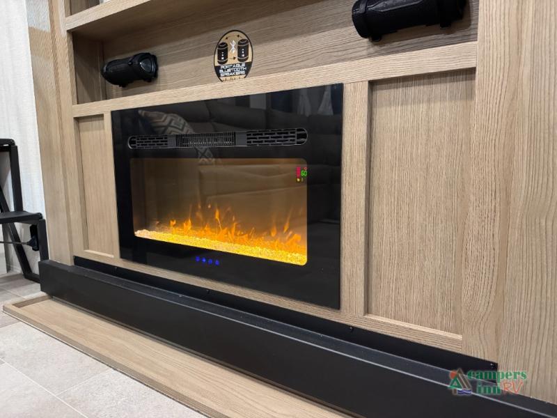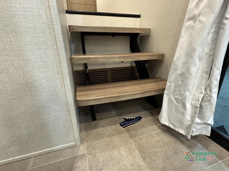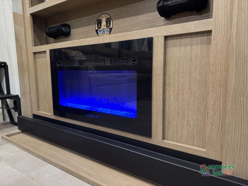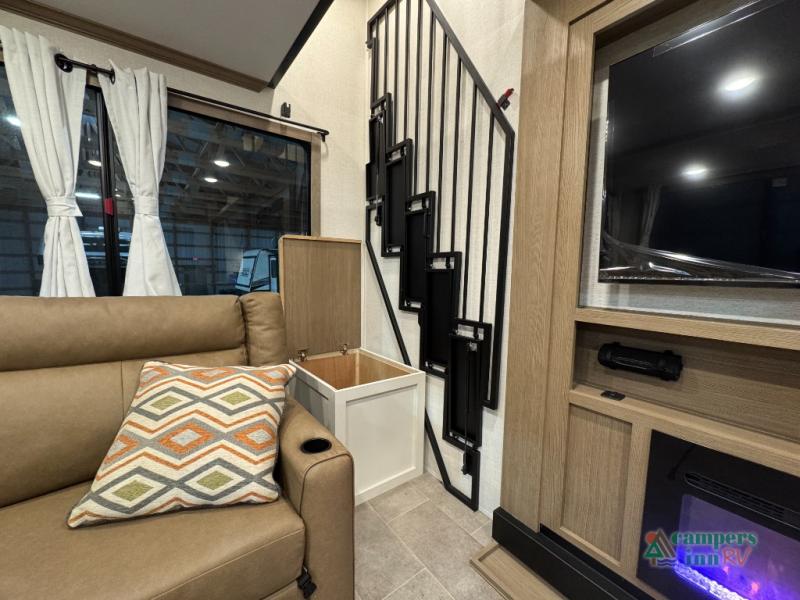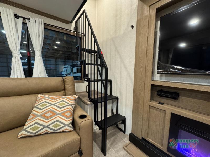 Stay in comfort with this four slide out fifth wheel! There is a triple-slide patio door that opens into the kitchen, complete with a kitchen island, floor to ceiling pantry and 16 cu. ft. 12V refrigerator, and a convenient half bath with storage. There are reclining seats with a chaise lounge across from an entertainment center and fireplace. The fold-up steps lead up to the loft that includes two bunk mats, a wardrobe, cubby storage, plus windows, which will make this space bright and open. The full bath towards the front includes washer/dryer prep, a walk-in shower with a skylight, and a linen closet to keep towels close by. And you'll love having your own bedroom up front with a king bed with Versa Tilt, a dresser with a bench, and a front wardrobe to keep your clothes wrinkle-free!