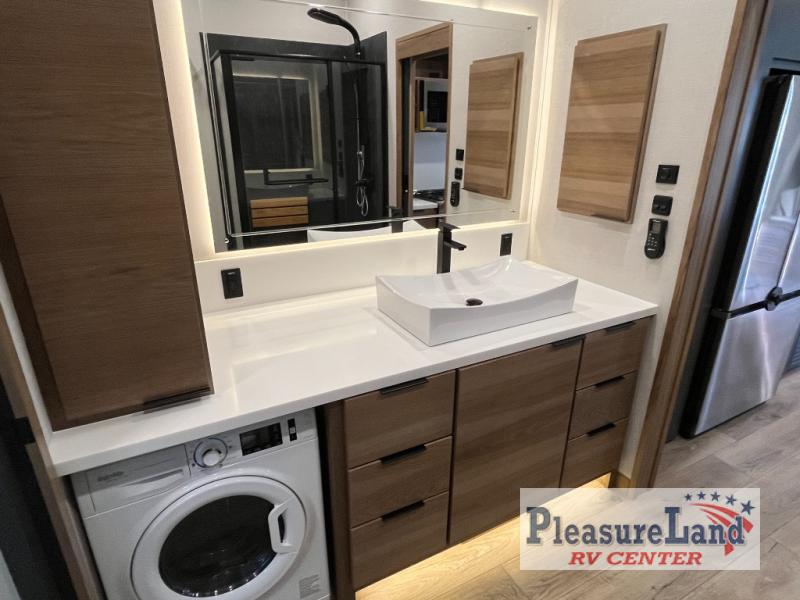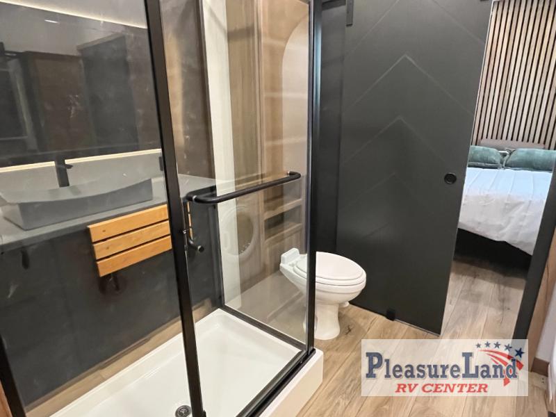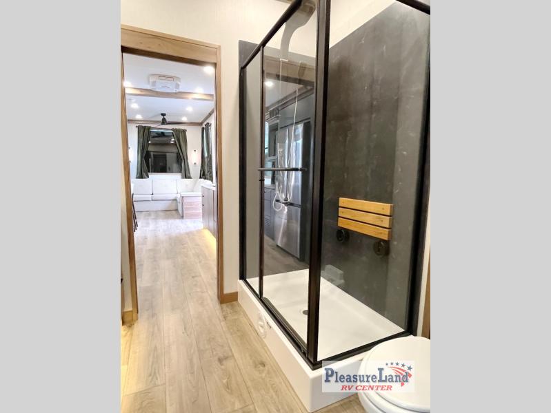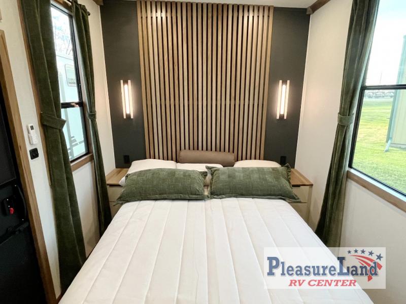 Luxury abounds in the Lost Pines destination trailer by Forest River. Each model features 3" hung wall construction, a rolled fiberglass roof, a thermofoil lined underbelly, and an Azdel gel coat fiberglass exterior wall for added durability. The full-body paint with 4x Clear Coat is sure to turn heads as you travel to your destination, and the LCI Road Armor suspension system will provide a smooth tow. You'll also find dual 40 lb. LP tanks outside, along with a heated full docking station, and MORryde entry steps and Safe-T-Rail. The interior of the Lost Pines is outfitted with luxury vinyl flooring, residential appliances, LED lighting throughout, plus upgraded solid surface countertops and backsplash!