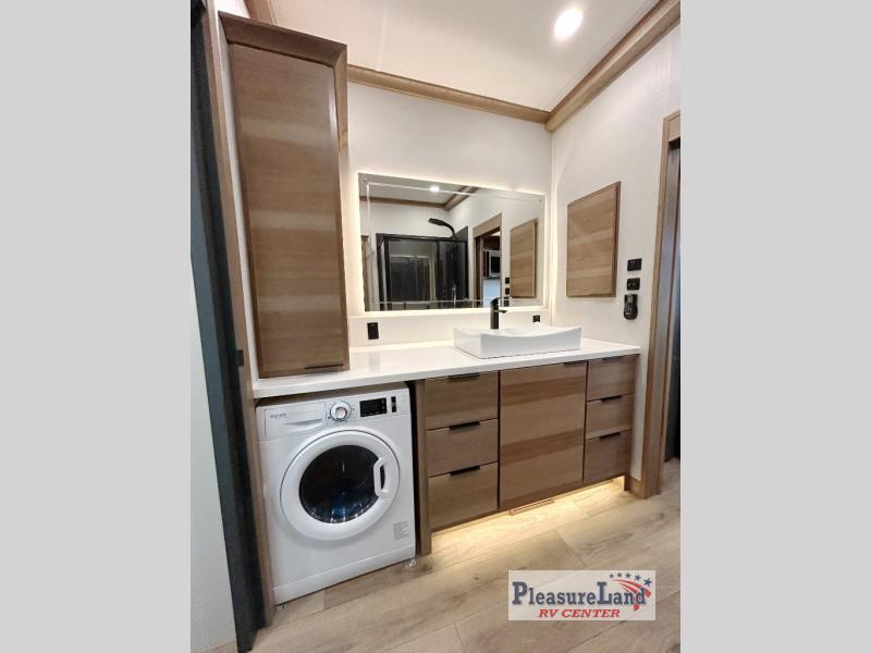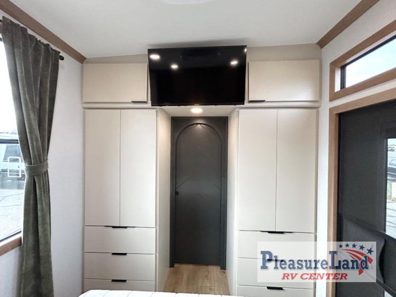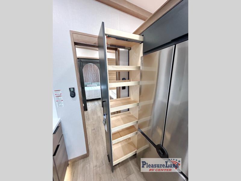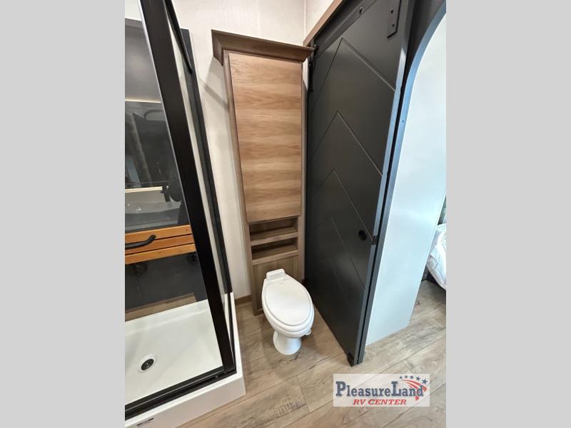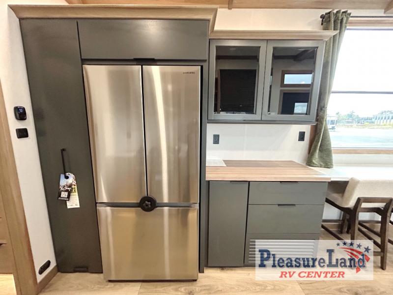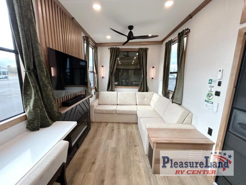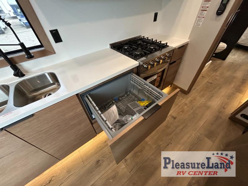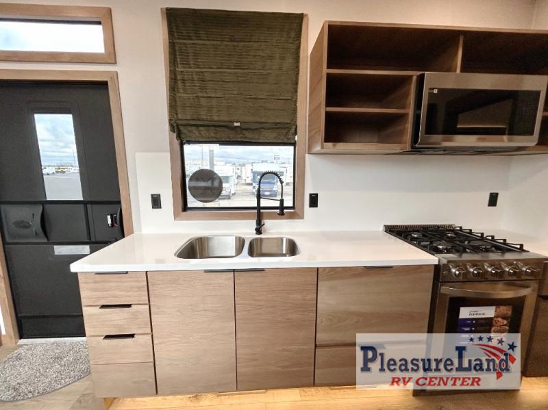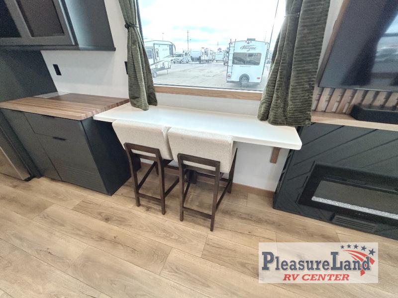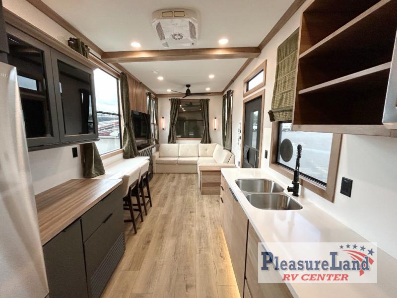 For those who appreciate a destination trailer easier to maintain, this slide-less unit will be perfect for you! Your crew can relax comfortably in the front living area that includes an L-shaped sleeper sofa across from an entertainment center or enjoy the views out the window in front of the countertop with chairs. The full kitchen will allow you to make your best home-cooked meals, and the spacious walk-through bath is easily accessible. You're sure to love the rear bedroom that includes a queen bed with a king bed option, along with dual bedroom closets to keep everything organized!