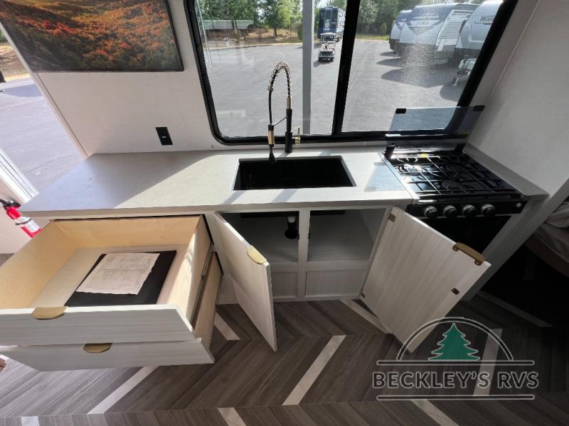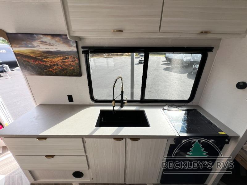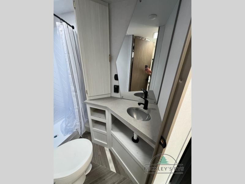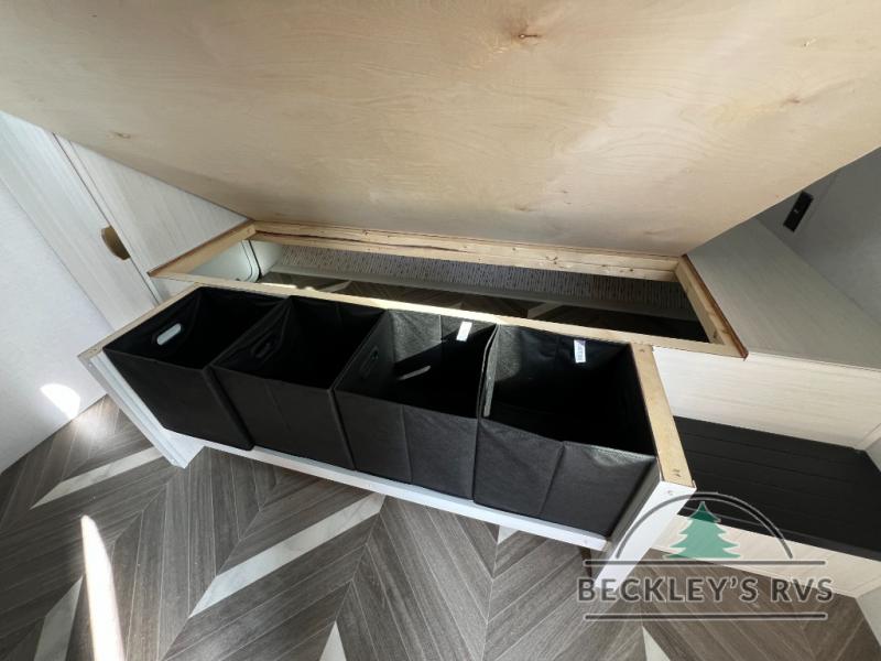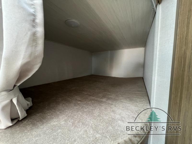 This trailer resembles the layout of 2300RB, but you'll enjoy added double-size bunks in the rear corner, with a full bath in the other rear corner! You'll have the front private bedroom all to yourselves with a king bed and dual wardrobes, and other guests can sleep on the L-shaped sofa when it's not being used to relax on. The kitchen on this Ozark includes a 3-in-1 cooktop with a convection microwave, and a window by the sink so you can have open views as you clean up. There is also a pantry and a 12V refrigerator to keep food stocked!