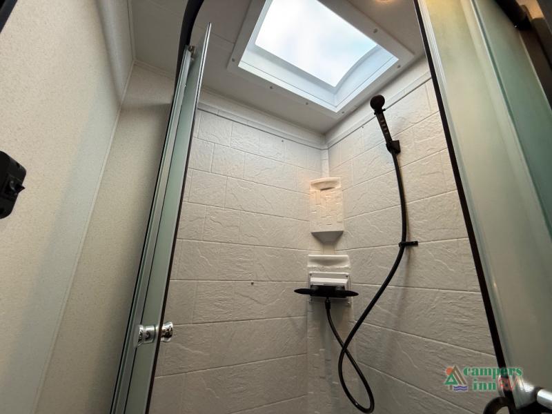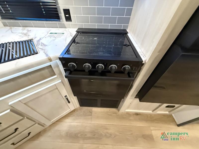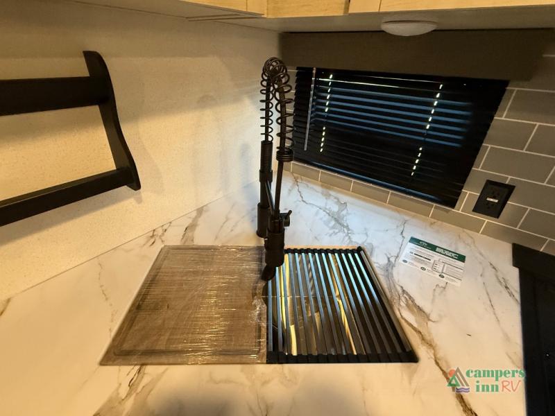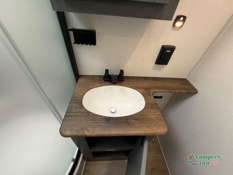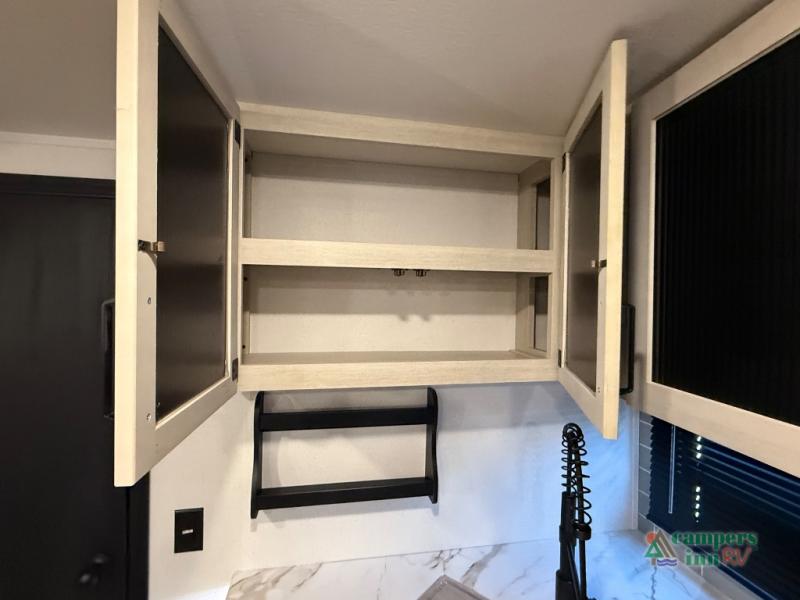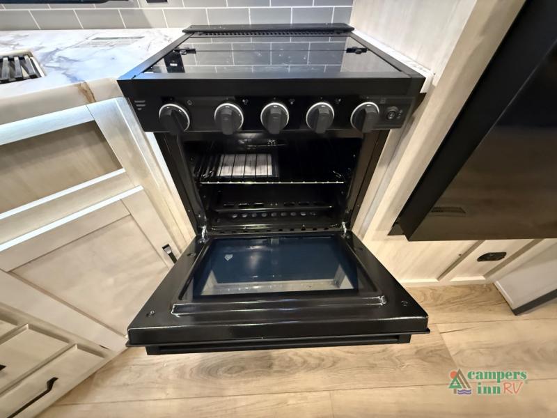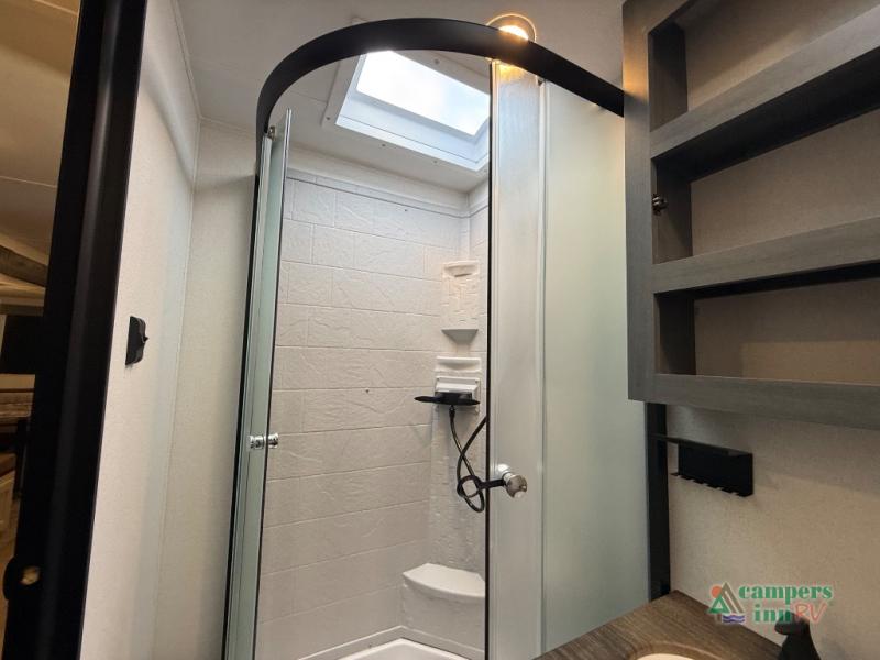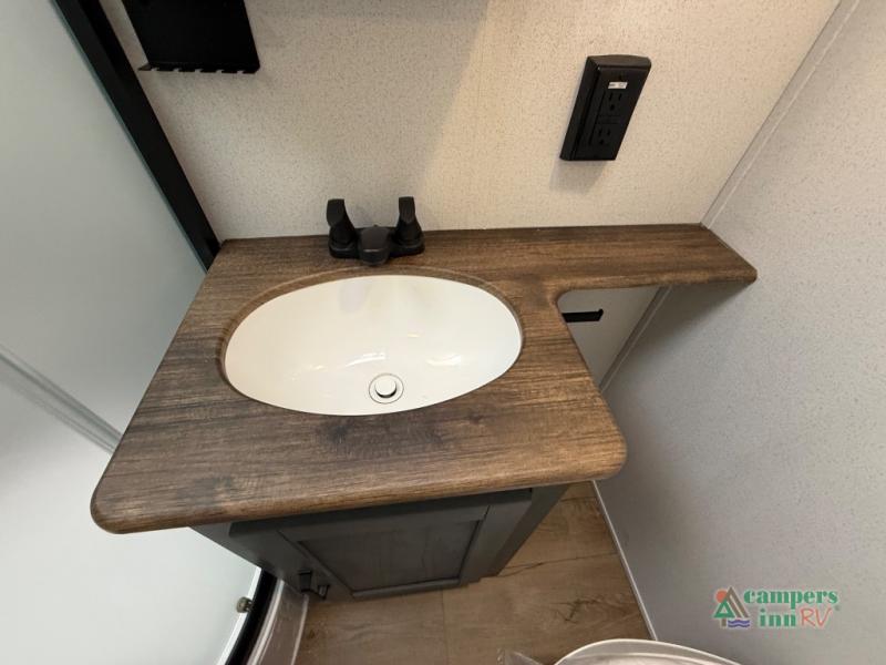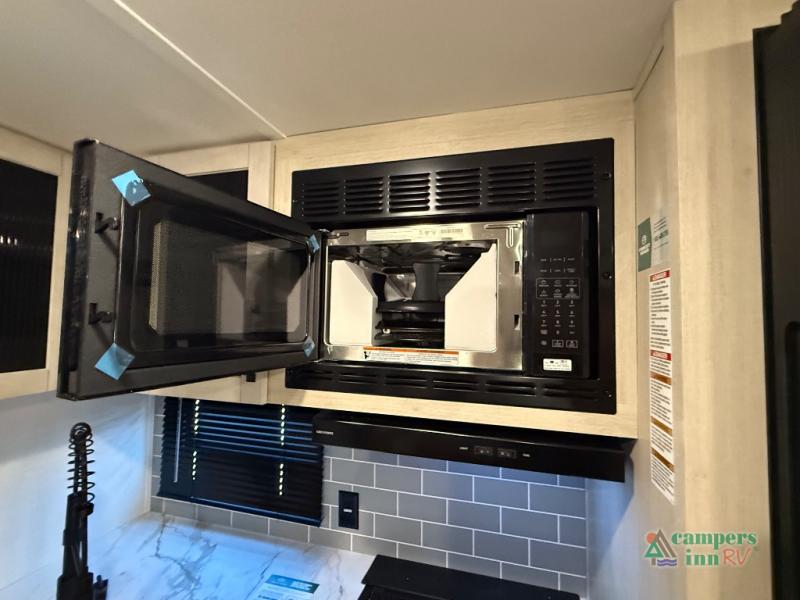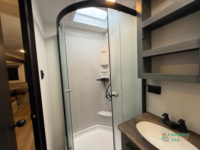 The kids will love having their own rear private bunkhouse in this travel trailer! Inside the bunkhouse is a 38" x 76" bunk above an entertainment center, a closet, and a 32" x 69" bunk above a jiffy sofa slide. The full bathroom with a 34" x 34" radius shower is just outside the bunkhouse for them to easily access it at night. They can even invite a friend or two to tag along and sleep on the sofa and U-shaped dinette once converted. Behind the entertainment center is a closet/pantry to keep your favorite snacks and the kitchen has a 12V refrigerator to keep your beverages cold. When you're ready to wind down your nights, head to the front private bedroom and relax on the queen bed with shirt closets and nightstands on either side of it, plus it has one of the dual entry doors to the unit! This model also includes two outside kitchen options if you enjoy cooking in the fresh outdoors!