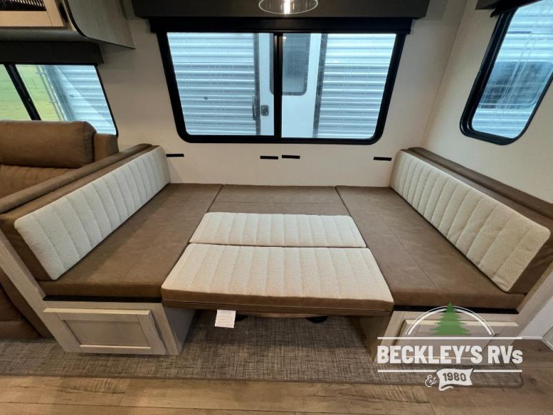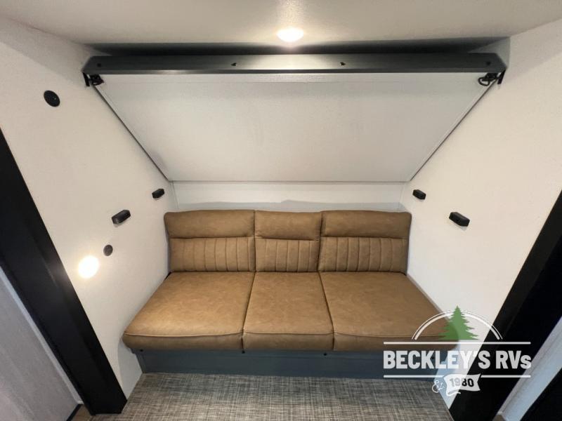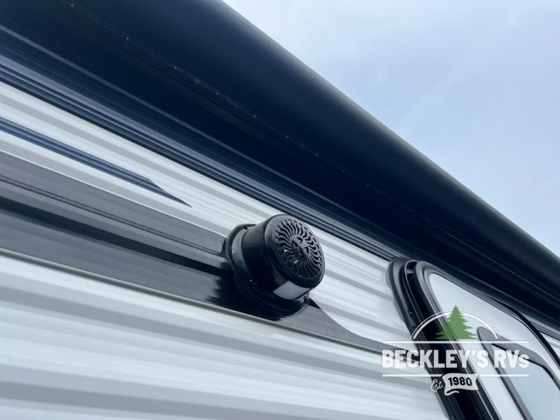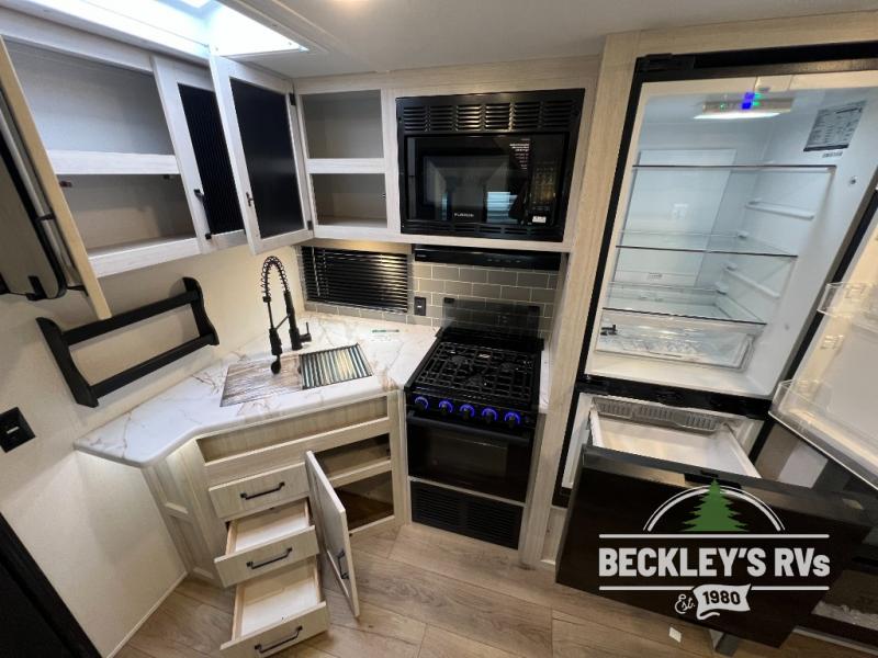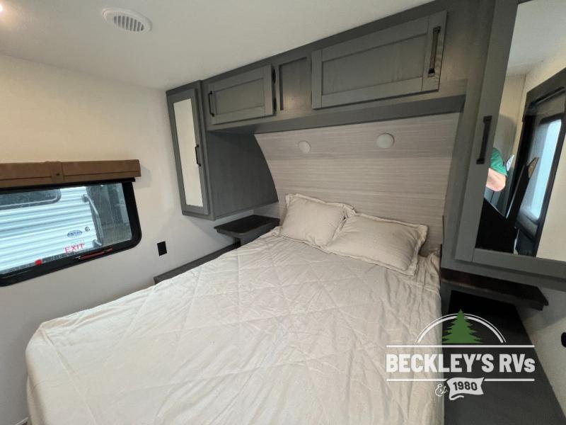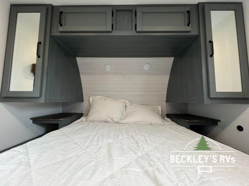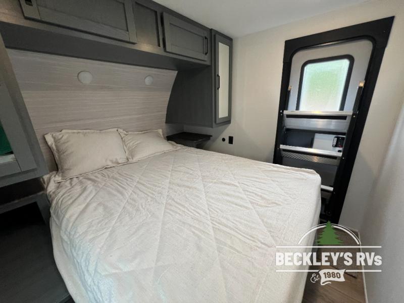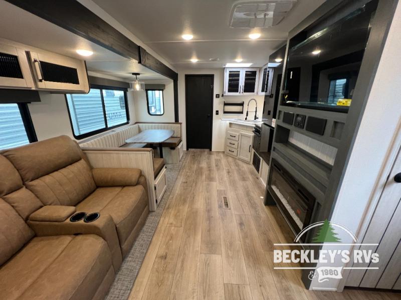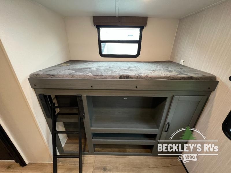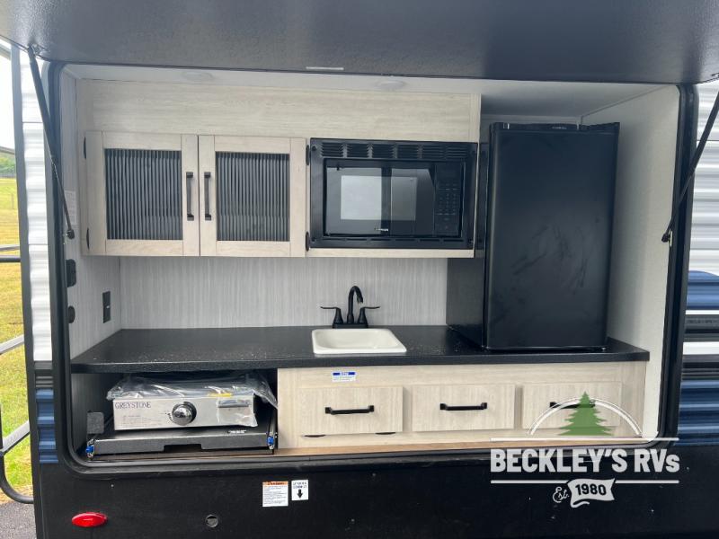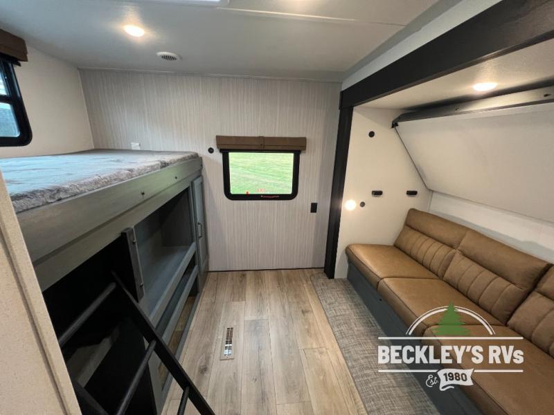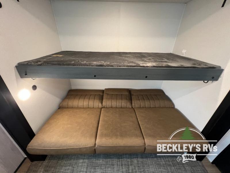 The kids will love having their own rear private bunkhouse in this travel trailer! Inside the bunkhouse is a 38" x 76" bunk above an entertainment center, a closet, and a 32" x 69" bunk above a jiffy sofa slide. The full bathroom with a 34" x 34" radius shower is just outside the bunkhouse for them to easily access it at night. They can even invite a friend or two to tag along and sleep on the sofa and U-shaped dinette once converted. Behind the entertainment center is a closet/pantry to keep your favorite snacks and the kitchen has a 12V refrigerator to keep your beverages cold. When you're ready to wind down your nights, head to the front private bedroom and relax on the queen bed with shirt closets and nightstands on either side of it, plus it has one of the dual entry doors to the unit! This model also includes two outside kitchen options if you enjoy cooking in the fresh outdoors!