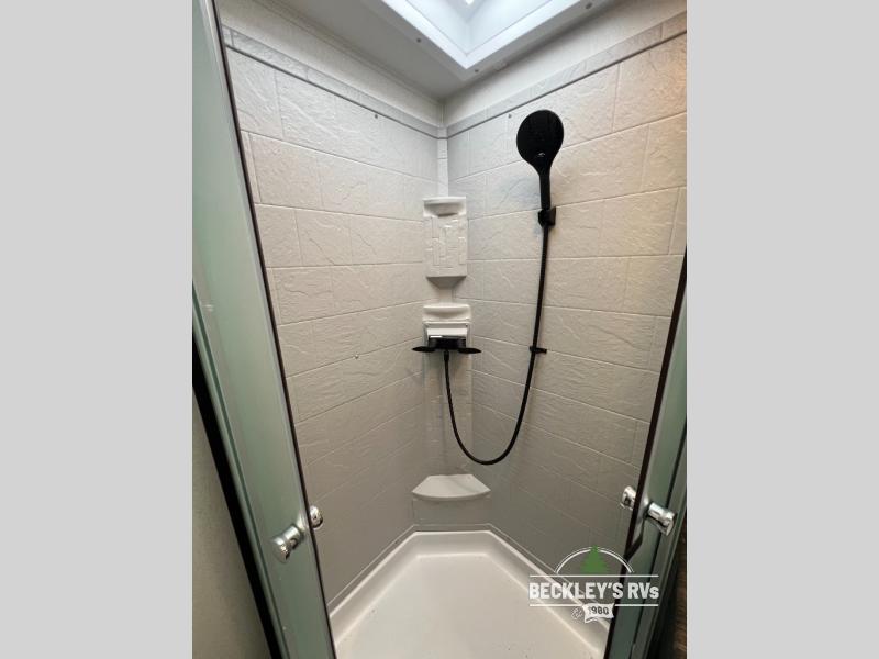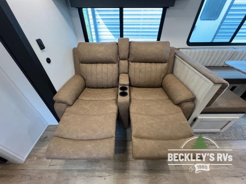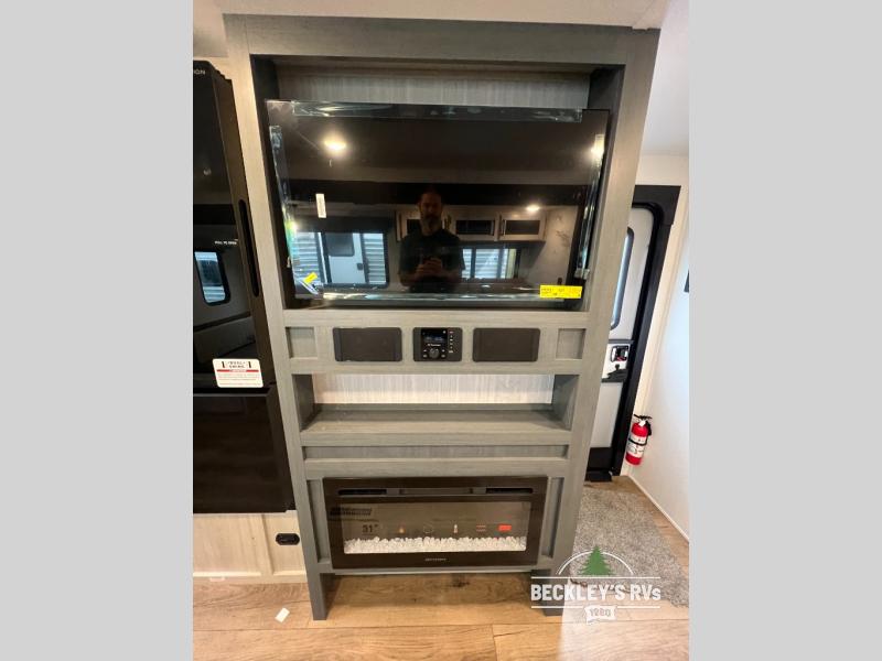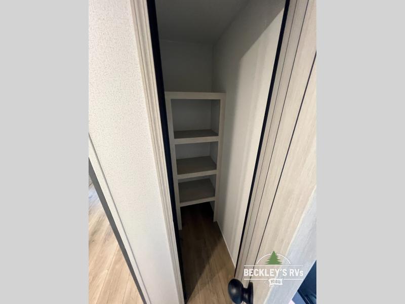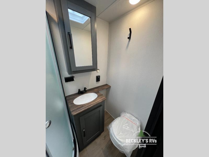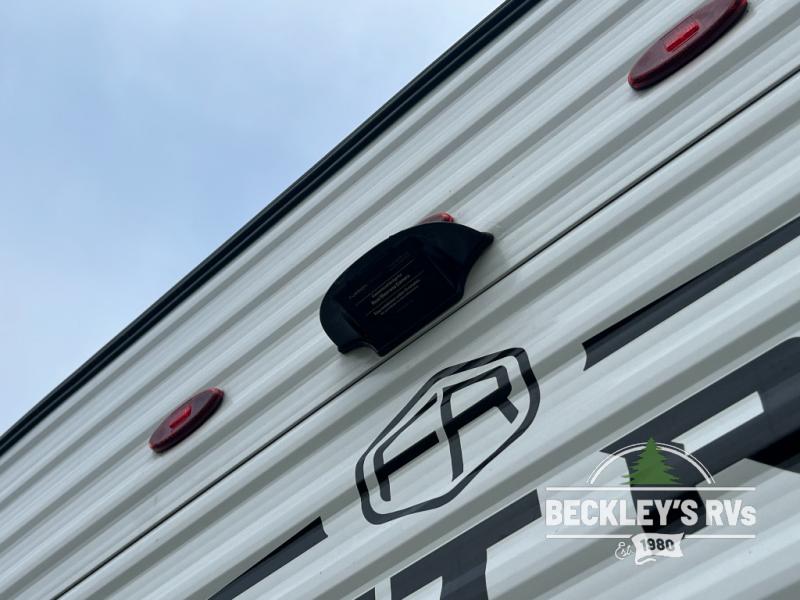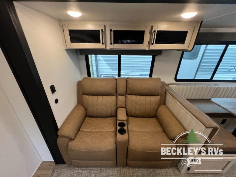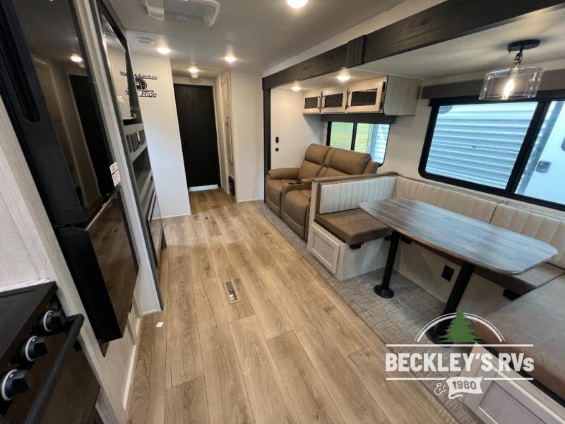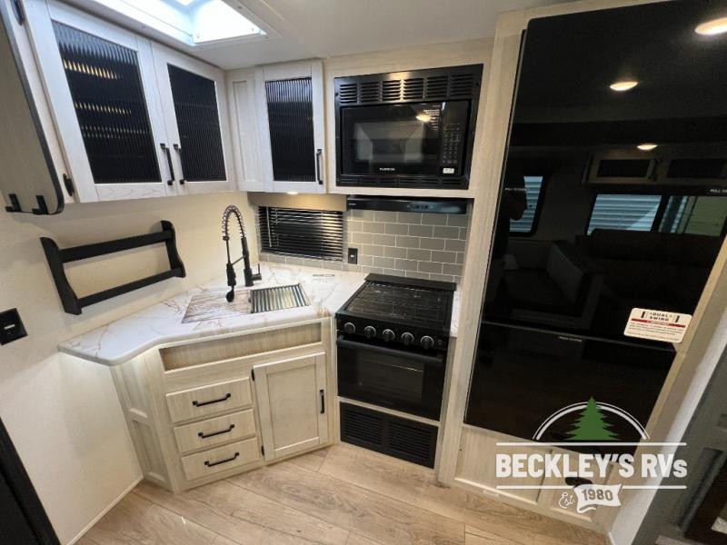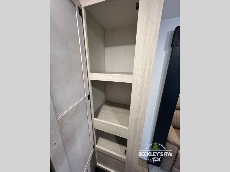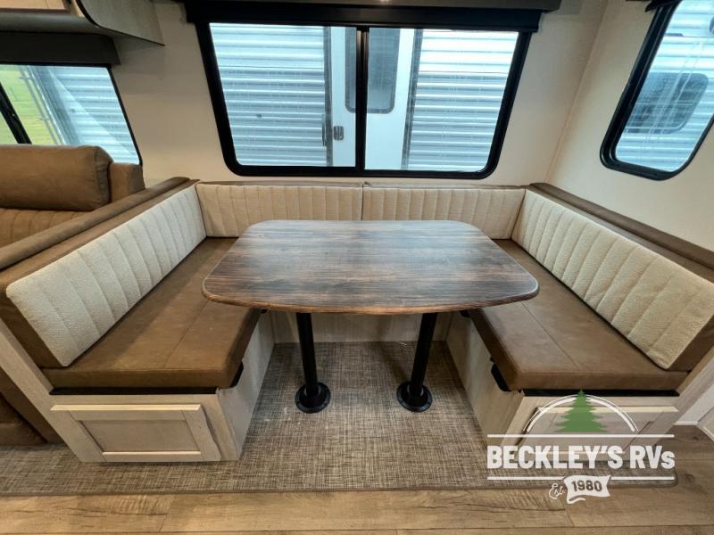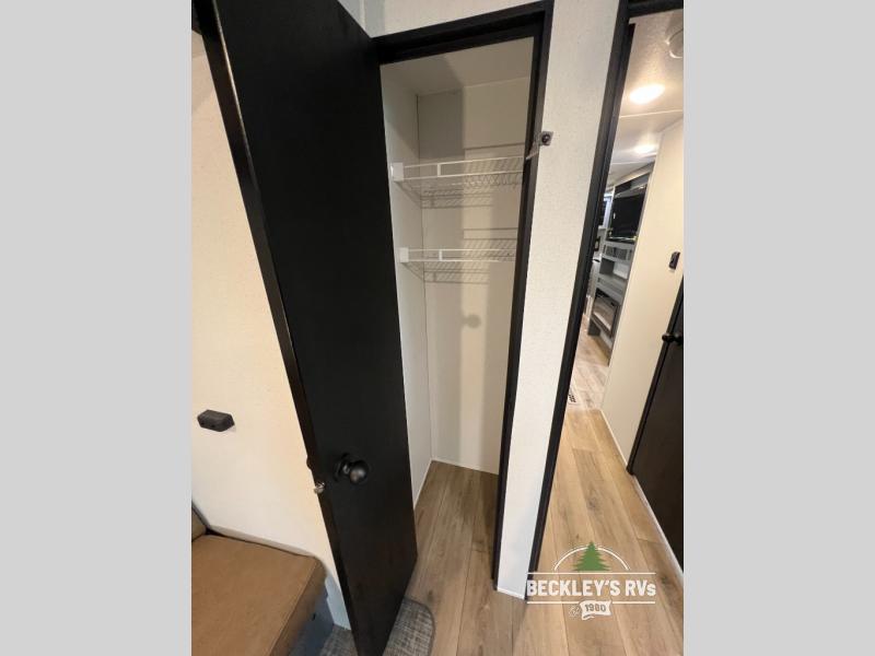 The kids will love having their own rear private bunkhouse in this travel trailer! Inside the bunkhouse is a 38" x 76" bunk above an entertainment center, a closet, and a 32" x 69" bunk above a jiffy sofa slide. The full bathroom with a 34" x 34" radius shower is just outside the bunkhouse for them to easily access it at night. They can even invite a friend or two to tag along and sleep on the sofa and U-shaped dinette once converted. Behind the entertainment center is a closet/pantry to keep your favorite snacks and the kitchen has a 12V refrigerator to keep your beverages cold. When you're ready to wind down your nights, head to the front private bedroom and relax on the queen bed with shirt closets and nightstands on either side of it, plus it has one of the dual entry doors to the unit! This model also includes two outside kitchen options if you enjoy cooking in the fresh outdoors!
