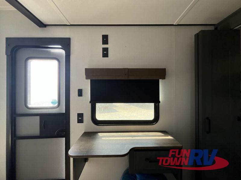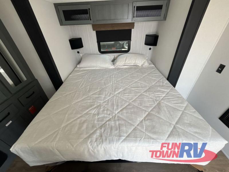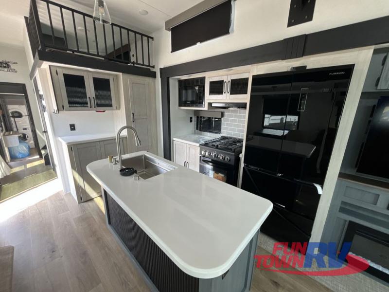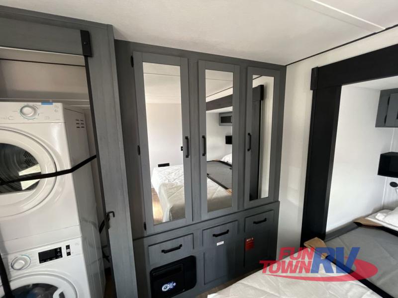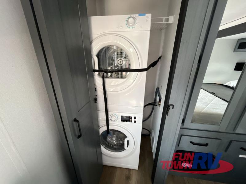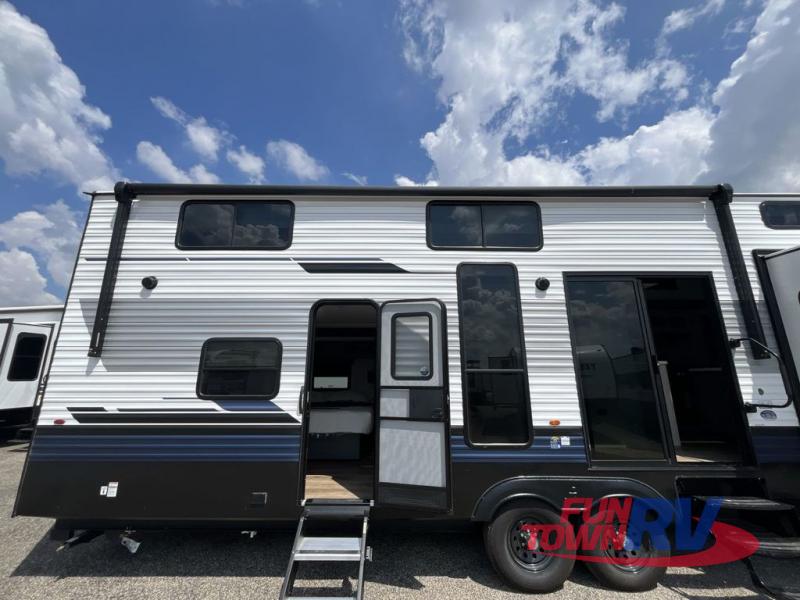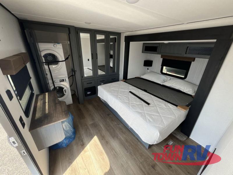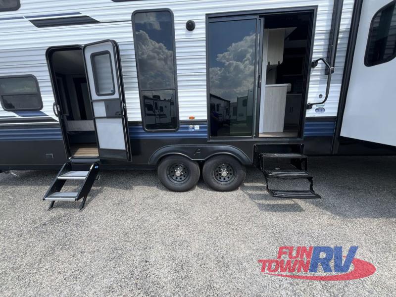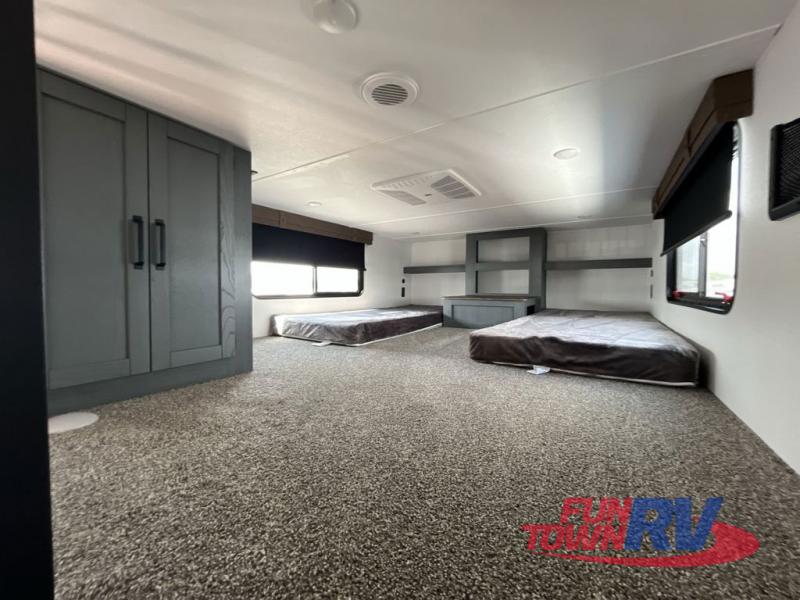 Wherever your destination may be, you can be sure to enjoy it to the fullest with this trailer in tow! With two entry doors, you can enter in through the rear private bedroom or the main living area. The bedroom includes a king bed slide out, a wardrobe/closet to keep your clothes organized, plus a closet with the option to add washer and dryer prep. Just outside this room are steps that lead to the large loft area with a 58" x 58" bunk mat and a cabinet on one side, plus two 32" x 69" bunk mats on the other. There is also a cabinet and a wardrobe/closet for plenty of storage space. Once you've headed back downstairs, you can relax on the dual recliners, front sofa, or free-standing table with a bench and two seats. And the chef of your group will love the kitchen with its residential style refrigerator and pantry, kitchen island, and four burner cooktop!
