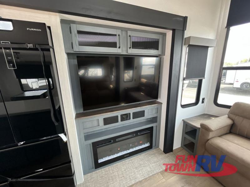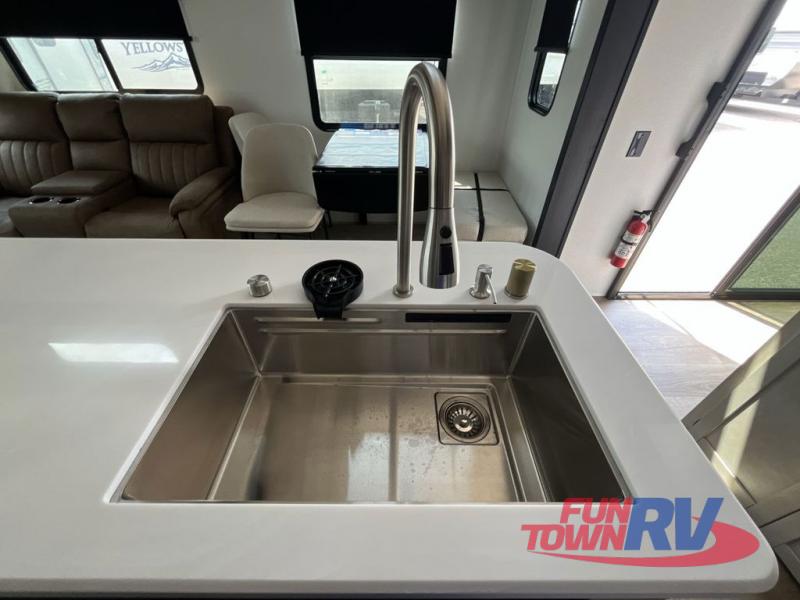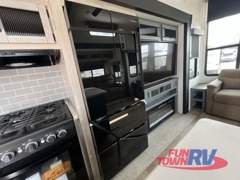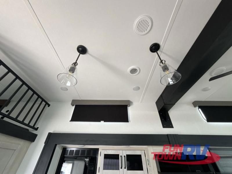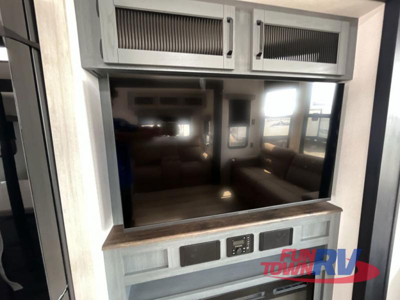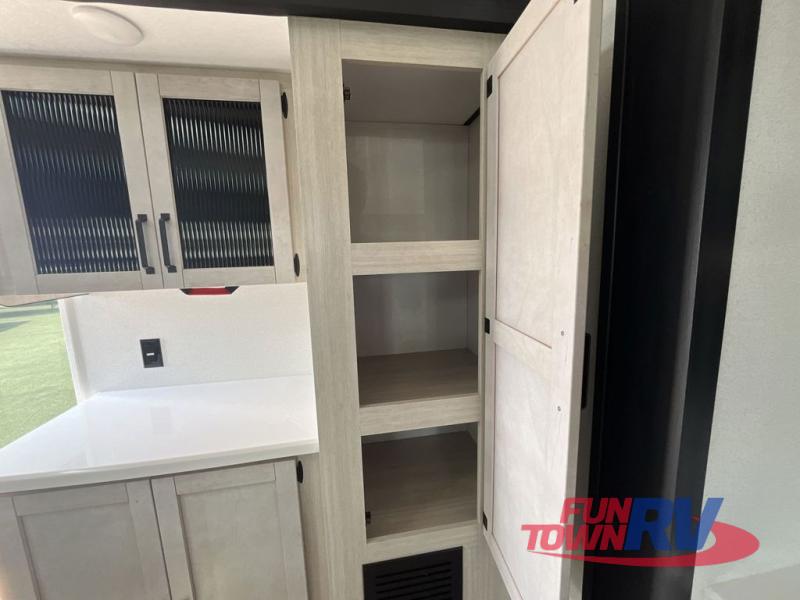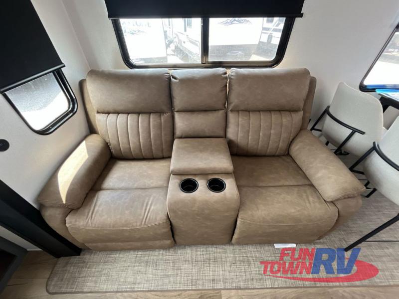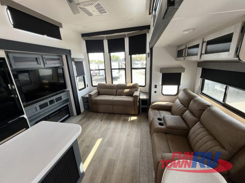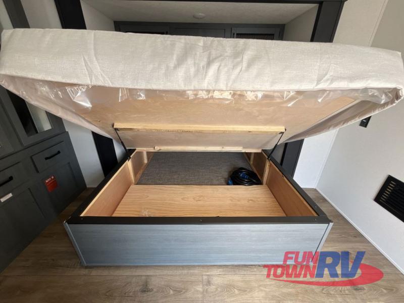 Wherever your destination may be, you can be sure to enjoy it to the fullest with this trailer in tow! With two entry doors, you can enter in through the rear private bedroom or the main living area. The bedroom includes a king bed slide out, a wardrobe/closet to keep your clothes organized, plus a closet with the option to add washer and dryer prep. Just outside this room are steps that lead to the large loft area with a 58" x 58" bunk mat and a cabinet on one side, plus two 32" x 69" bunk mats on the other. There is also a cabinet and a wardrobe/closet for plenty of storage space. Once you've headed back downstairs, you can relax on the dual recliners, front sofa, or free-standing table with a bench and two seats. And the chef of your group will love the kitchen with its residential style refrigerator and pantry, kitchen island, and four burner cooktop!