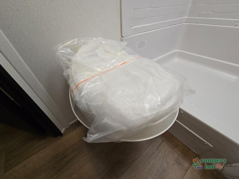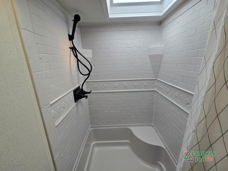 The full bath is located near the bunks and features a shower with a seat for added comfort.