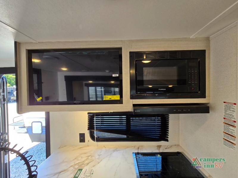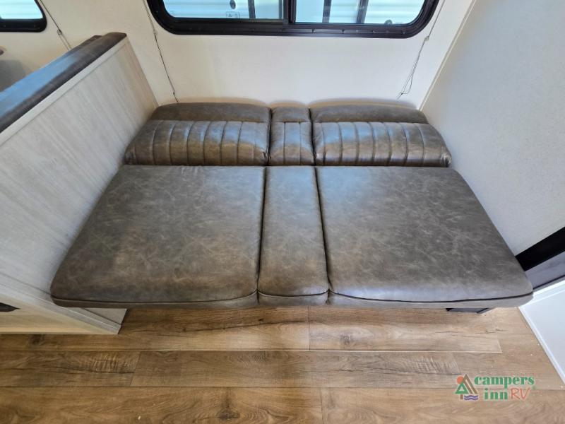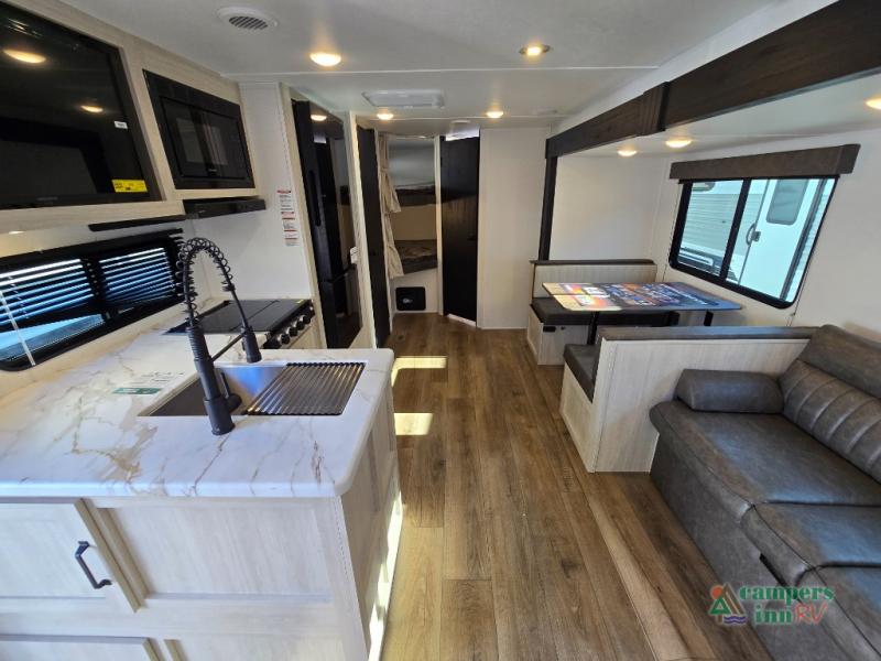 For entertainment, the large living space includes a booth dinette and a sofa, positioned across from an optional TV setup—great for movie nights. The kitchen is well-equipped with a stainless steel microwave, three-burner cooktop, 12V refrigerator, and pantry. If you're someone who loves cooking outdoors, you can opt for an outside kitchen with a griddle.