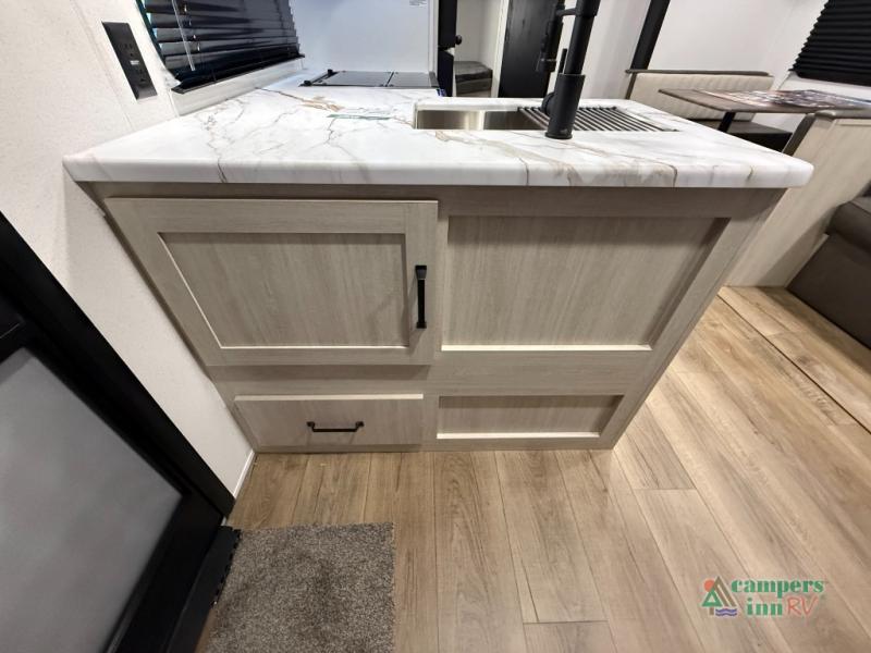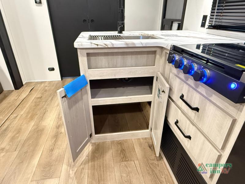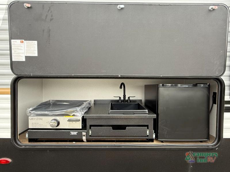 Outdoor Kitchen: Mini-kitchen with griddle, mini-fridge, and sink (optional or included per dealer package)