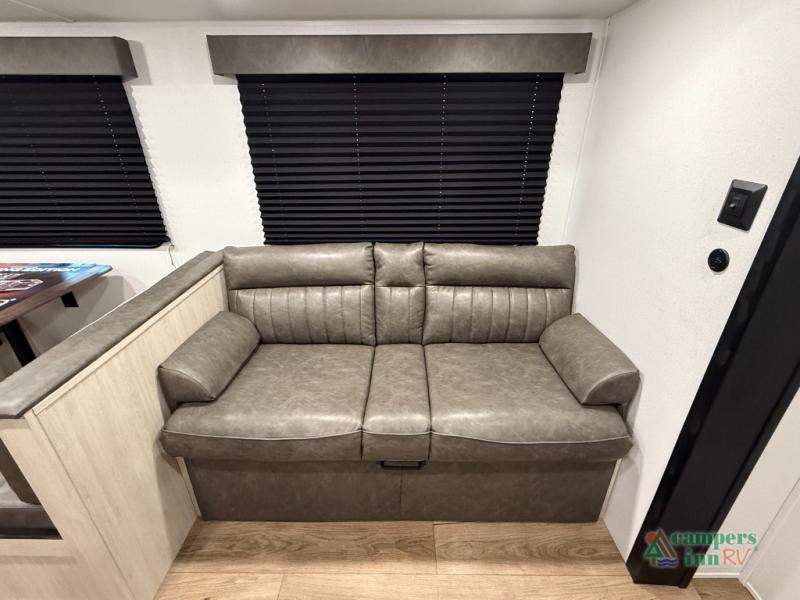 Floorplan: Front queen bedroom, slide-out with booth dinette and jack-knife sofa, rear double-size bunks