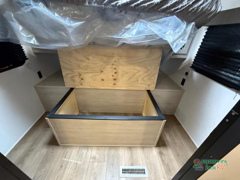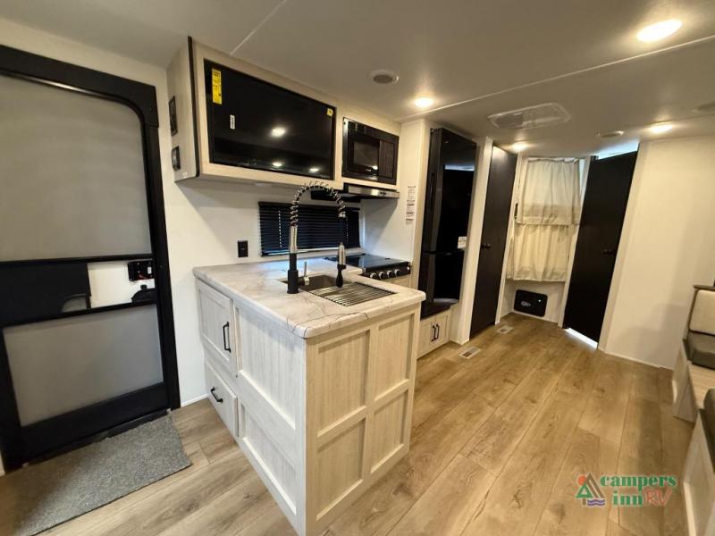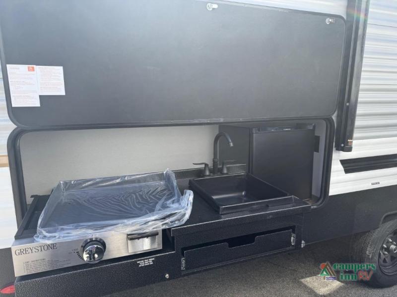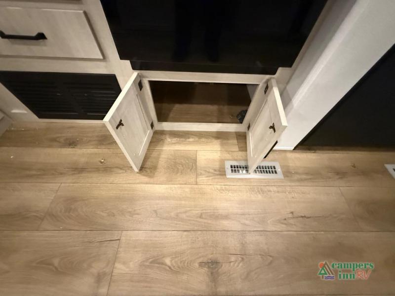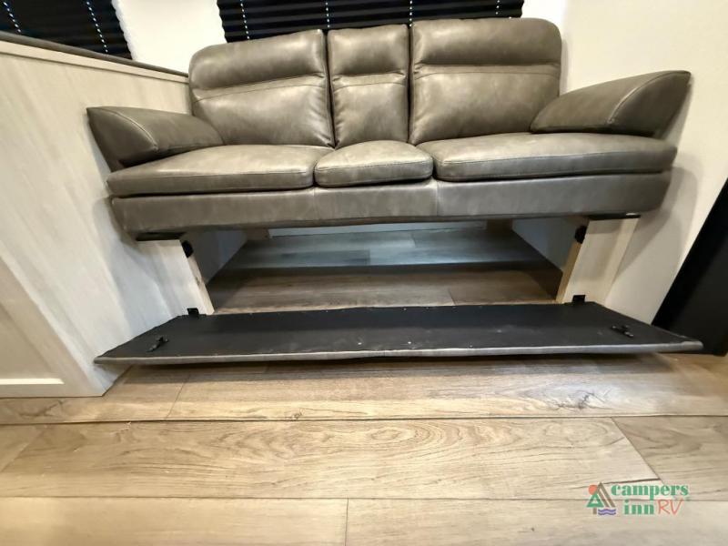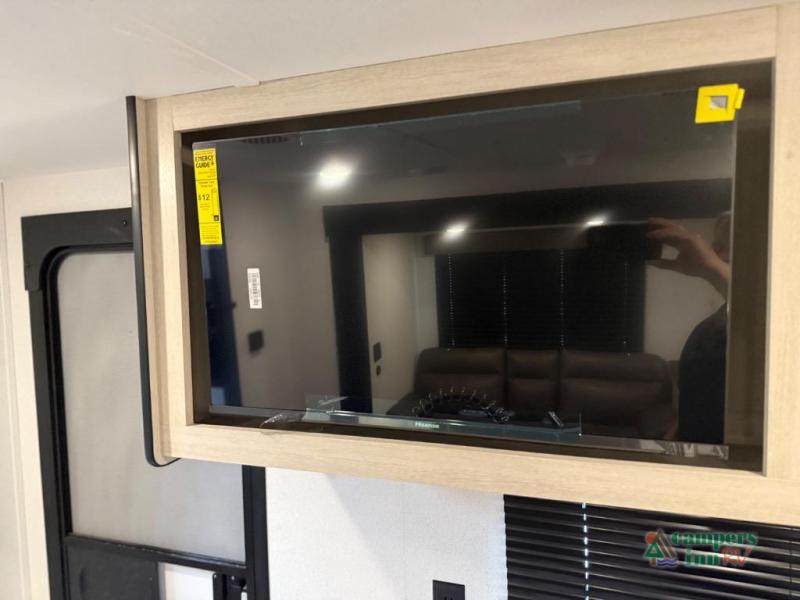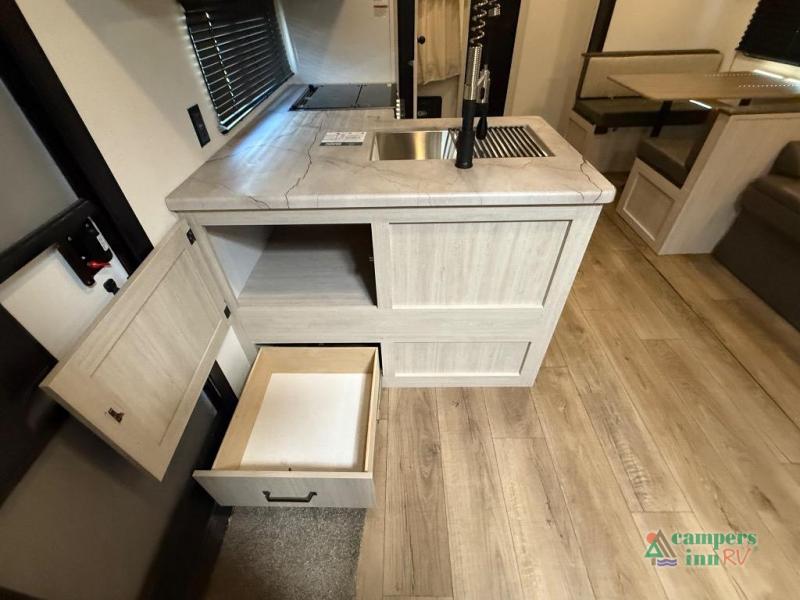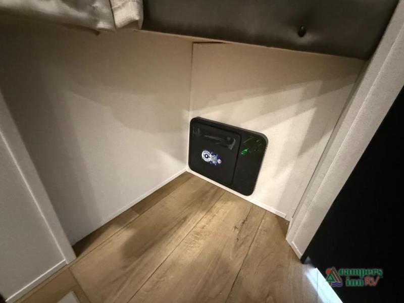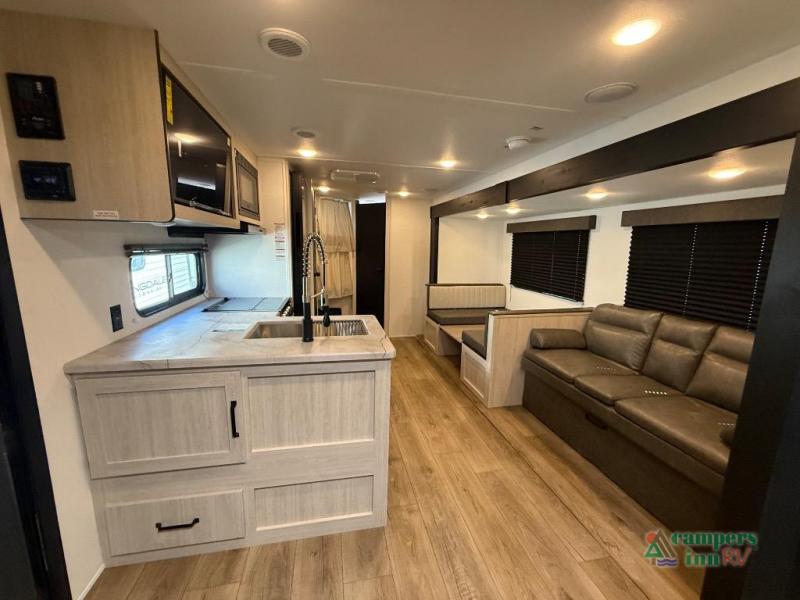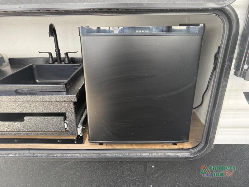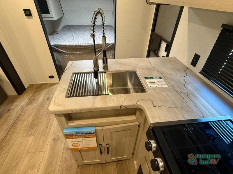 On the exterior, you’ll find an optional outdoor kitchen setup, power awning, solid entry steps, and pass-through storage. It’s also prepped for a backup camera and solar power, and it includes an enclosed underbelly for better cold-weather protection.