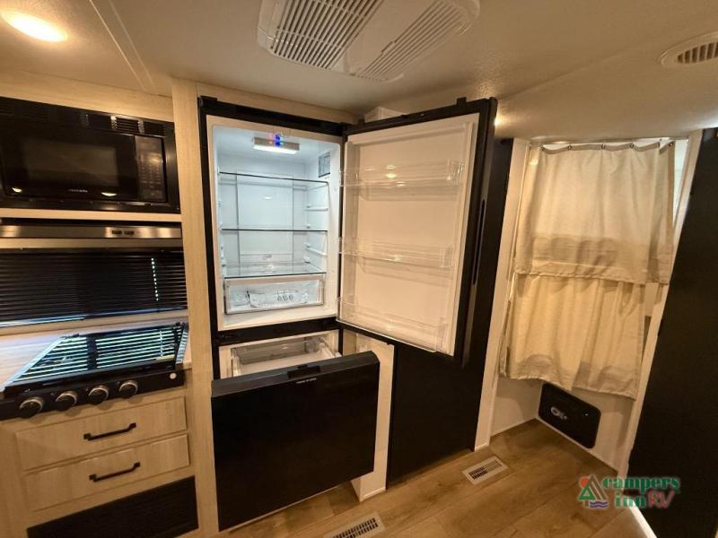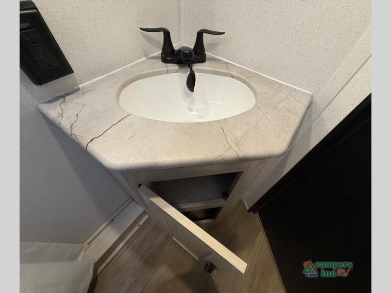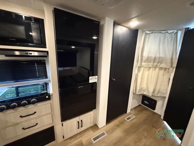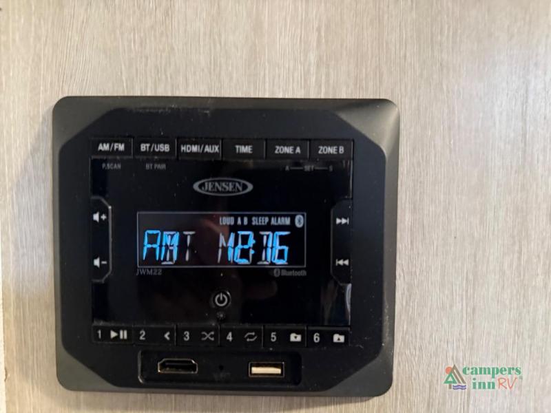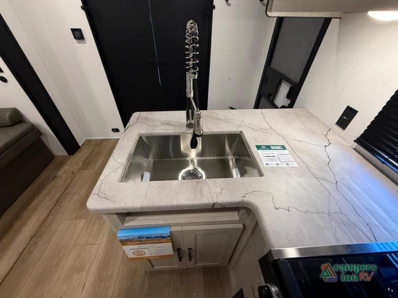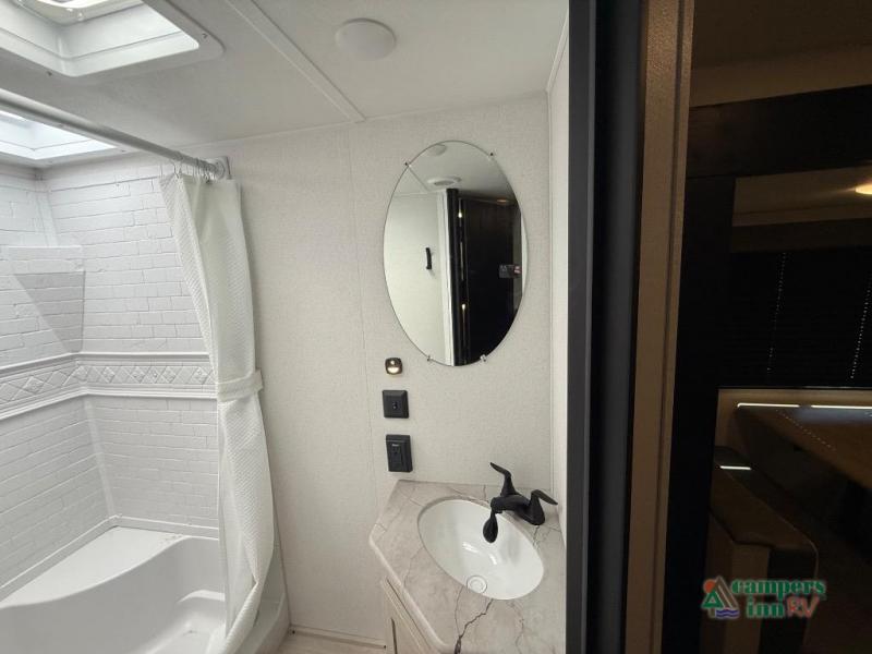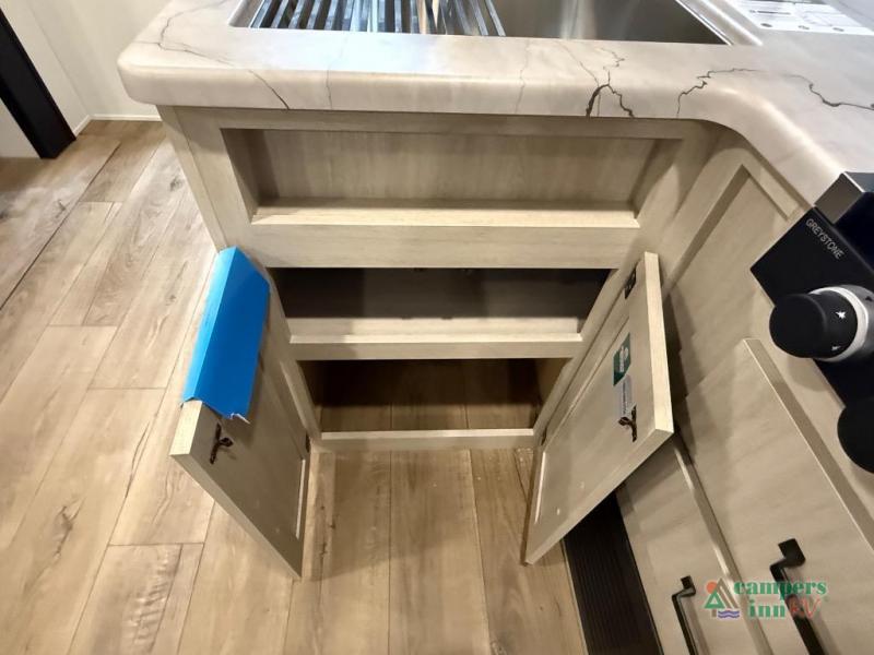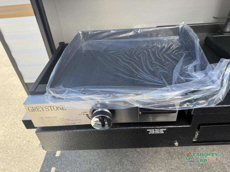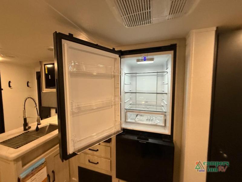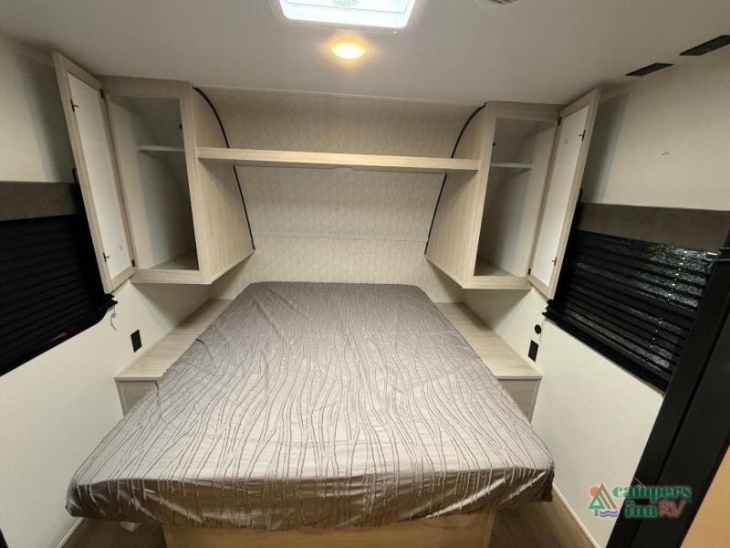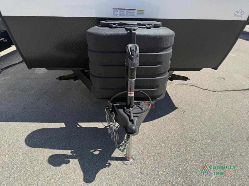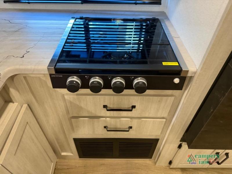On the exterior, you’ll find an optional outdoor kitchen setup, power awning, solid entry steps, and pass-through storage. It’s also prepped for a backup camera and solar power, and it includes an enclosed underbelly for better cold-weather protection.