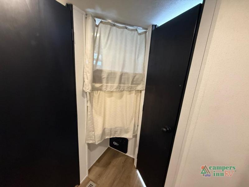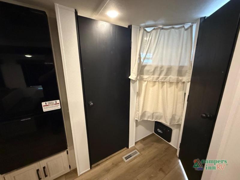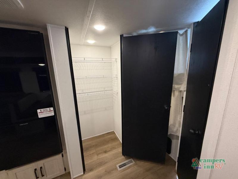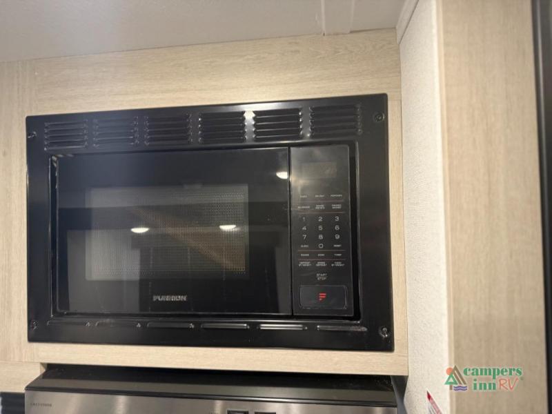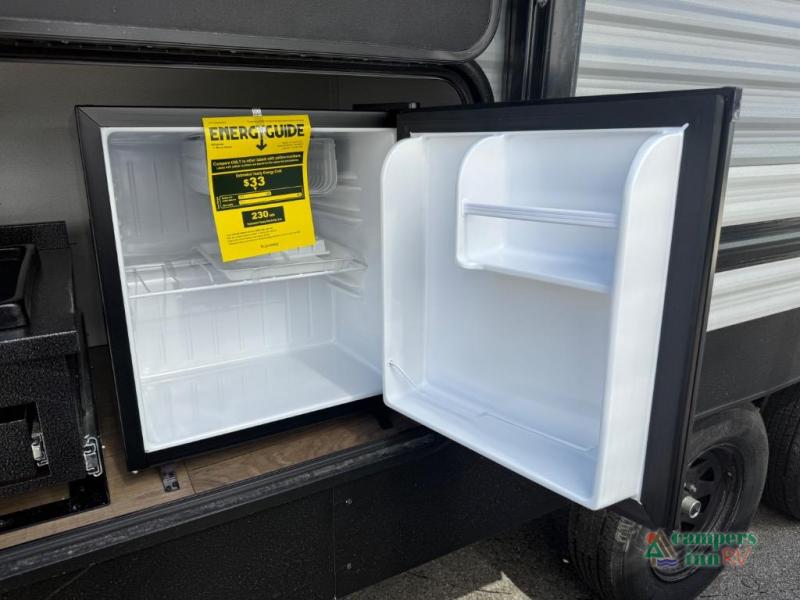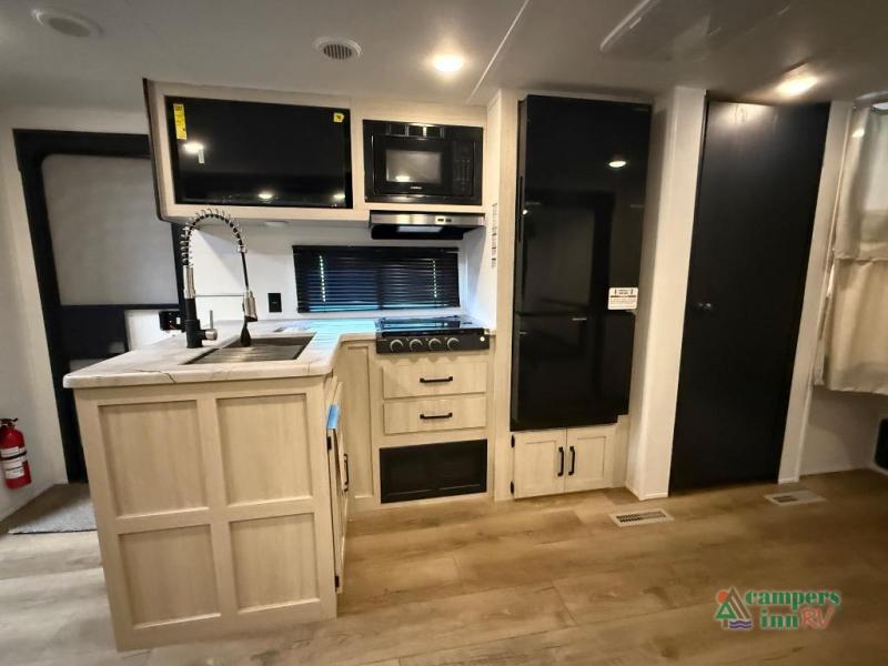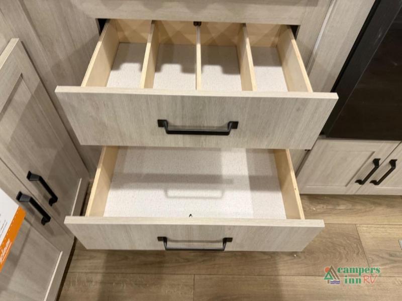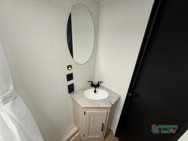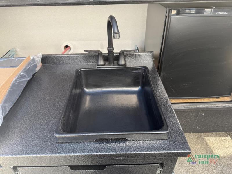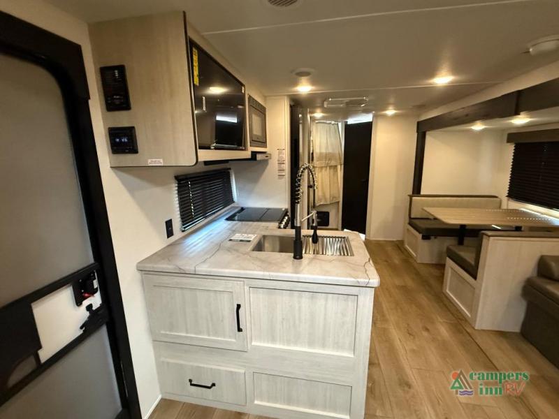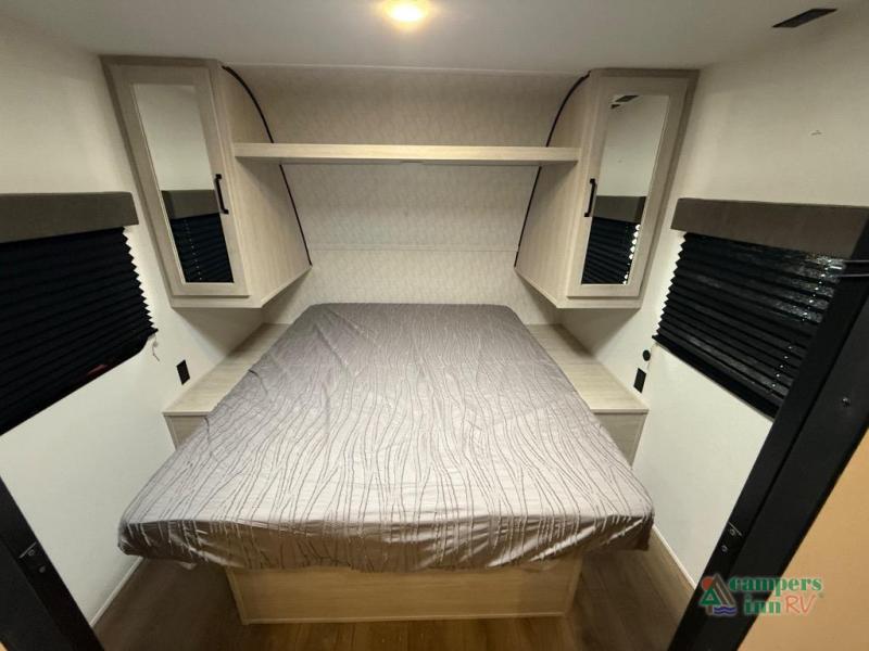 On the exterior, you’ll find an optional outdoor kitchen setup, power awning, solid entry steps, and pass-through storage. It’s also prepped for a backup camera and solar power, and it includes an enclosed underbelly for better cold-weather protection.