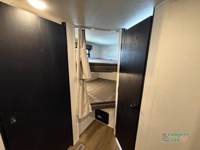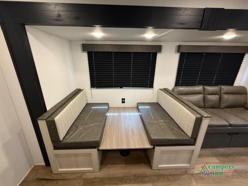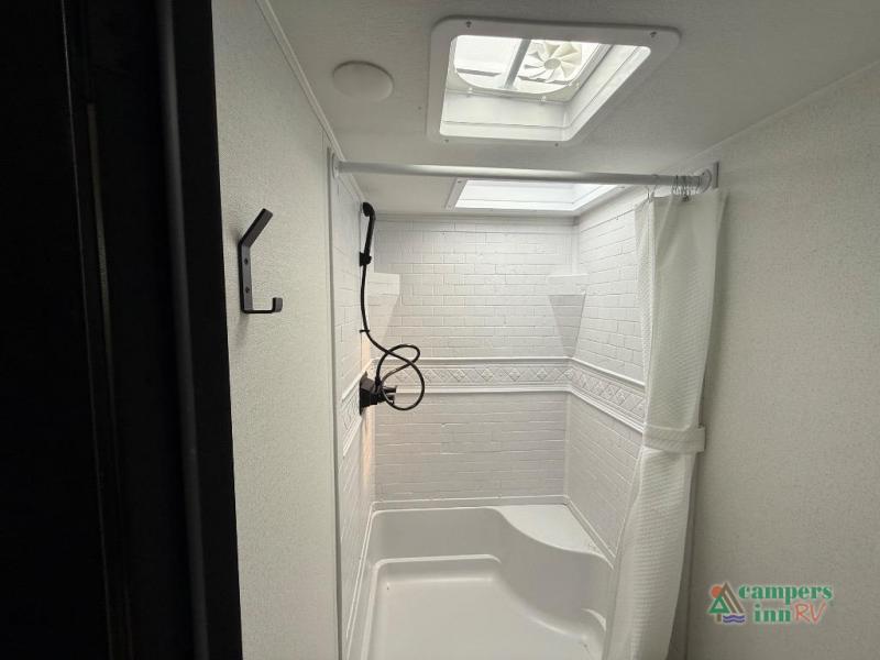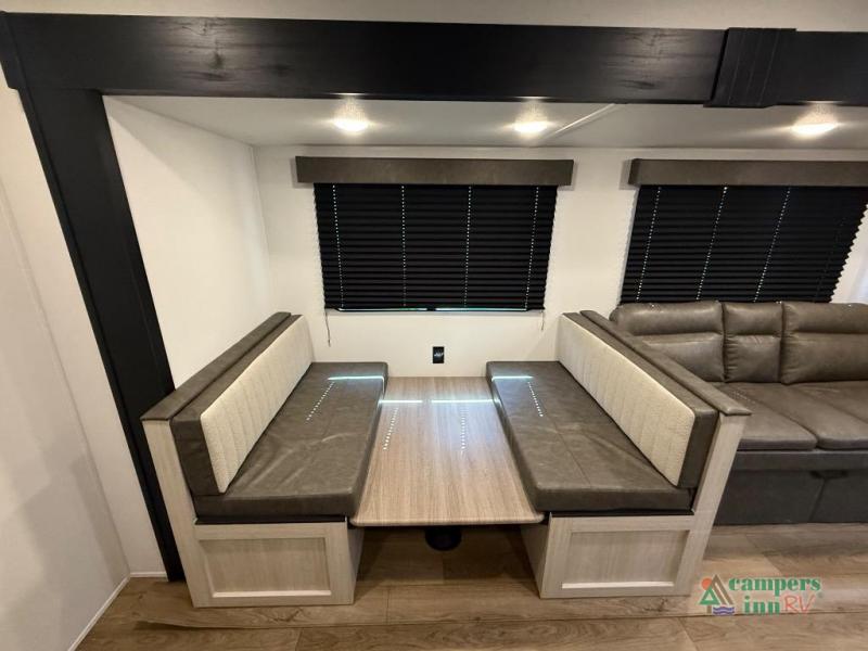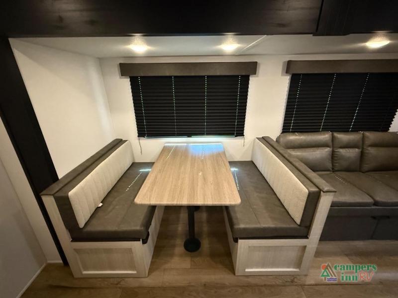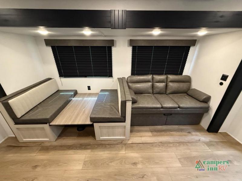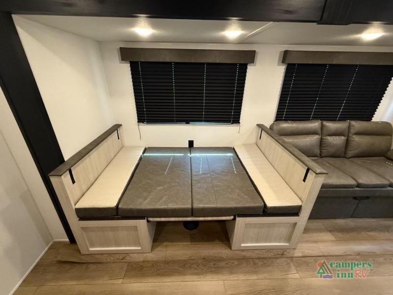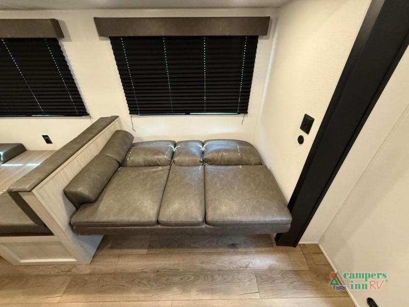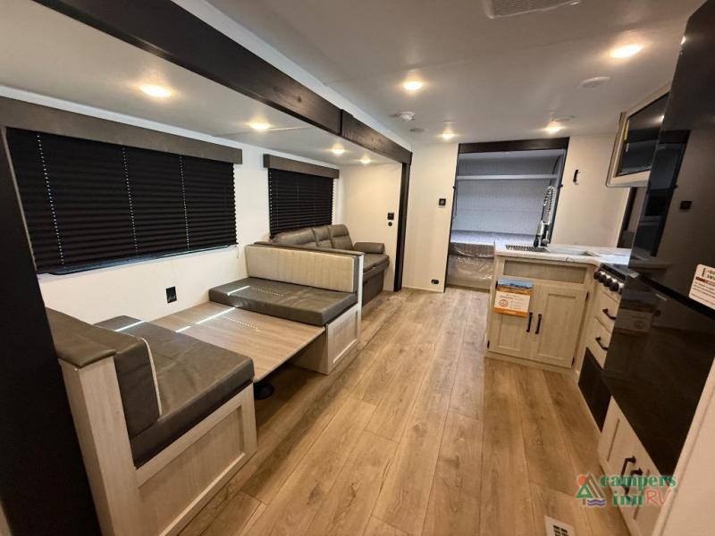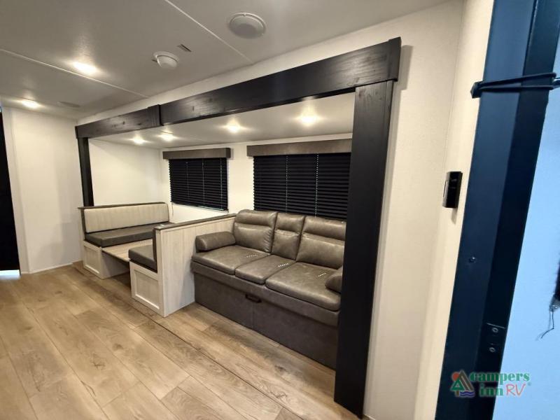 If you're looking for more space, this double axle unit features a large slide so you can walk about freely. Here, you'll find the booth dinette and sofa, which sit across from the optional TV if you want to enjoy movie nights. The full kitchen includes a stainless microwave and three burner cooktop to make meals, plus a pantry and 12V refrigerator for food storage. And an optional outside kitchen with a griddle can be added if you enjoy cooking outdoors! The kids or your guests will love the double-size bunks, and the full bath right beside the bunks includes a shower a seat for added comfort.