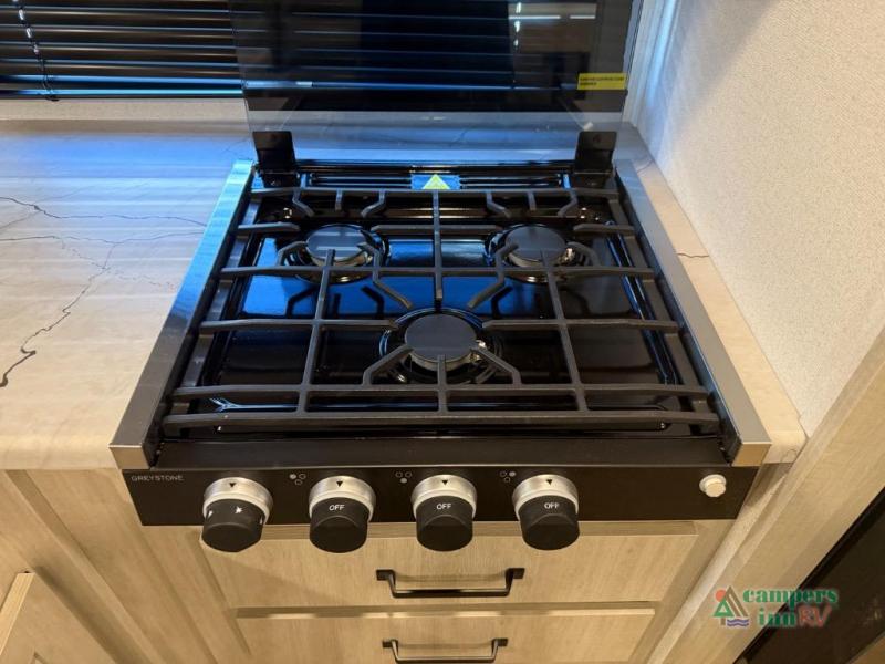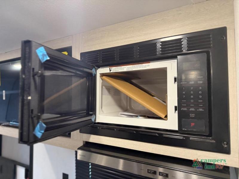 The kitchen is fully equipped with modern appliances, including a three-burner range, microwave, deep stainless-steel sink, and a 12-volt refrigerator. Ample pantry and cabinet space provide plenty of storage for extended trips. The bathroom includes a large shower with a built-in seat, sink, toilet, and linen storage.