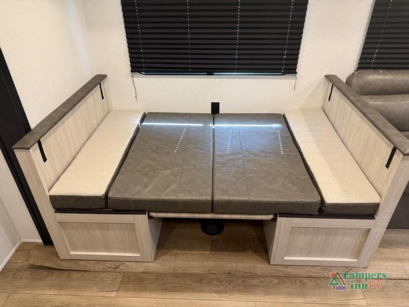 This unit sleeps up to eight people and includes a front private bedroom with a queen bed, as well as a rear bunkhouse with double-size bunks. The main living area benefits from a large slide-out, which expands the space and includes both a booth dinette and a jackknife sofa—both of which convert into additional sleeping areas.