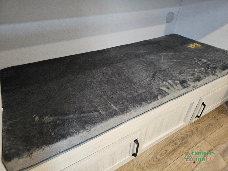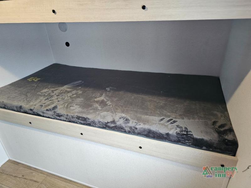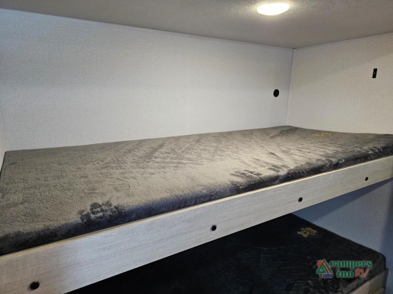 Spacious rear bunkhouse with a set of 38" x 76" bunks, and another set of bunks in their own slide out