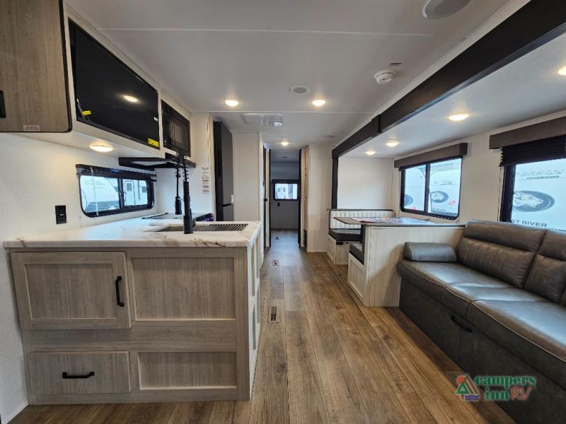 Booth dinette and sofa in the living area convert into additional sleeping spaces