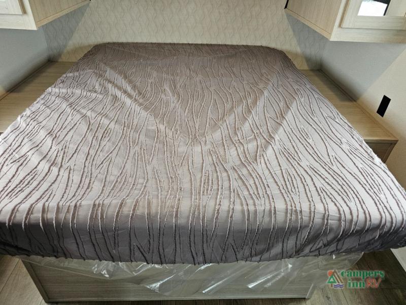 Front private bedroom with RV queen bed, dual shirt closets, and overhead storage