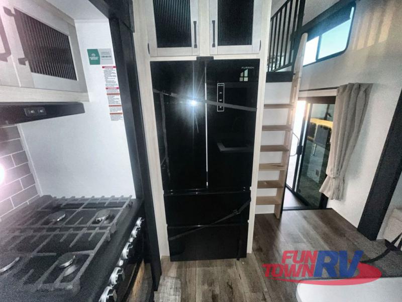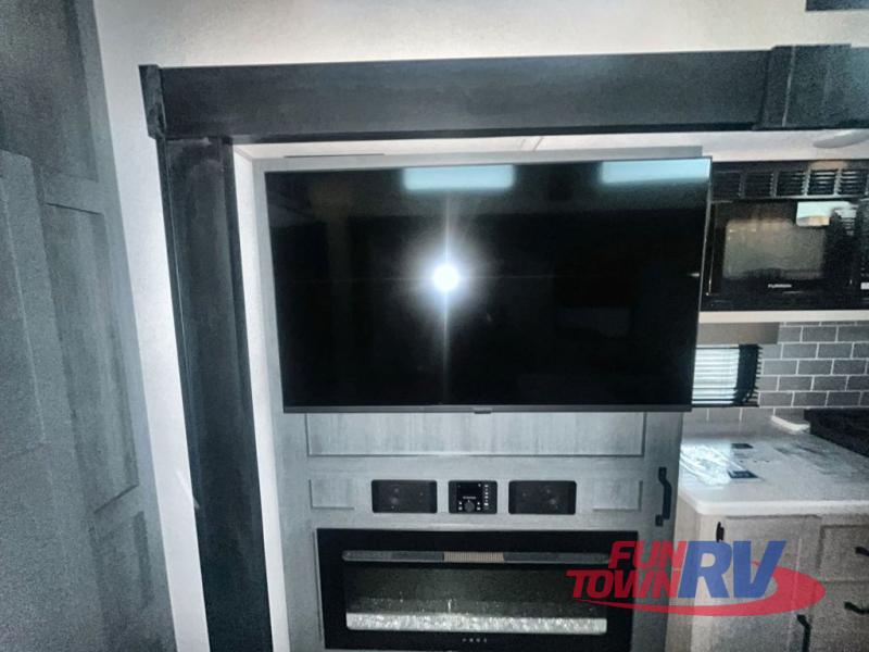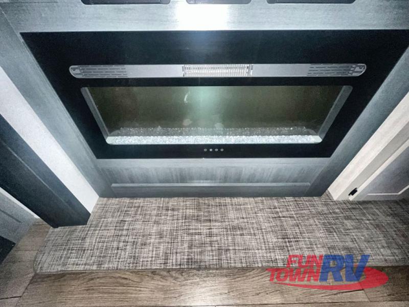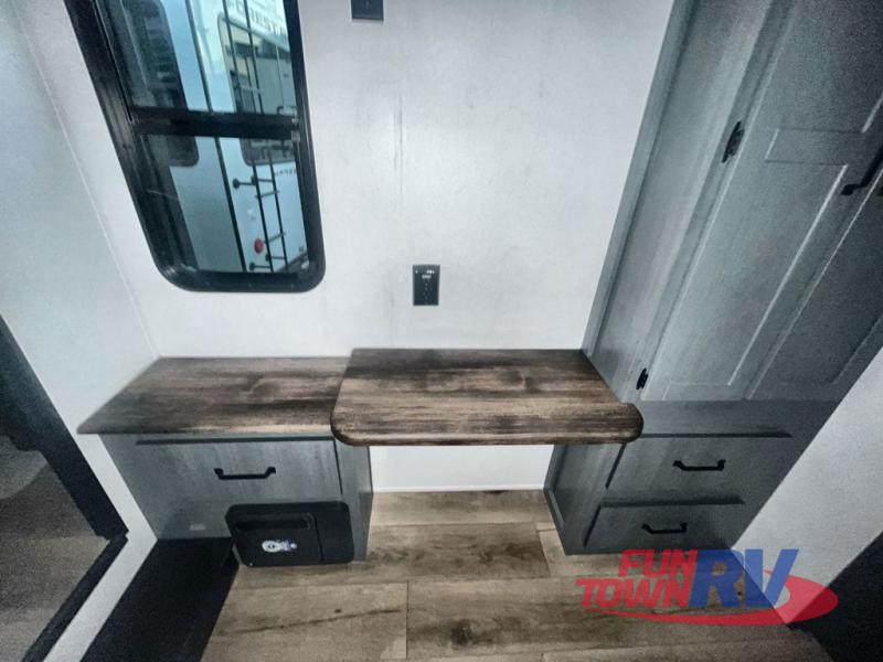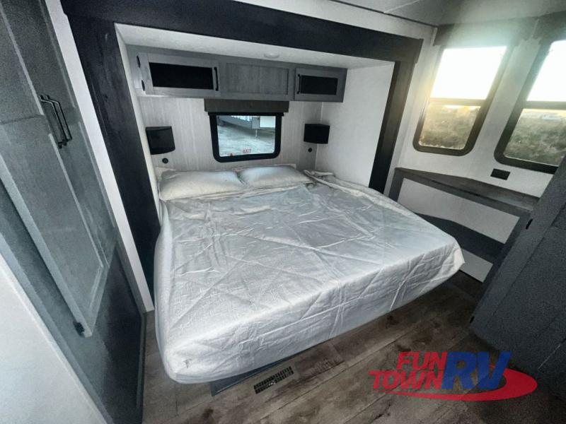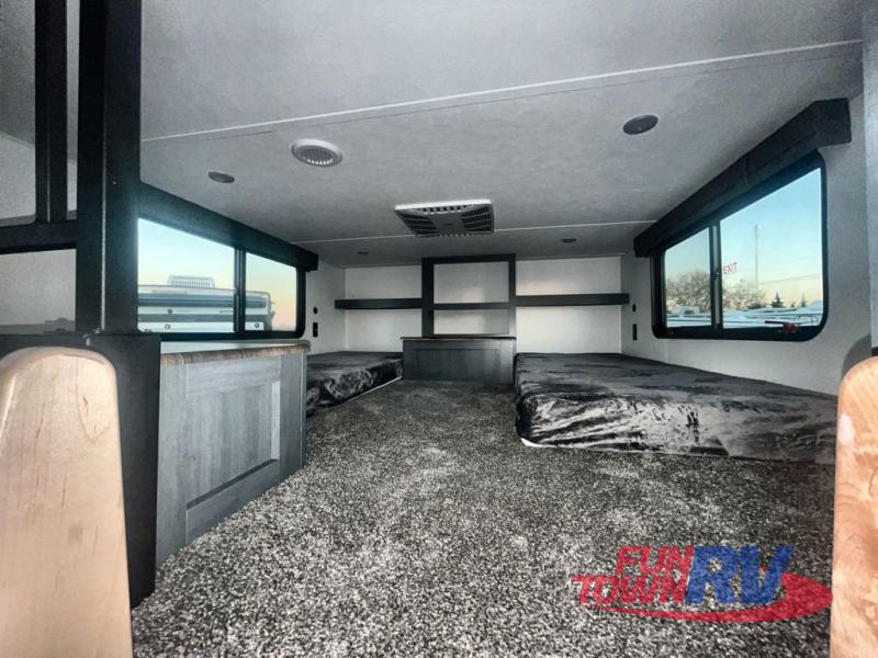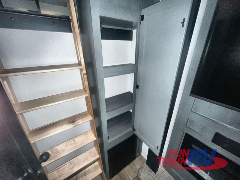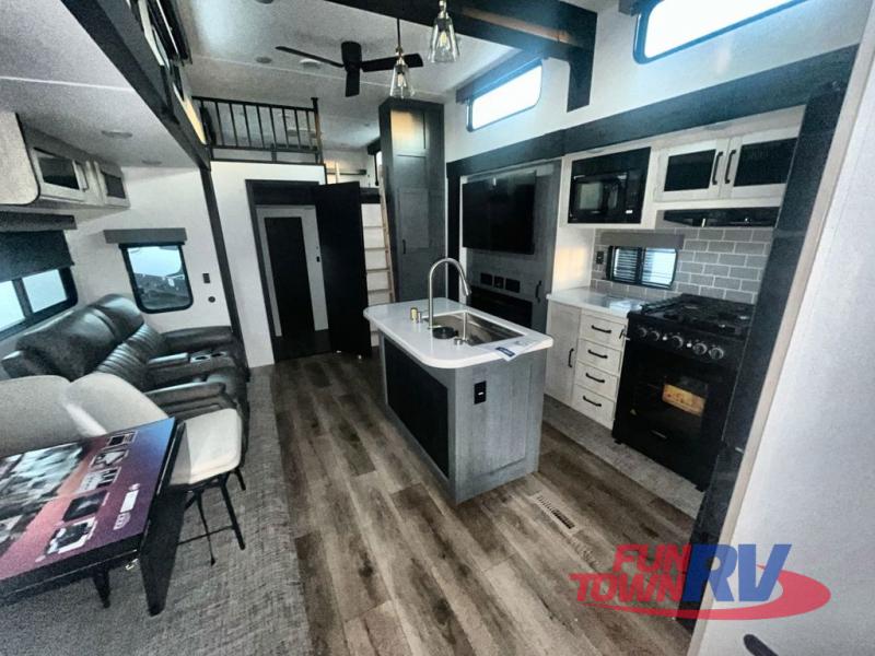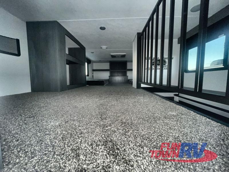 You won't believe the amount of comfort found in this destination trailer! There are two separate loft areas; one up front with a ladder, two bunk mats, storage space, and an optional fireplace, and one in the back with a ladder, two bunk mats, storage space, and a nightstand! On the main level, you'll find your own space in the front private bedroom, complete with a king bed slide, a countertop, dresser, and even washer and dryer prep. And a full bath is right next to the bedroom for easy nighttime use. Head to the full kitchen where you'll find all the appliances to cook meals, a kitchen island with an extension for more prep space, plus two pantries, one being hidden behind the TV! The comfort continues on in the rear master bedroom, complete with a queen bed slide, a desk with a chair, and a wardrobe for clothes. And the second full bath is found in the very back for added convenience!