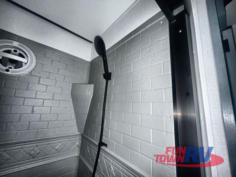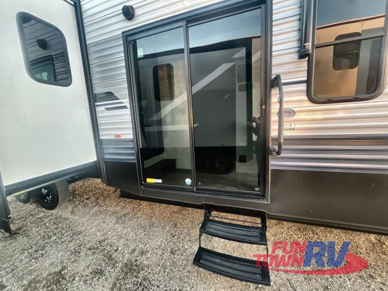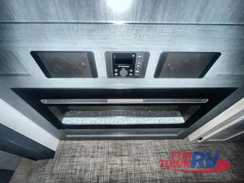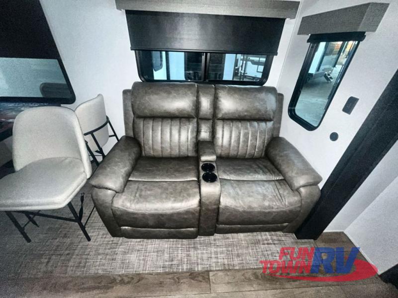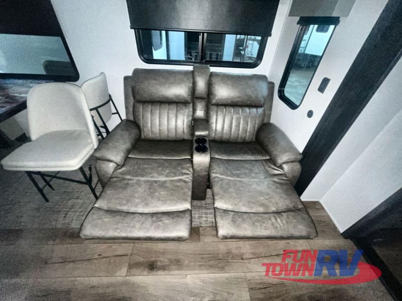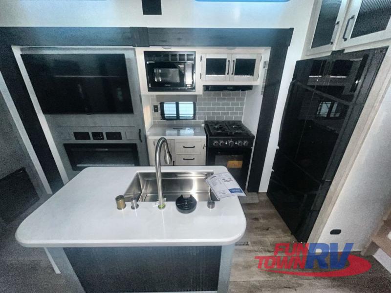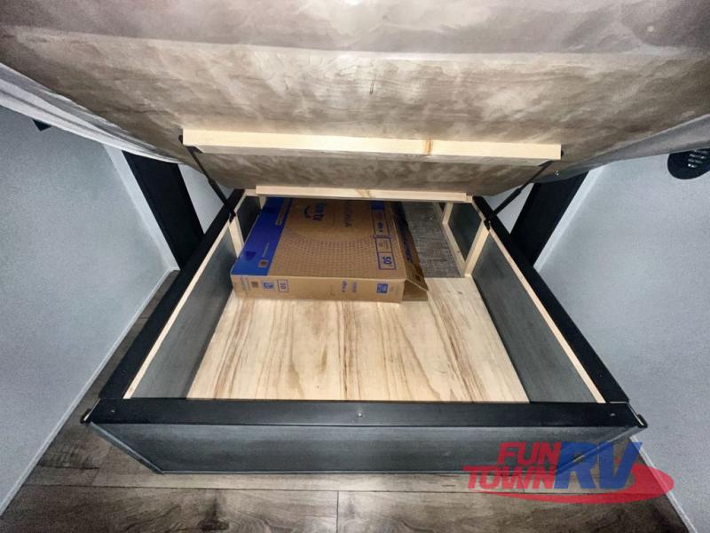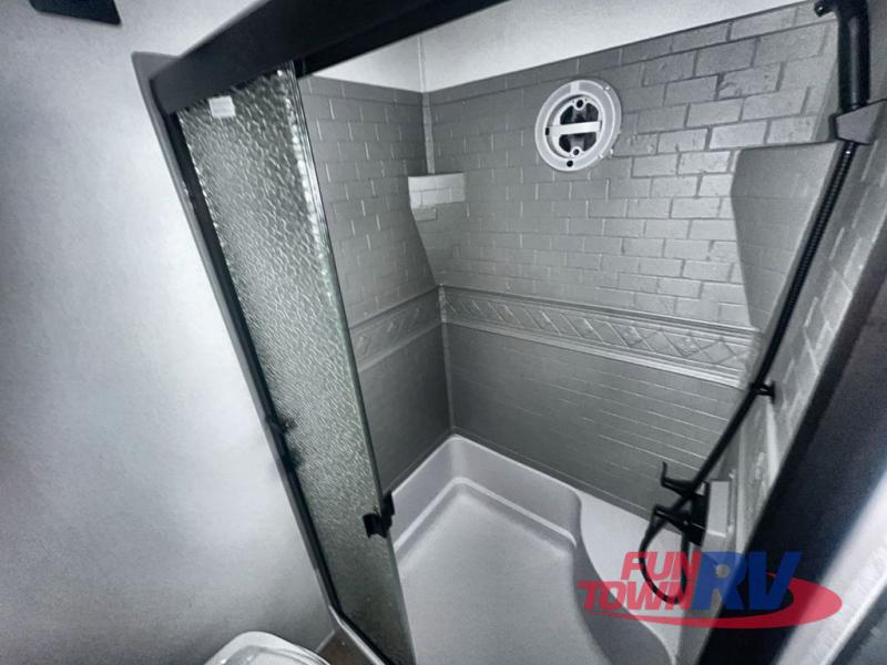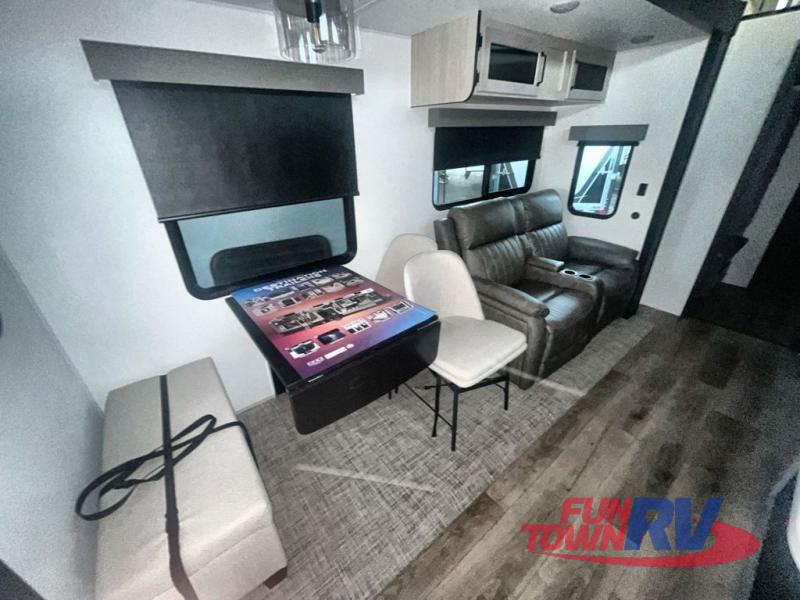 You won't believe the amount of comfort found in this destination trailer! There are two separate loft areas; one up front with a ladder, two bunk mats, storage space, and an optional fireplace, and one in the back with a ladder, two bunk mats, storage space, and a nightstand! On the main level, you'll find your own space in the front private bedroom, complete with a king bed slide, a countertop, dresser, and even washer and dryer prep. And a full bath is right next to the bedroom for easy nighttime use. Head to the full kitchen where you'll find all the appliances to cook meals, a kitchen island with an extension for more prep space, plus two pantries, one being hidden behind the TV! The comfort continues on in the rear master bedroom, complete with a queen bed slide, a desk with a chair, and a wardrobe for clothes. And the second full bath is found in the very back for added convenience!