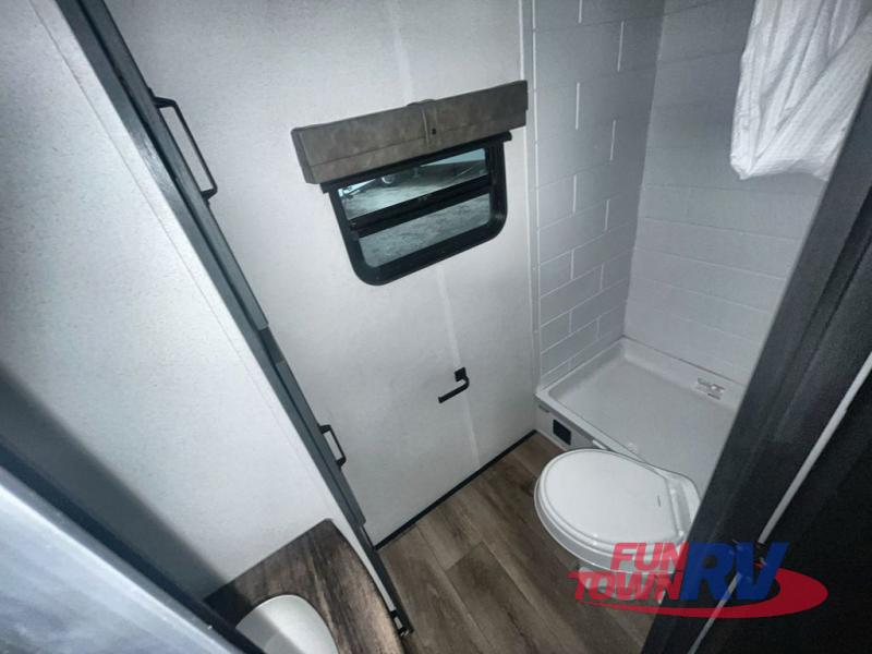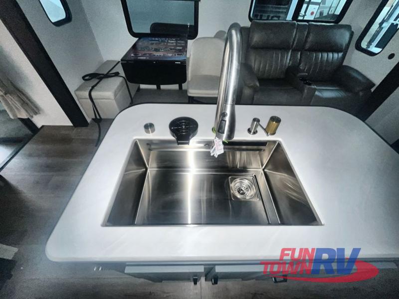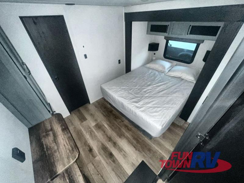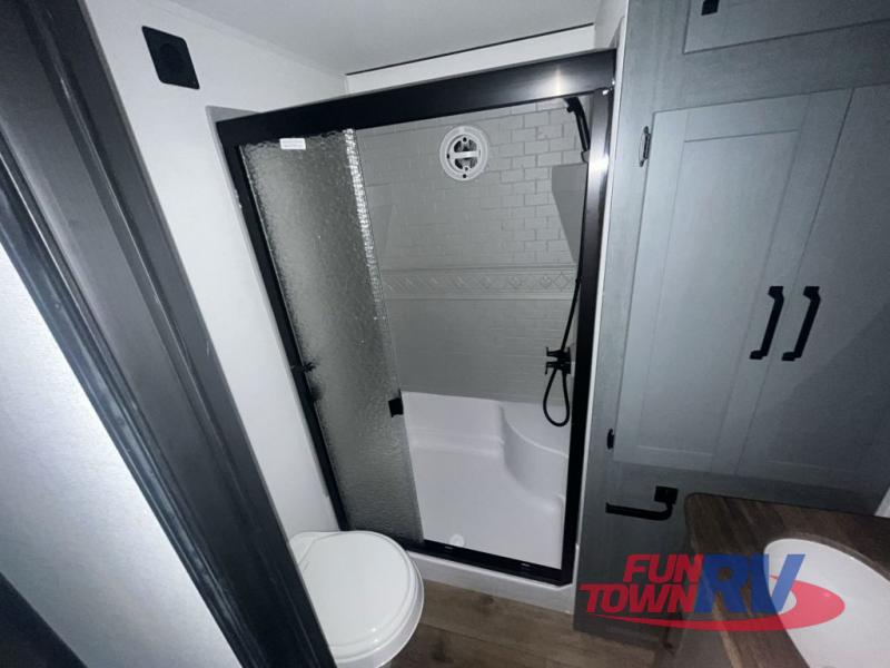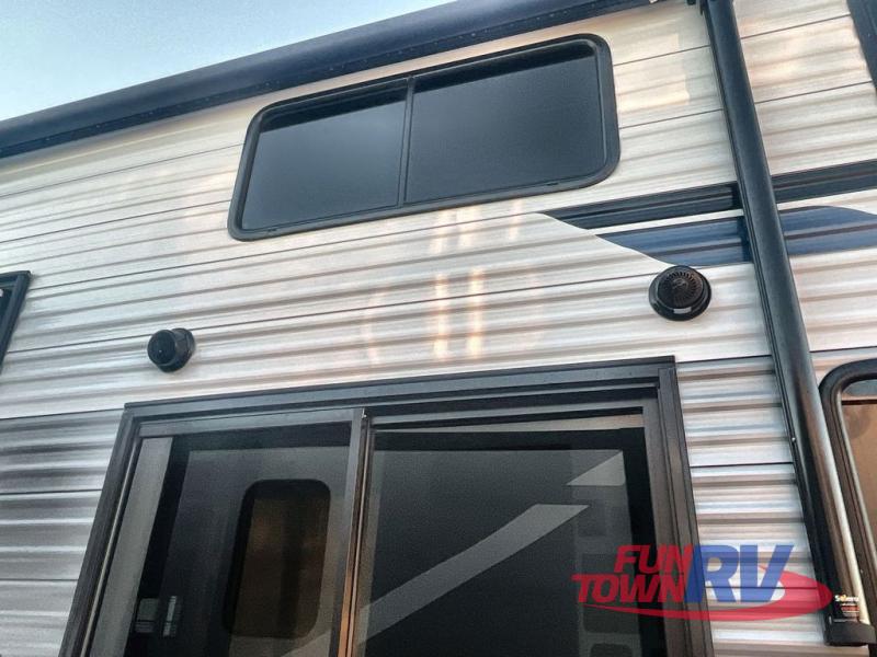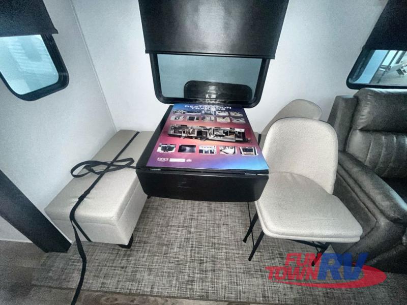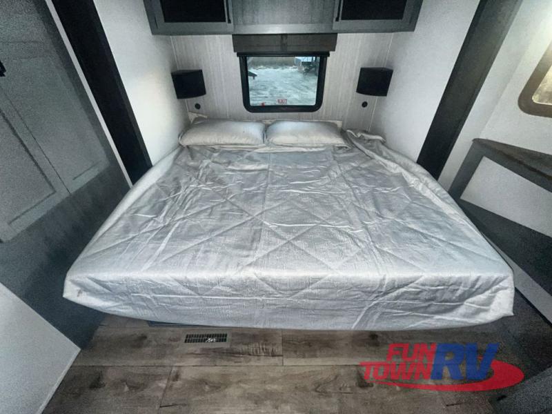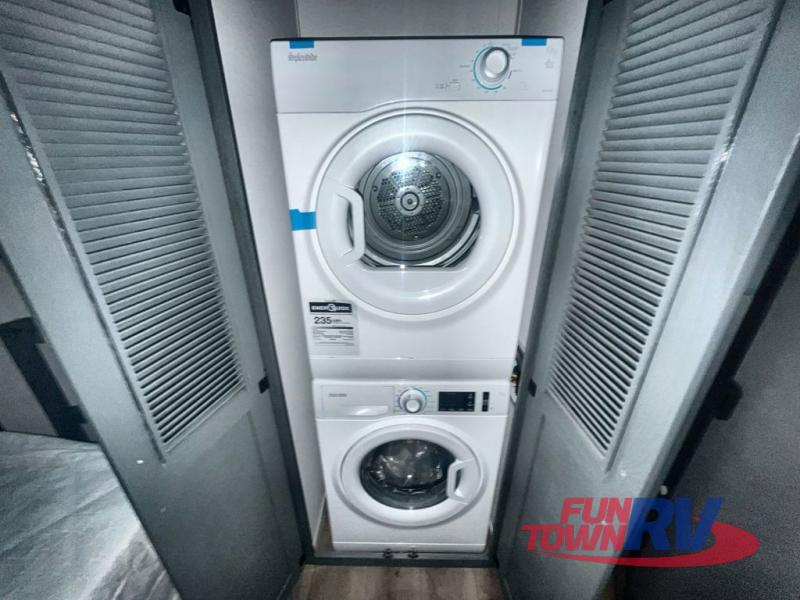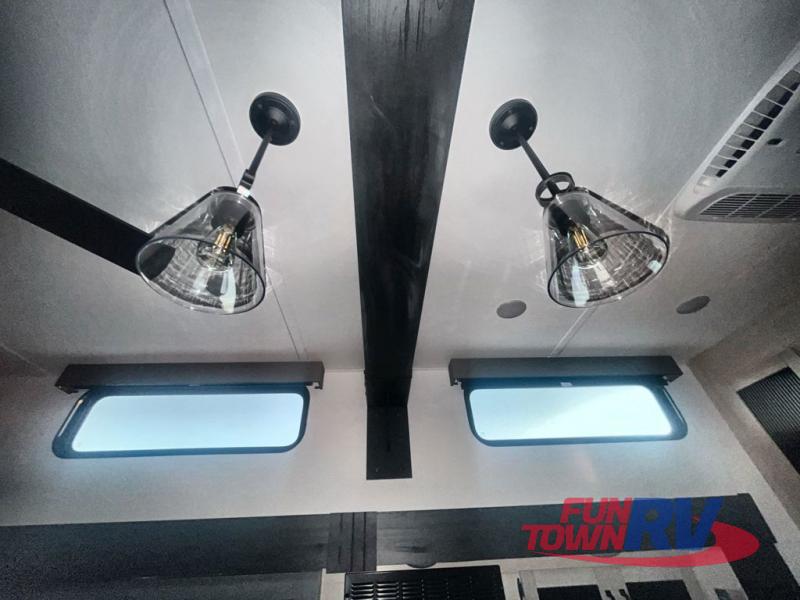 You won't believe the amount of comfort found in this destination trailer! There are two separate loft areas; one up front with a ladder, two bunk mats, storage space, and an optional fireplace, and one in the back with a ladder, two bunk mats, storage space, and a nightstand! On the main level, you'll find your own space in the front private bedroom, complete with a king bed slide, a countertop, dresser, and even washer and dryer prep. And a full bath is right next to the bedroom for easy nighttime use. Head to the full kitchen where you'll find all the appliances to cook meals, a kitchen island with an extension for more prep space, plus two pantries, one being hidden behind the TV! The comfort continues on in the rear master bedroom, complete with a queen bed slide, a desk with a chair, and a wardrobe for clothes. And the second full bath is found in the very back for added convenience!
