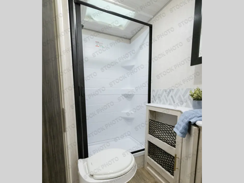 This travel trailer offers a great flexible floorplan. The living area sofa hides a queen-size Murphy bed which can be folded down at night, giving you full use of the room during the day. At the rear is a pair of double-size bunks which provide a spacious private sleeping area for children or guests. The booth dinette can also be used for an additional bed as needed. An efficient kitchen includes a convection microwave and cooktop to cook meals each day, along with a 12V black glass refrigerator and pantry for food storage.