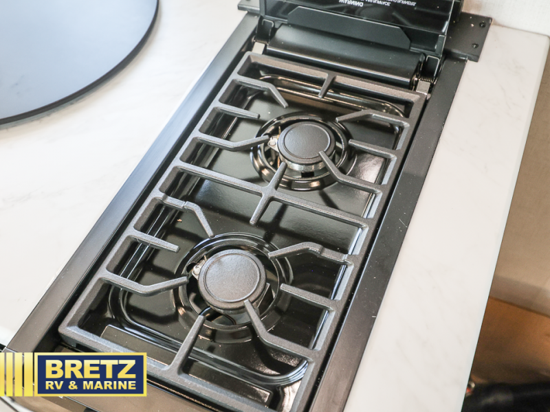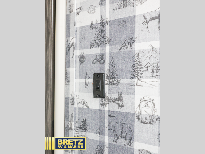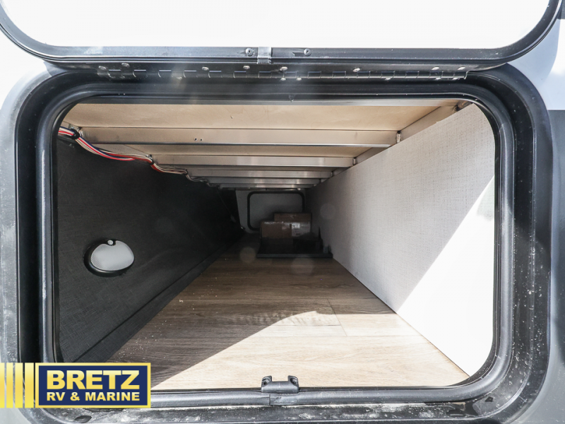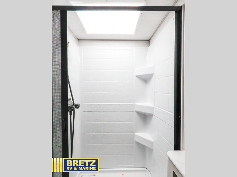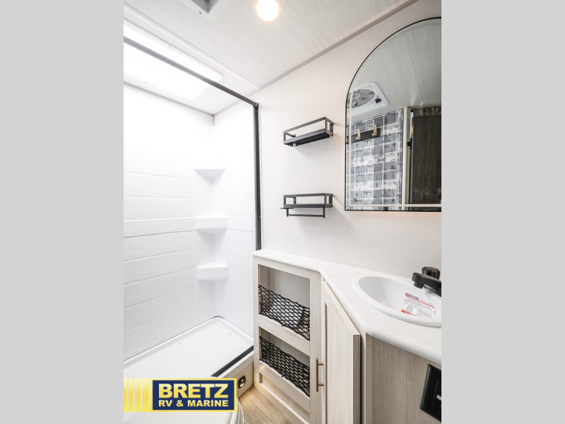 This travel trailer offers a great flexible floorplan. The living area sofa hides a queen-size Murphy bed which can be folded down at night, giving you full use of the room during the day. At the rear is a pair of double-size bunks which provide a spacious private sleeping area for children or guests. The booth dinette can also be used for an additional bed as needed. An efficient kitchen includes a convection microwave and cooktop to cook meals each day, along with a 12V black glass refrigerator and pantry for food storage.