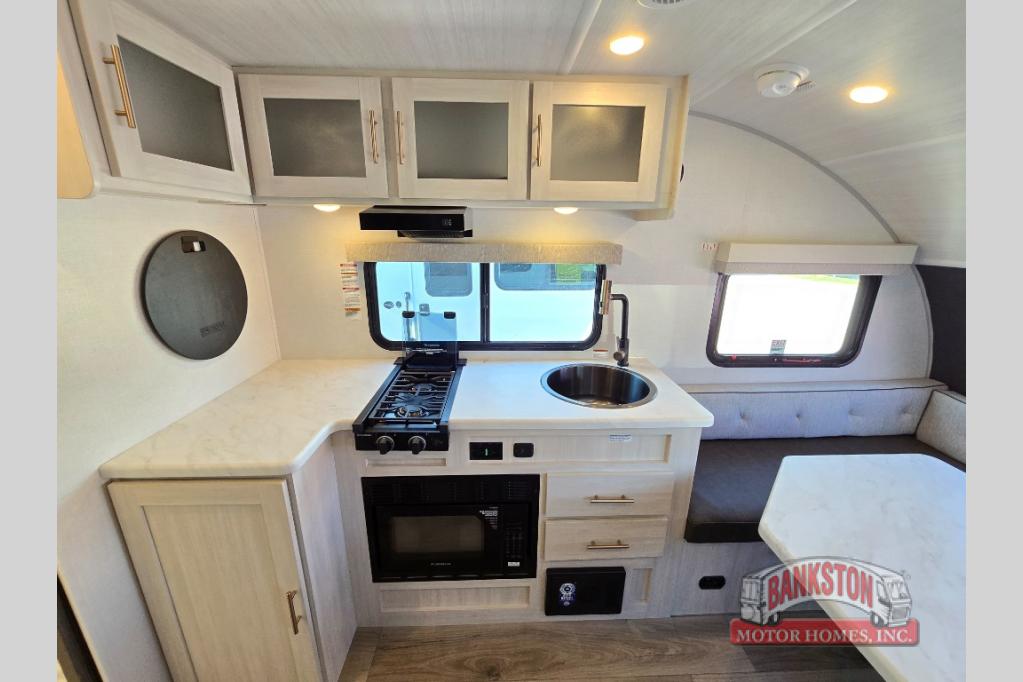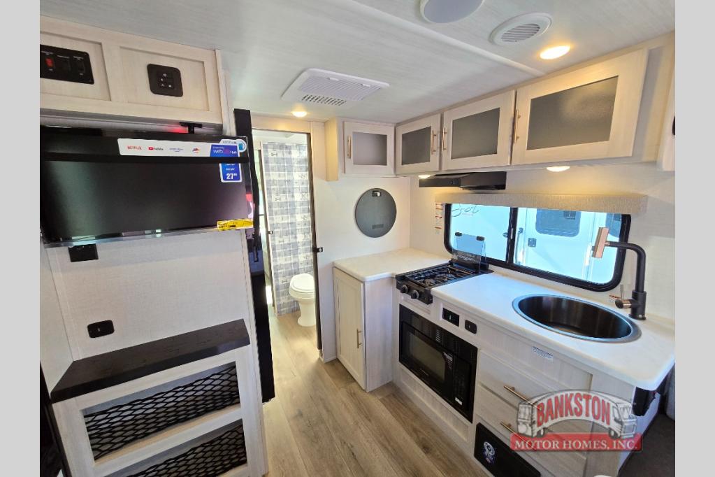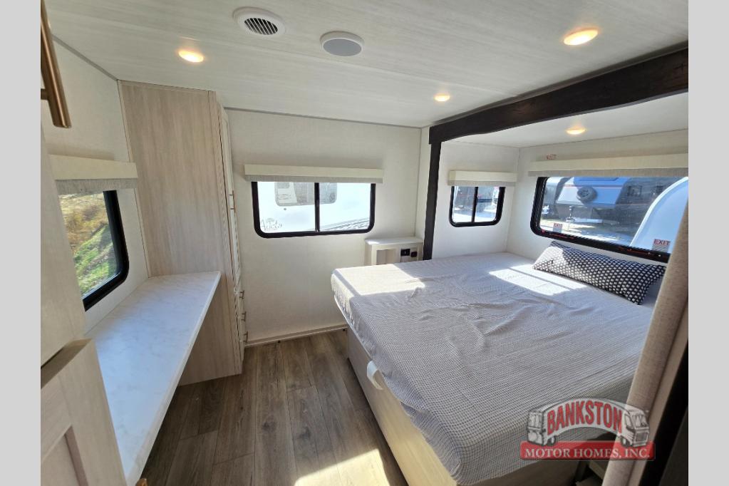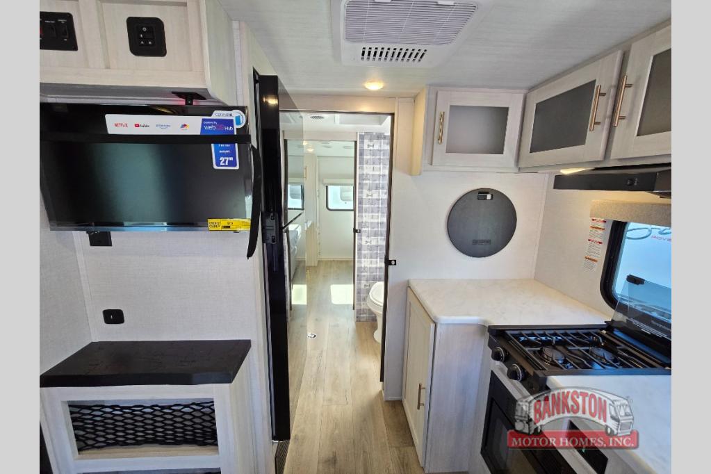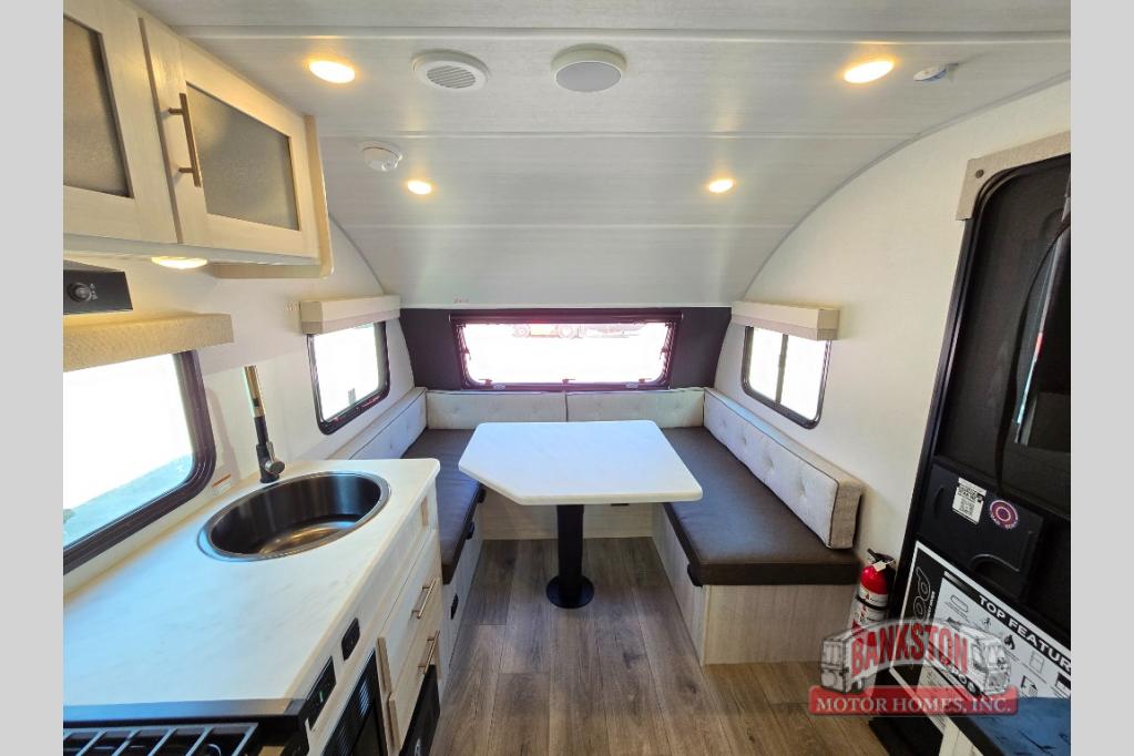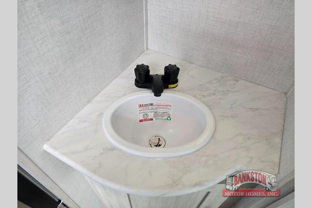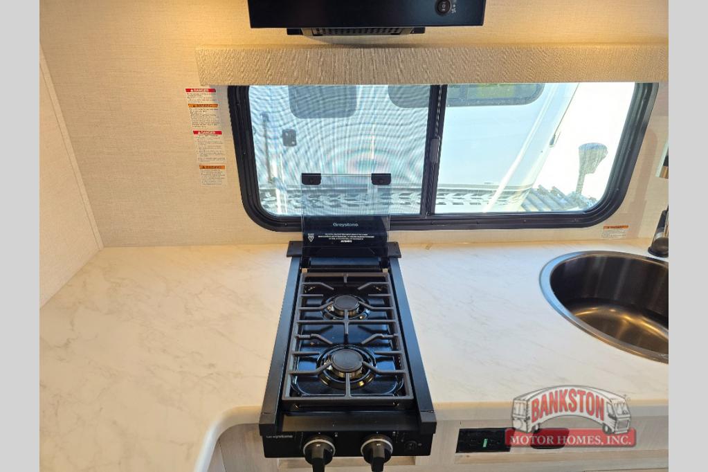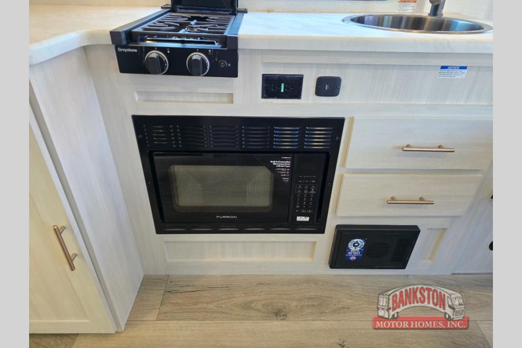 Time spent in this travel trailer will be time well spent! You will have all the comforts of home, including a private bedroom with two wardrobes, a queen bed, and a desk/dresser that will allow you to get some work done if needed. The front U-shaped dinette with a swivel dinette table will double as dining and sleeping space, and the walk-through bath will be easily accessible for everyone to use. You can prepare meals on the two burner cooktop, or use the convection microwave. There is also a 12V black glass 12V refrigerator for food storage and plenty of counter space to prep meals.