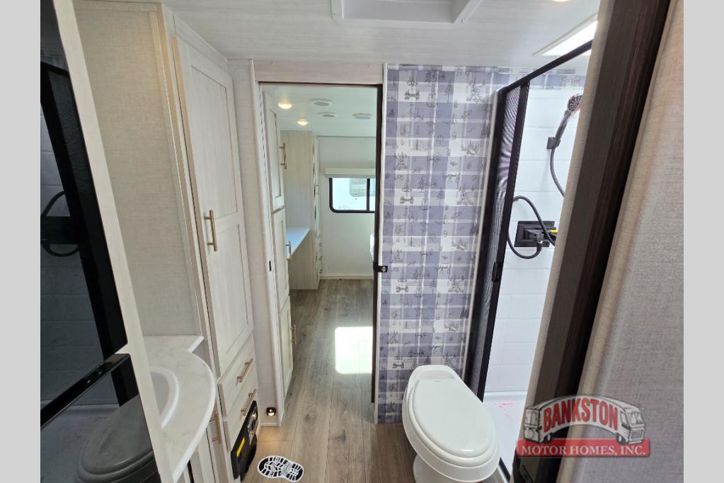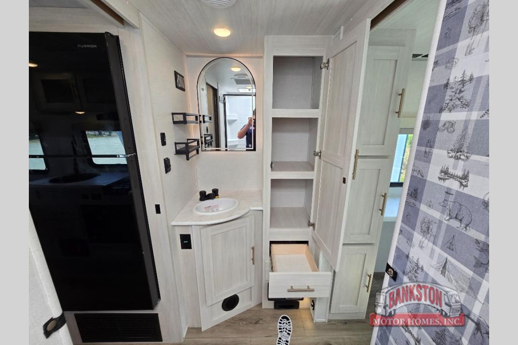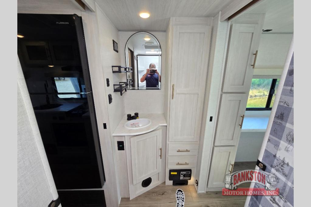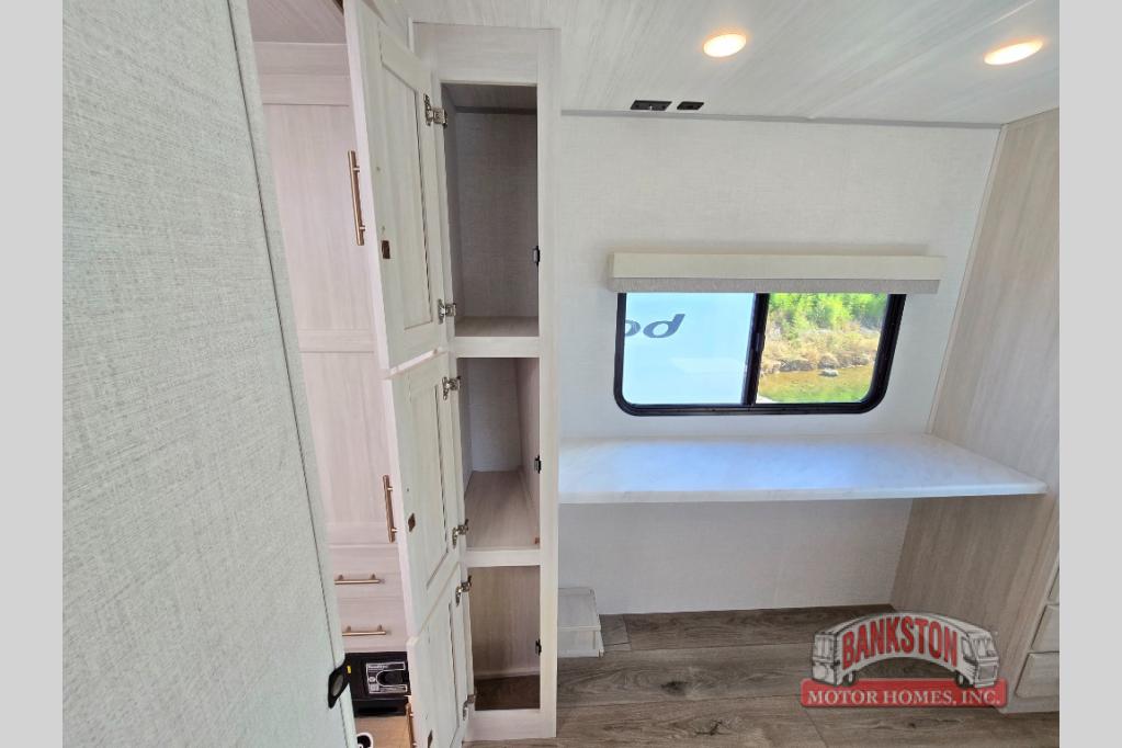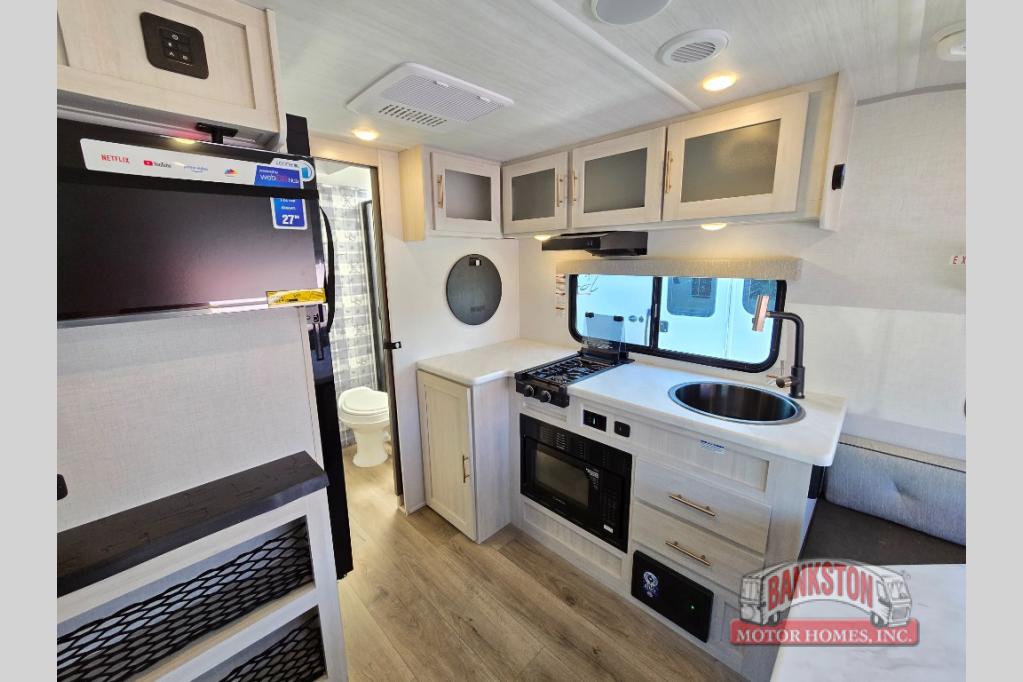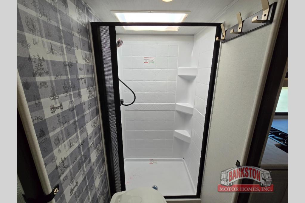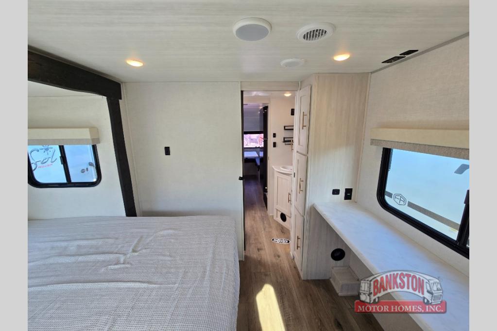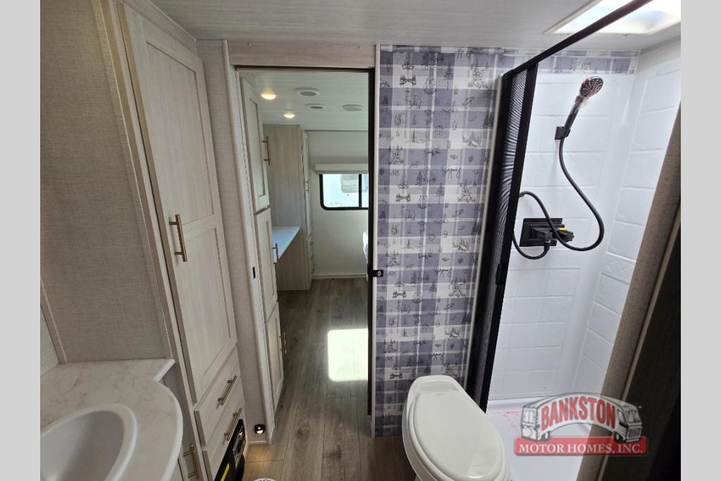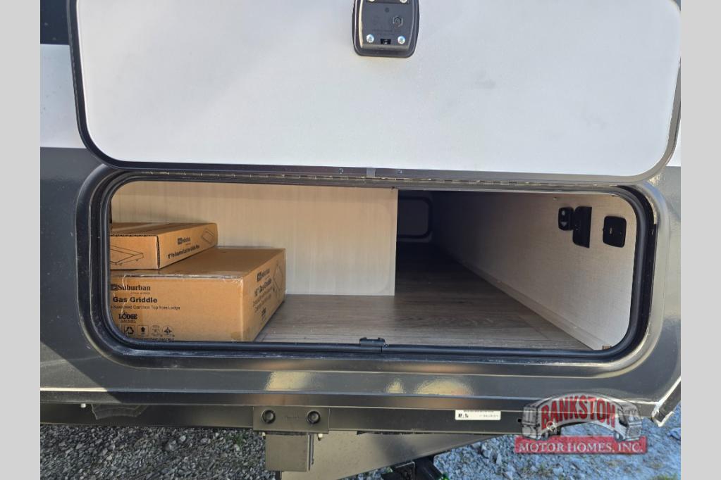 Time spent in this travel trailer will be time well spent! You will have all the comforts of home, including a private bedroom with two wardrobes, a queen bed, and a desk/dresser that will allow you to get some work done if needed. The front U-shaped dinette with a swivel dinette table will double as dining and sleeping space, and the walk-through bath will be easily accessible for everyone to use. You can prepare meals on the two burner cooktop, or use the convection microwave. There is also a 12V black glass 12V refrigerator for food storage and plenty of counter space to prep meals.