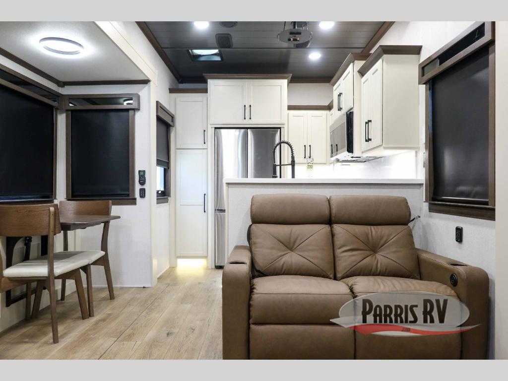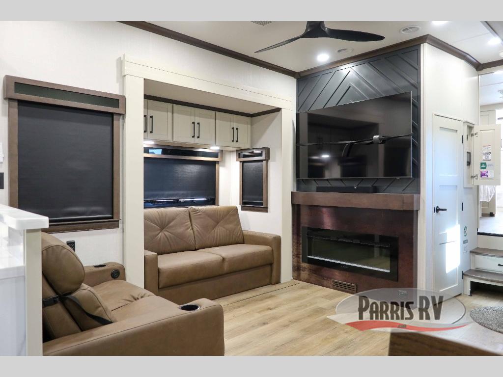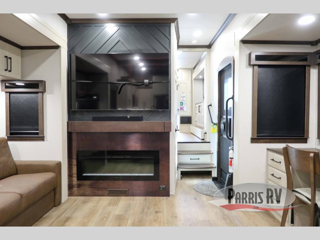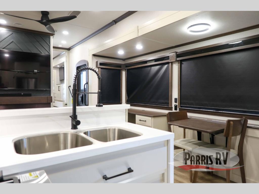 Show your family a good time with this RiverStone fifth wheel! You will get to stay in a super comfortable master suite at the front of this unit which has a dual-sink vanity in the full bathroom. The bedroom offers you a king-size bed that you can rest on while you watch the 40" LED TV across from you, and there is a half bathroom just outside the bedroom for your friends or family to use. If you've decided to bring work with you on the road, you'll be grateful to find a desk in the living area, and the pull-out dinette is a great place to sit down for meals. Work your magic in the kitchen and prepare something delicious on the four-burner range for everyone to eat.