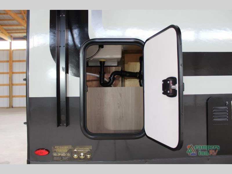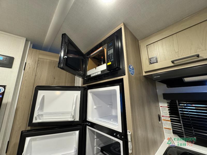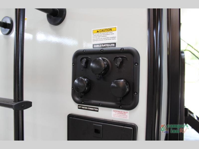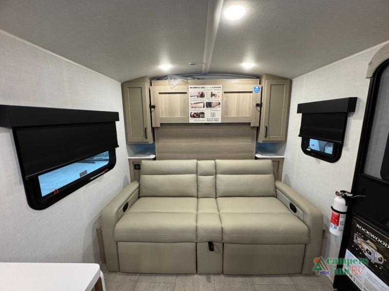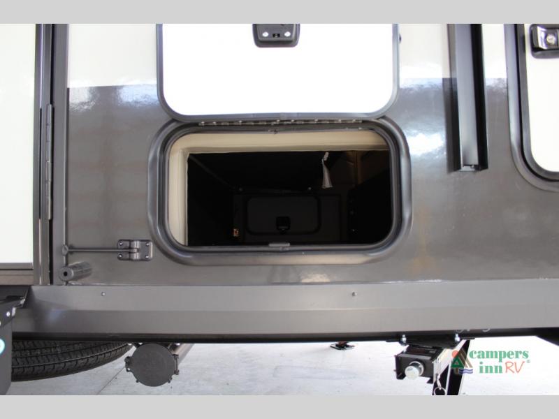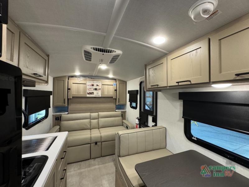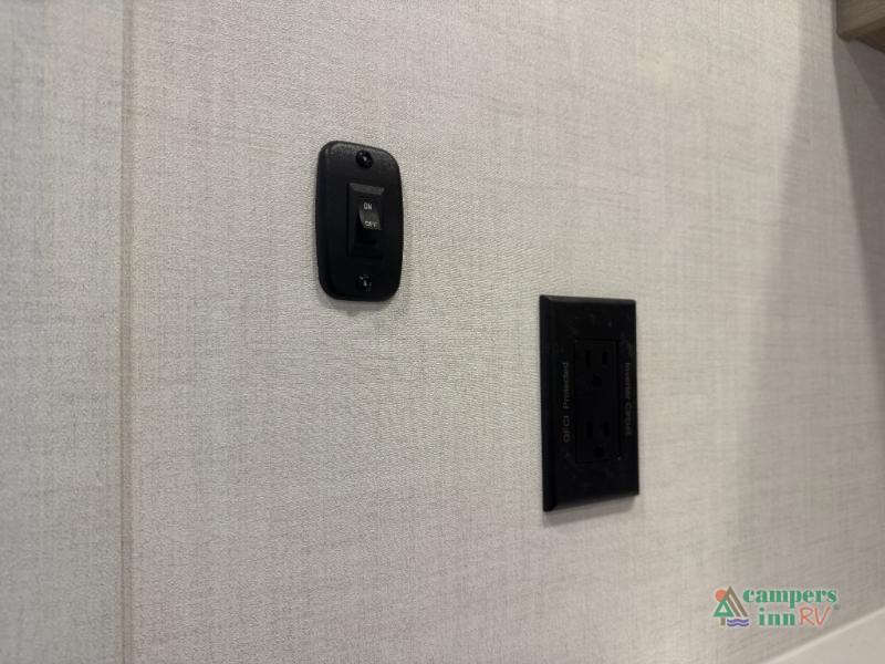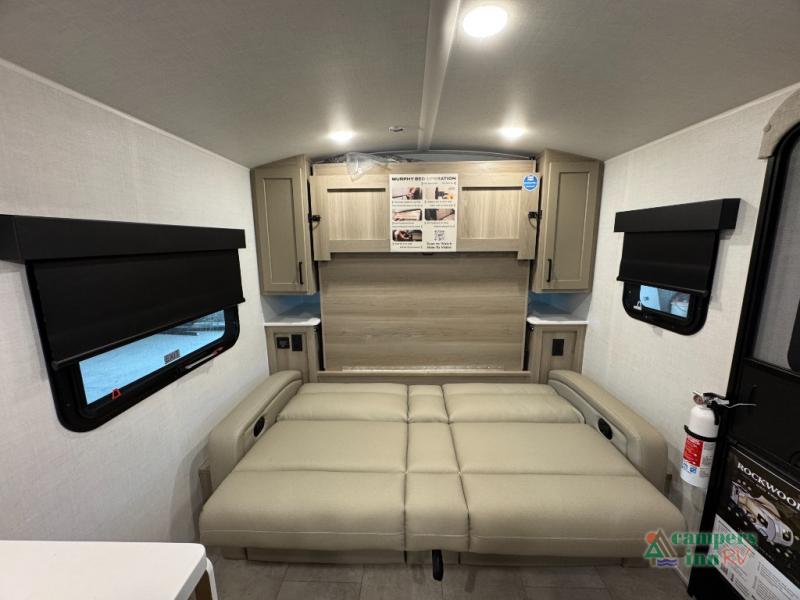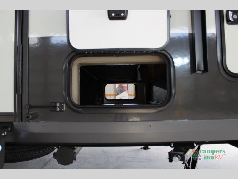 You will love how versatile this travel trailer is thanks to the Murphy bed up front. After you've had a great night's rest, just fold it up to relax on the 72" sofa. This will give the chef more space in the morning to prepare breakfast on the three burner cooktop or in the microwave oven. There is a 32" booth dinette to dine at, or you may just want to take your plate outdoors under the 14' power awning. The full rear bath includes a large linen closet to store clean towels and there is a Showermiser Water Saver you are sure to appreciate. You will appreciate a pass-through storage, plus additional exterior storage so you can bring along hiking gear, water tubes, and fishing poles! The optional Power Package available on this model includes three 200W solar panels, an 11,000 BTU Coleman Mach soft start A/C, two smart remotes, and more off-grid features!