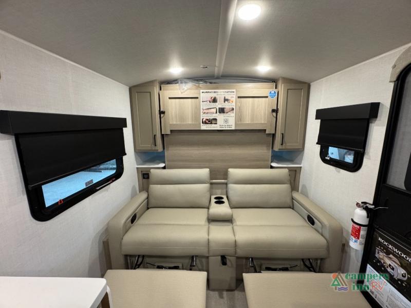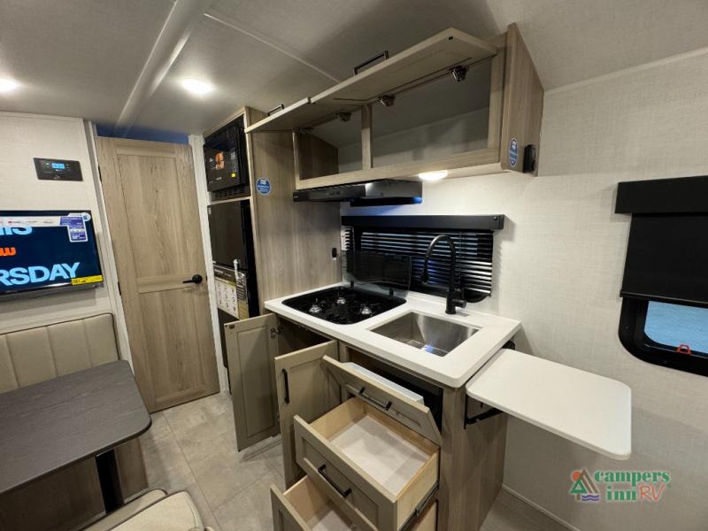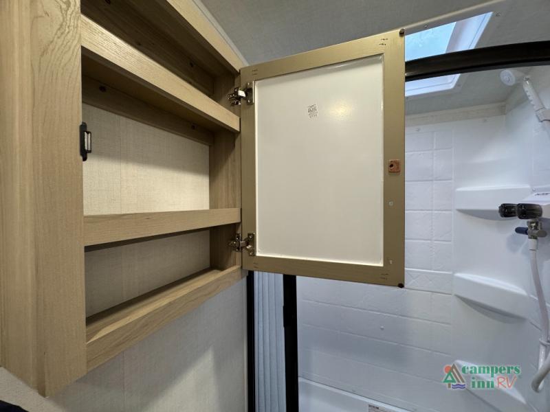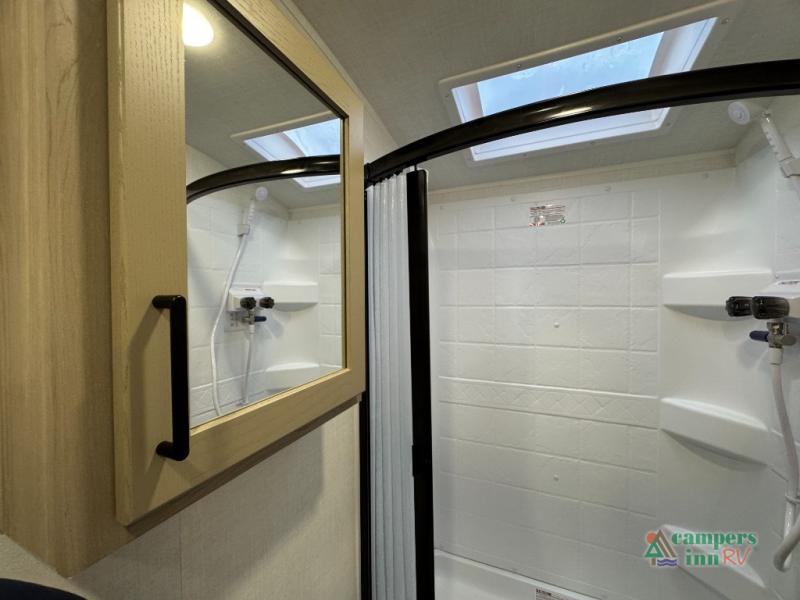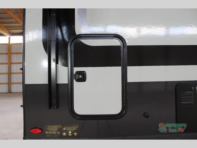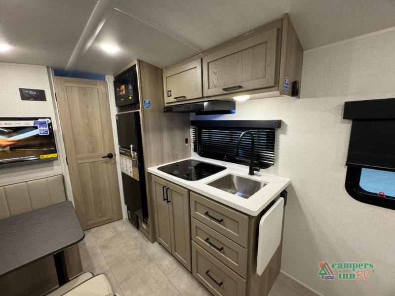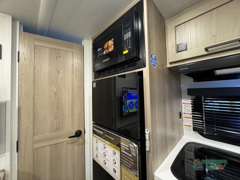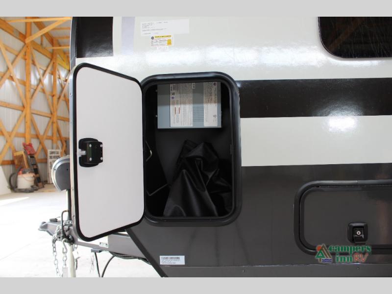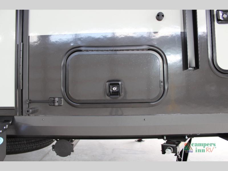 You will love how versatile this travel trailer is thanks to the Murphy bed up front. After you've had a great night's rest, just fold it up to relax on the 72" sofa. This will give the chef more space in the morning to prepare breakfast on the three burner cooktop or in the microwave oven. There is a 32" booth dinette to dine at, or you may just want to take your plate outdoors under the 14' power awning. The full rear bath includes a large linen closet to store clean towels and there is a Showermiser Water Saver you are sure to appreciate. You will appreciate a pass-through storage, plus additional exterior storage so you can bring along hiking gear, water tubes, and fishing poles! The optional Power Package available on this model includes three 200W solar panels, an 11,000 BTU Coleman Mach soft start A/C, two smart remotes, and more off-grid features!
