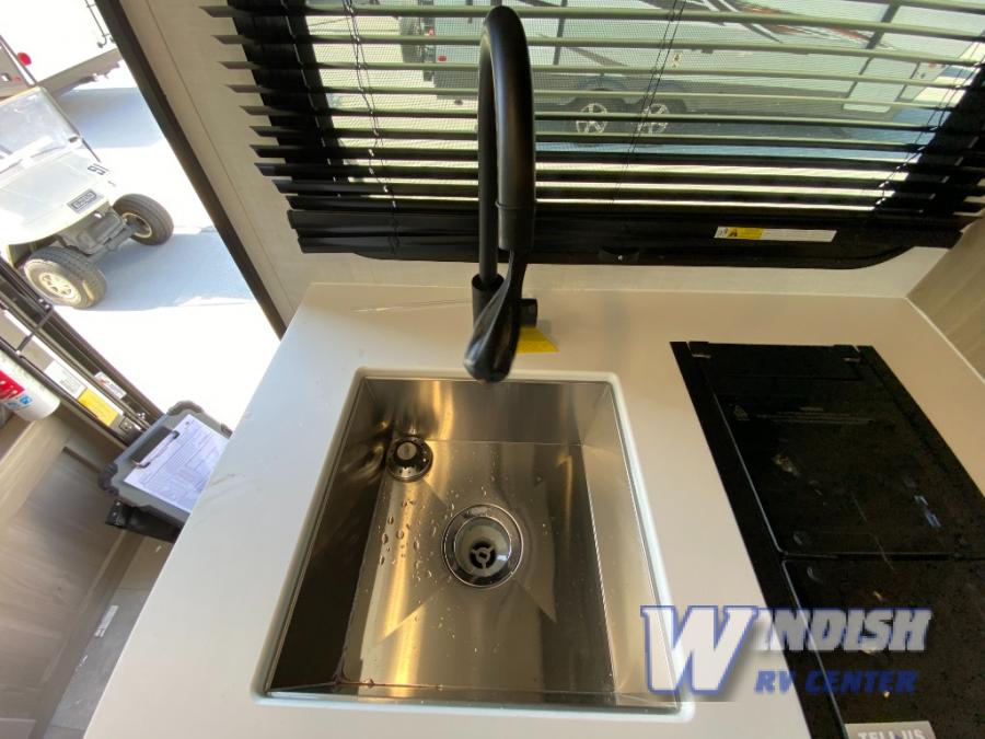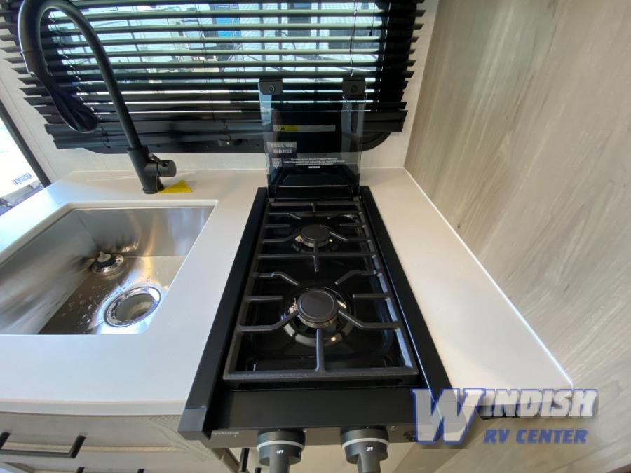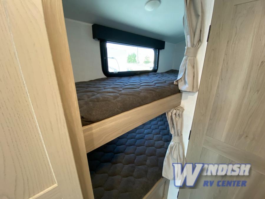 You're going to love camping with your family or friends in this spacious bunk model! The bunk beds will be perfect for little ones, while you take the front full-size bed. There is also a 44" booth dinette within the slide out for additional sleeping and seating space. The kitchen includes everything the chef will need to prepare meals each day, including a recessed cooktop, microwave oven, and a 12V refrigerator for perishables. If the weather is nice, you may just find the chef outdoors cooking on the outside griddle under the 14' power awning. And check out the exterior bike door that will be perfect for bikes, luggage, or extra camp gear. The optional Power Package available on this model includes three 200W solar panels, a 460 Ah Mastervolt MLI lithium-ion battery, two smart remotes, and more off-grid features!