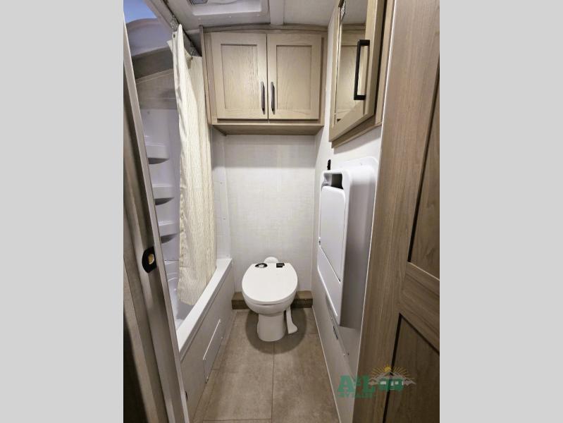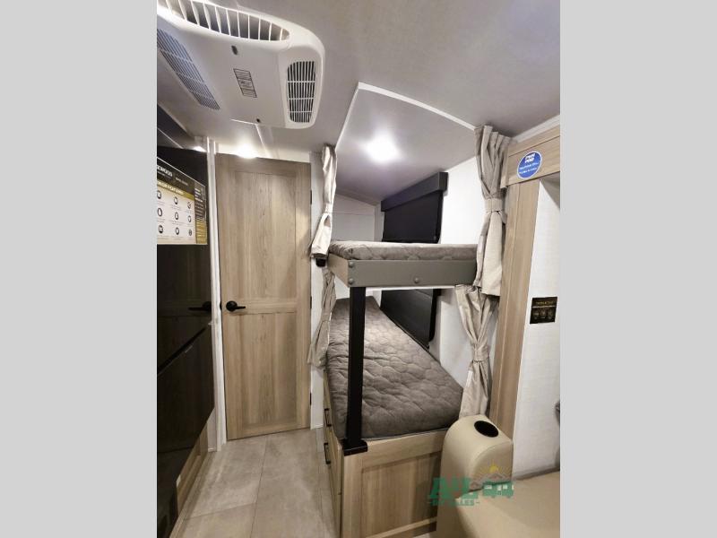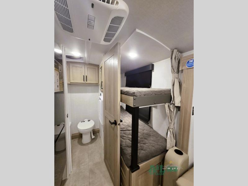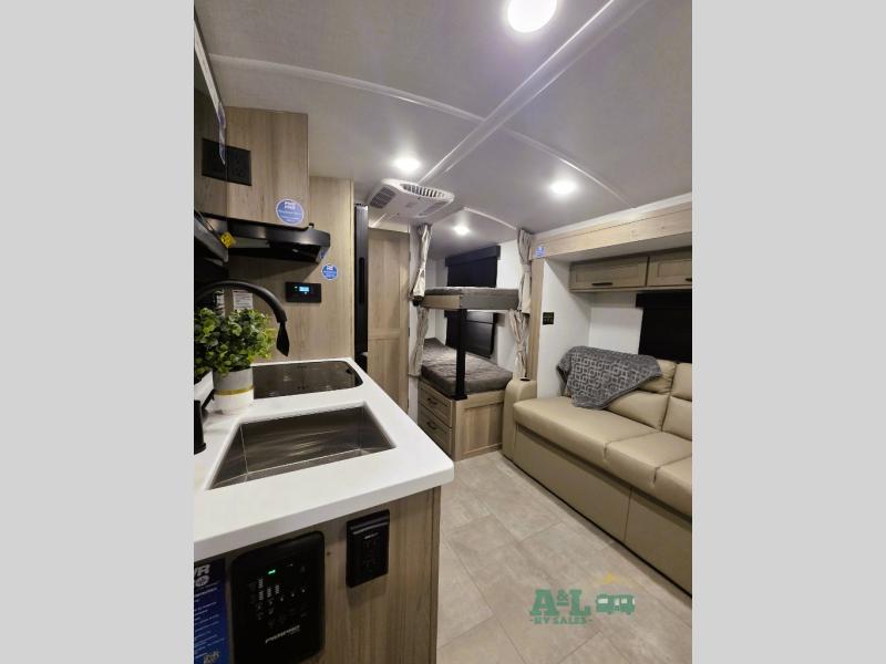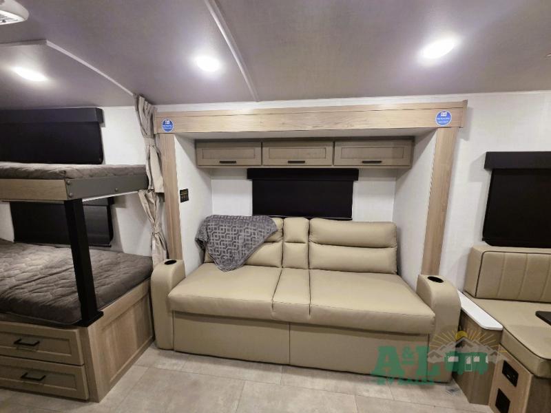 Perfect for families, couples, or friends, this trailer offers a great balance of comfort and practicality! Sleeping spots can be found in the bunk beds, which provide a cozy sleeping spot for kids or guests, while the 54” x 74” Murphy bed offers a spacious and comfortable sleeping area for two. Moreover, the kitchen is equipped with a three-burner cooktop for gourmet meals, a convection microwave for quick and easy cooking, and a fridge. The 39” dinette provides a comfortable spot for meals and snacks, perfect for enjoying quality time with family and friends. The 30" x 15" table provides additional space for dining, working, or playing games, and the sofa provides a comfortable seating area for relaxation and socializing, plus, the full bathroom provides a convenient spot to freshen up after a long day of exploring.