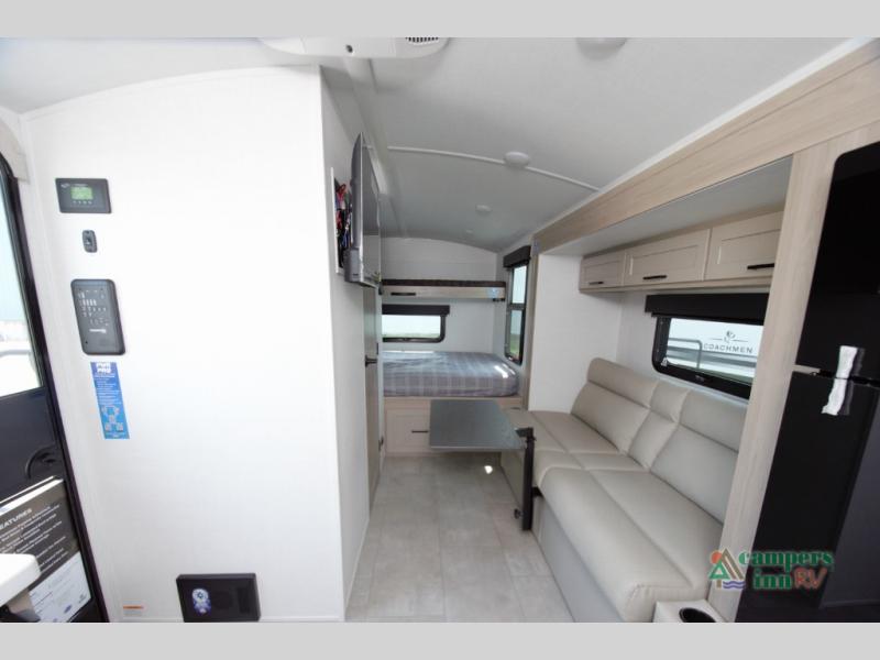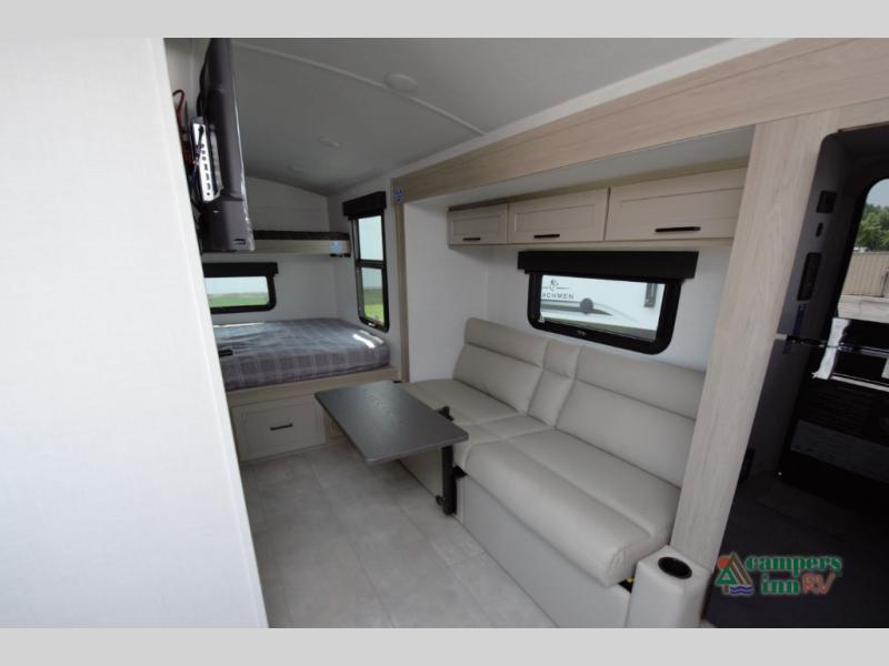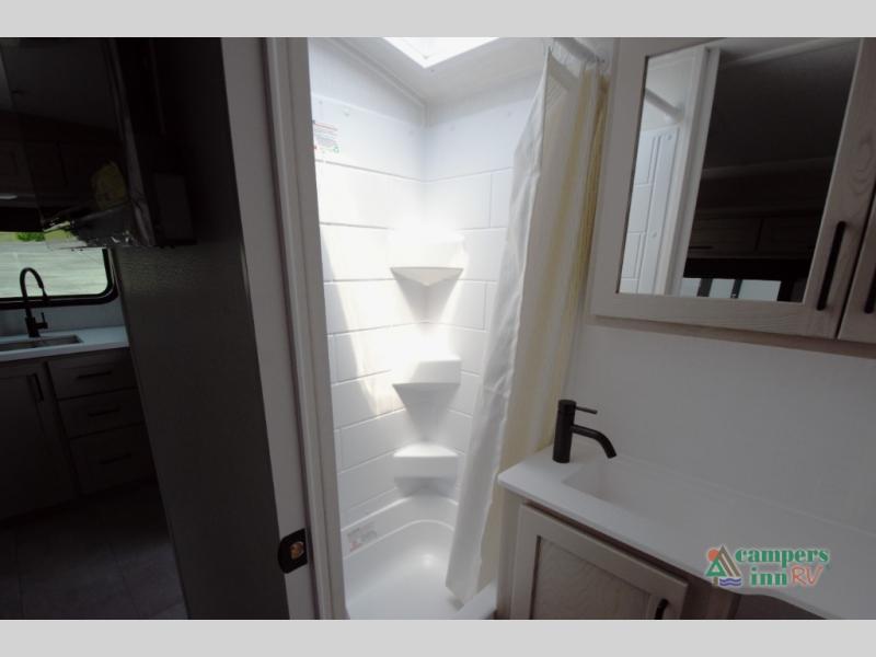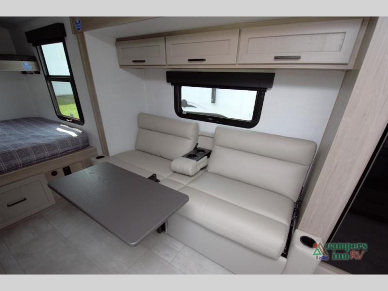 The slide out sofa provides space to relax and includes built in cupholders. Enjoy movie nights with the 32 inch 12V TV. The front kitchen features a 12V refrigerator, microwave, gas oven, and plenty of prep space for daily meals. The full rear bath gives you privacy and convenience on every trip.