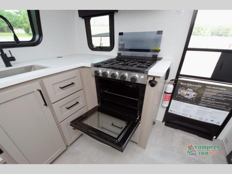 Front Kitchen with Gas Oven, Microwave, and 12V Refrigerator