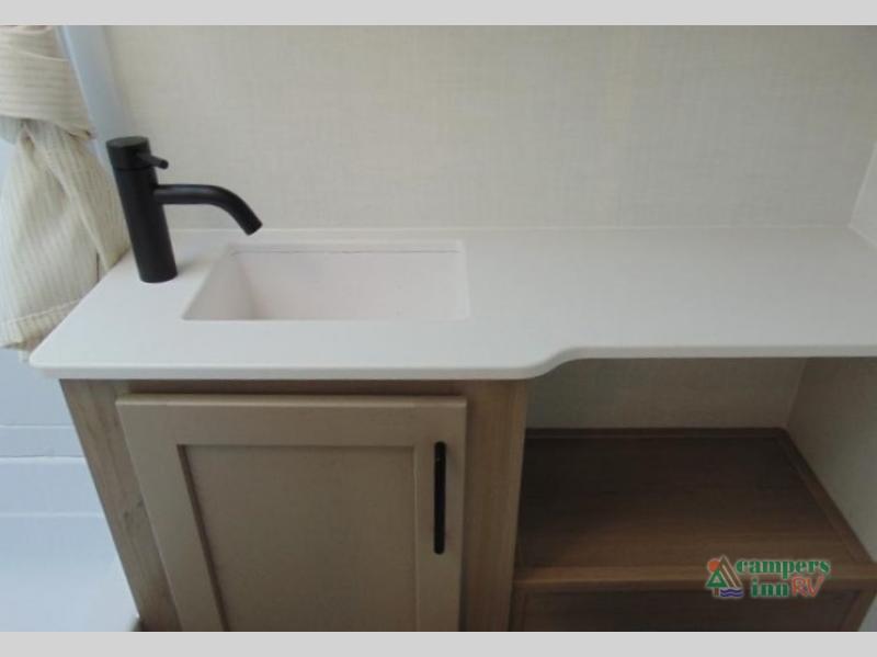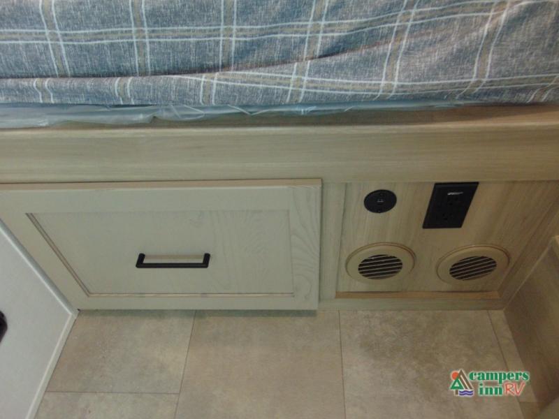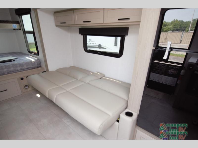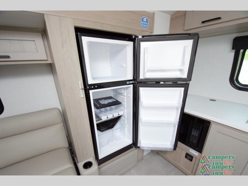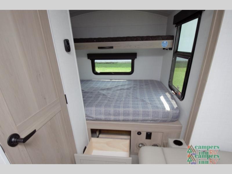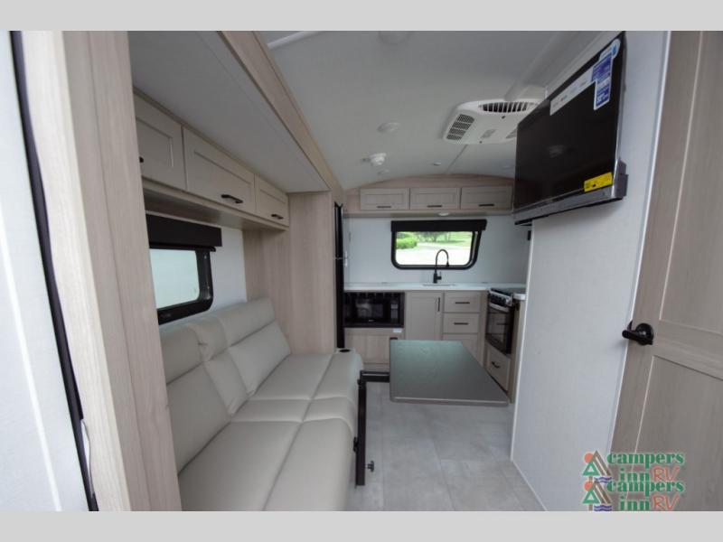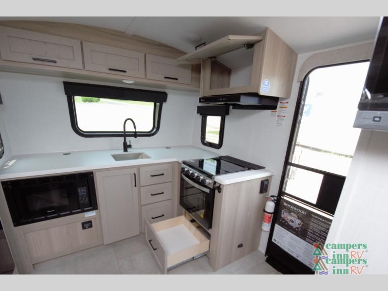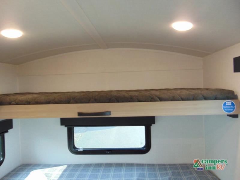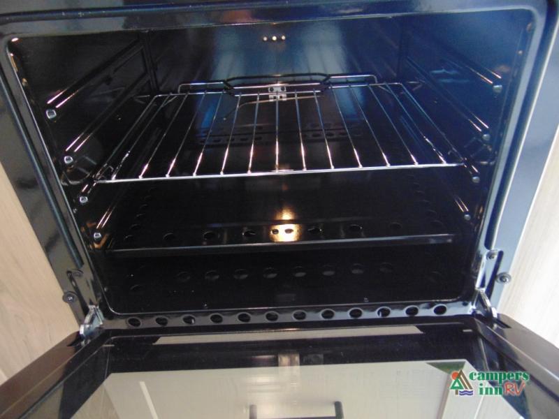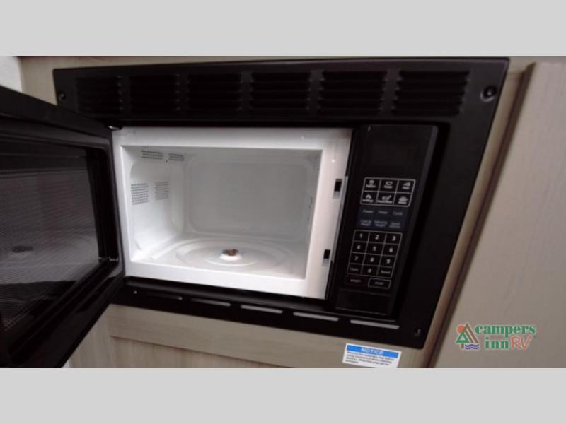 Are you looking for a lightweight trailer with at-home comforts? Take a look at this single slide out unit that can sleep three to four each night. There is a queen-size bed in the back with a 26" x 80" flip-up bunk for cozy sleeping space, a 72" sofa with cupholders to relax on, plus a 32" 12V TV for movie nights! The front kitchen includes a 12V refrigerator to store food, plus a microwave oven and a gas oven to cook meals each day.