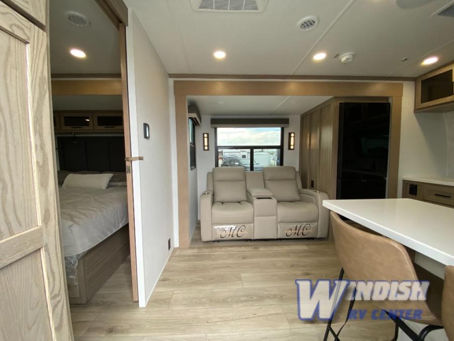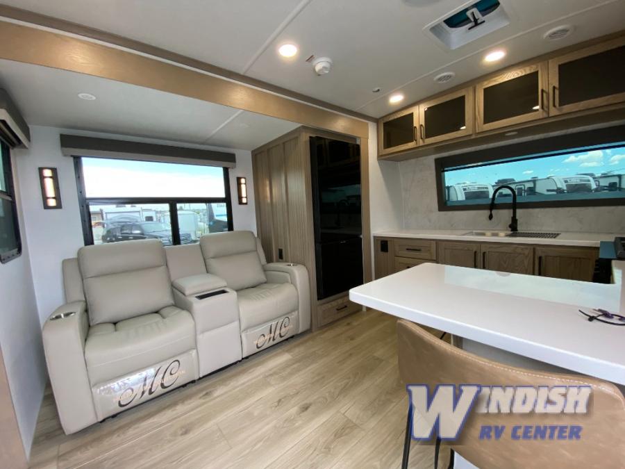 This front kitchen, couple's trailer is ready for adventure when you are! Once you arrive at your destination, prepare a quick lunch on the outside griddle, and enjoy the shade provided by the 19' power awning. You can eat outside, or inside at the counter with stools. The theatre seat will make this travel trailer feel more like home, and the double slides provide more space to stretch out. Within the master bedroom you'll find a king bed, a large wardrobe and a dresser, plus an optional TV. And check out the full rear bath with dual bath sinks and a shower with a seat! Now, that's what I call comfort!