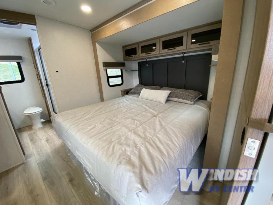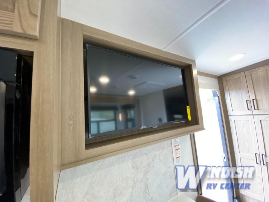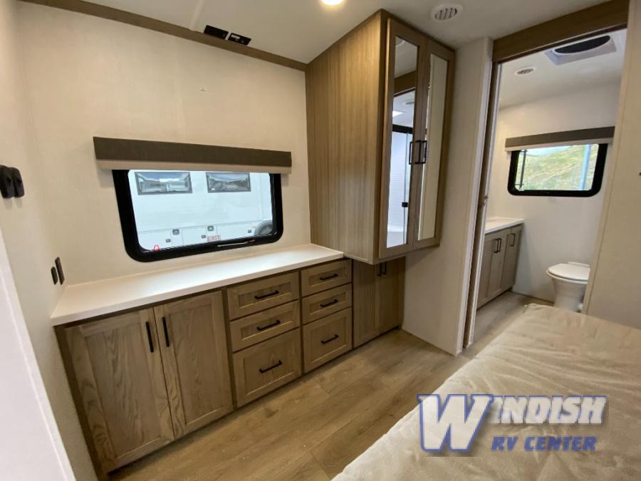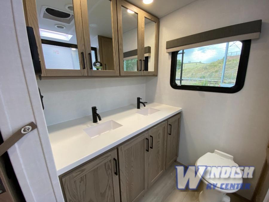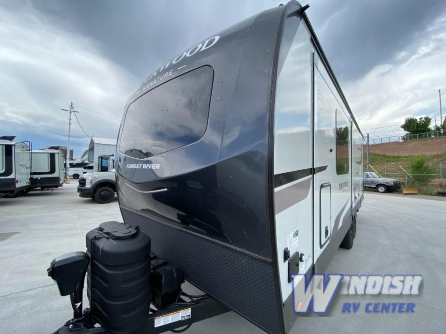 With any Rockwood Signature fifth wheel or travel trailer by Forest River RV, you will enjoy superior construction that includes laminated white fiberglass sidewalls, a radius roof with vaulted interior ceilings, plus radiant foil insulation and an enclosed underbelly for use in all types of weather. Some convenient exterior features include Keyed Alike locks, a rear ladder, a 200W solar panel, and a tire pressure monitor system with a monitor for added safety.  The interior offers a One Touch OneControl panel with WeRV app control, for lights, awning, slides, water heater and more, and the Air 360+ omnidirectional antenna with WiFi prep lets you work while away from home if needed. You will also appreciate the interior vaulted ceilings, residential soft close doors and drawers, solid surface kitchen countertops, and designer kitchen backsplash!